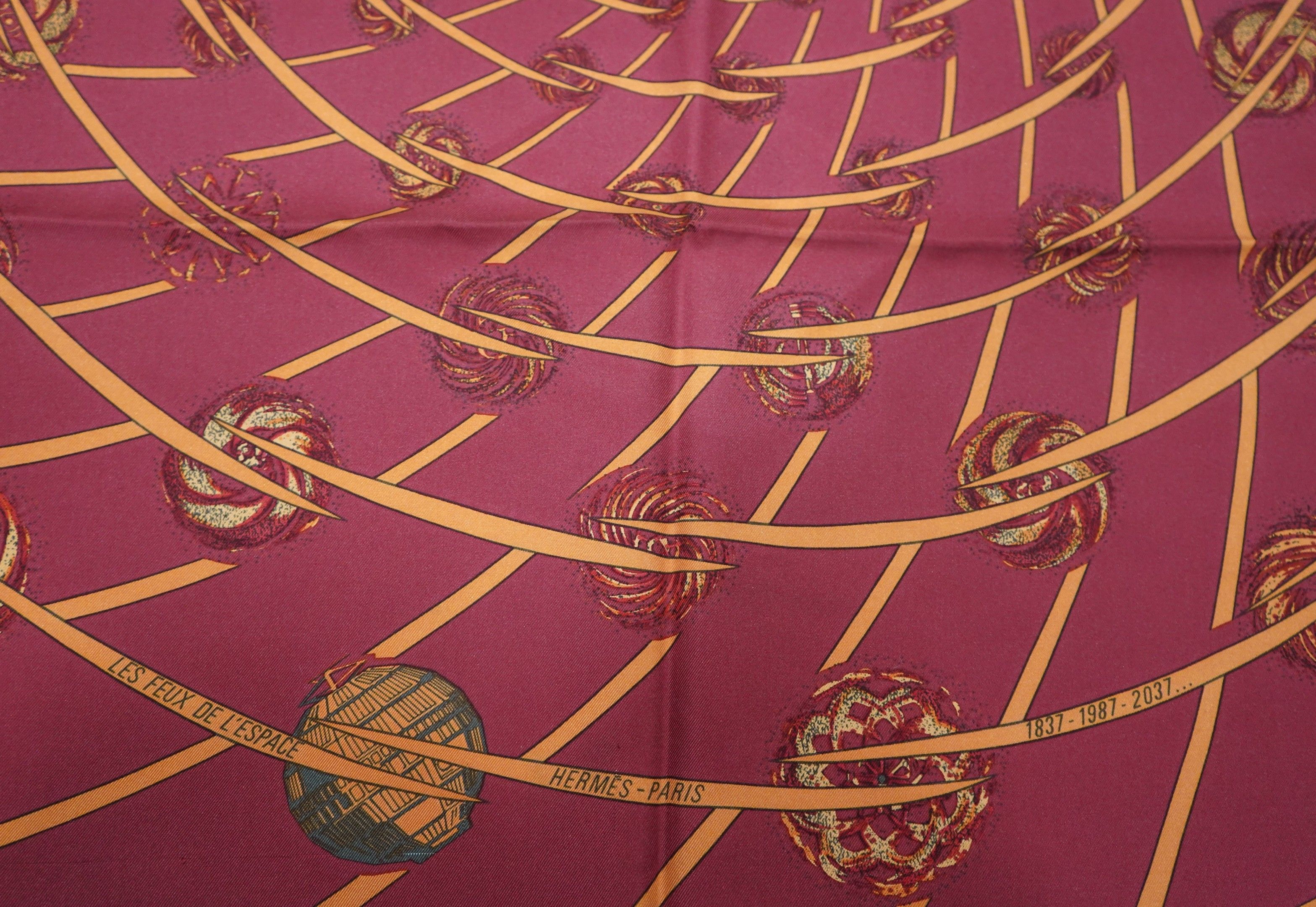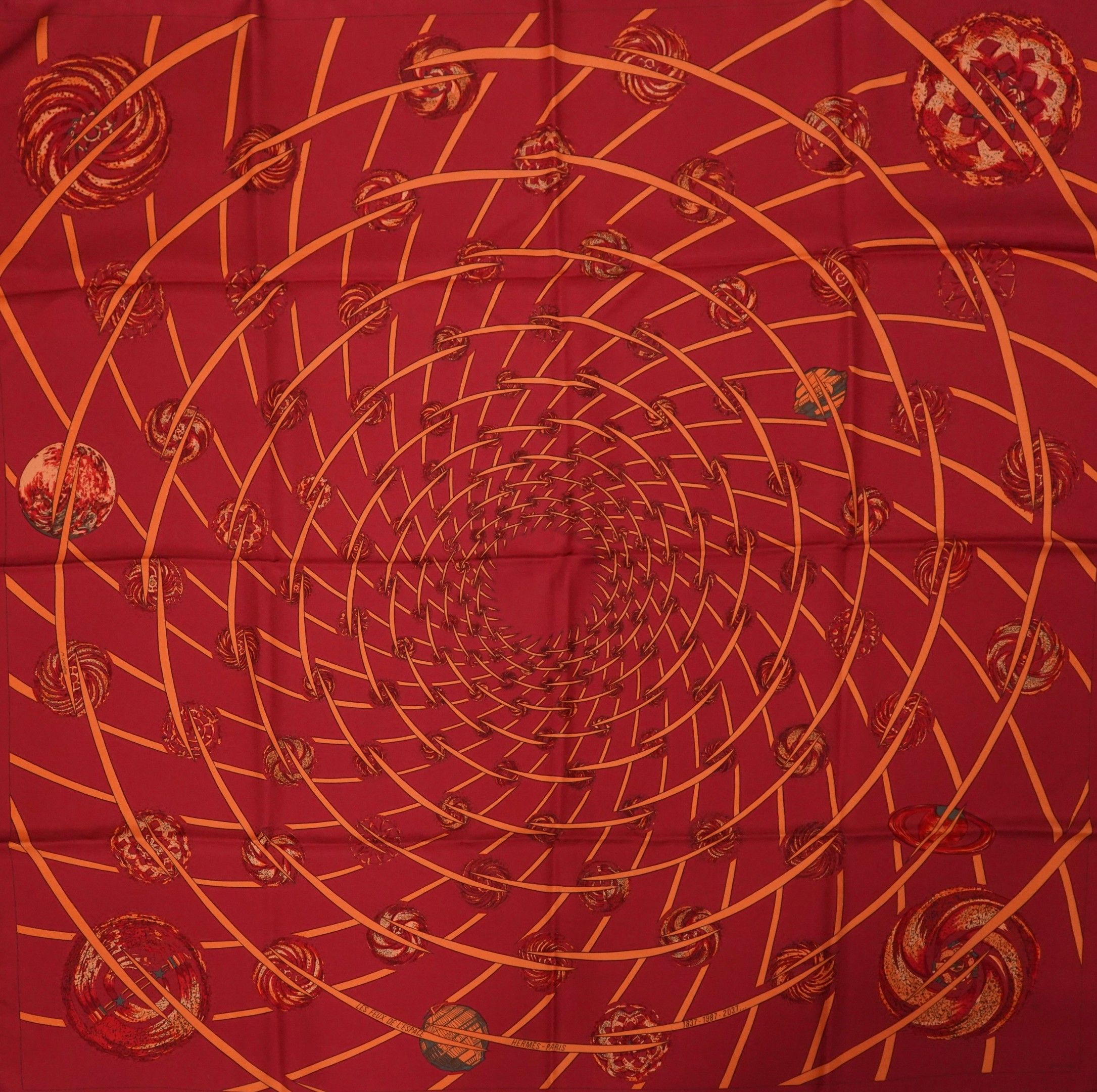 Carré 90 en twill de soie "Les feux de l'espace", signé M Duchêne, fond rouge