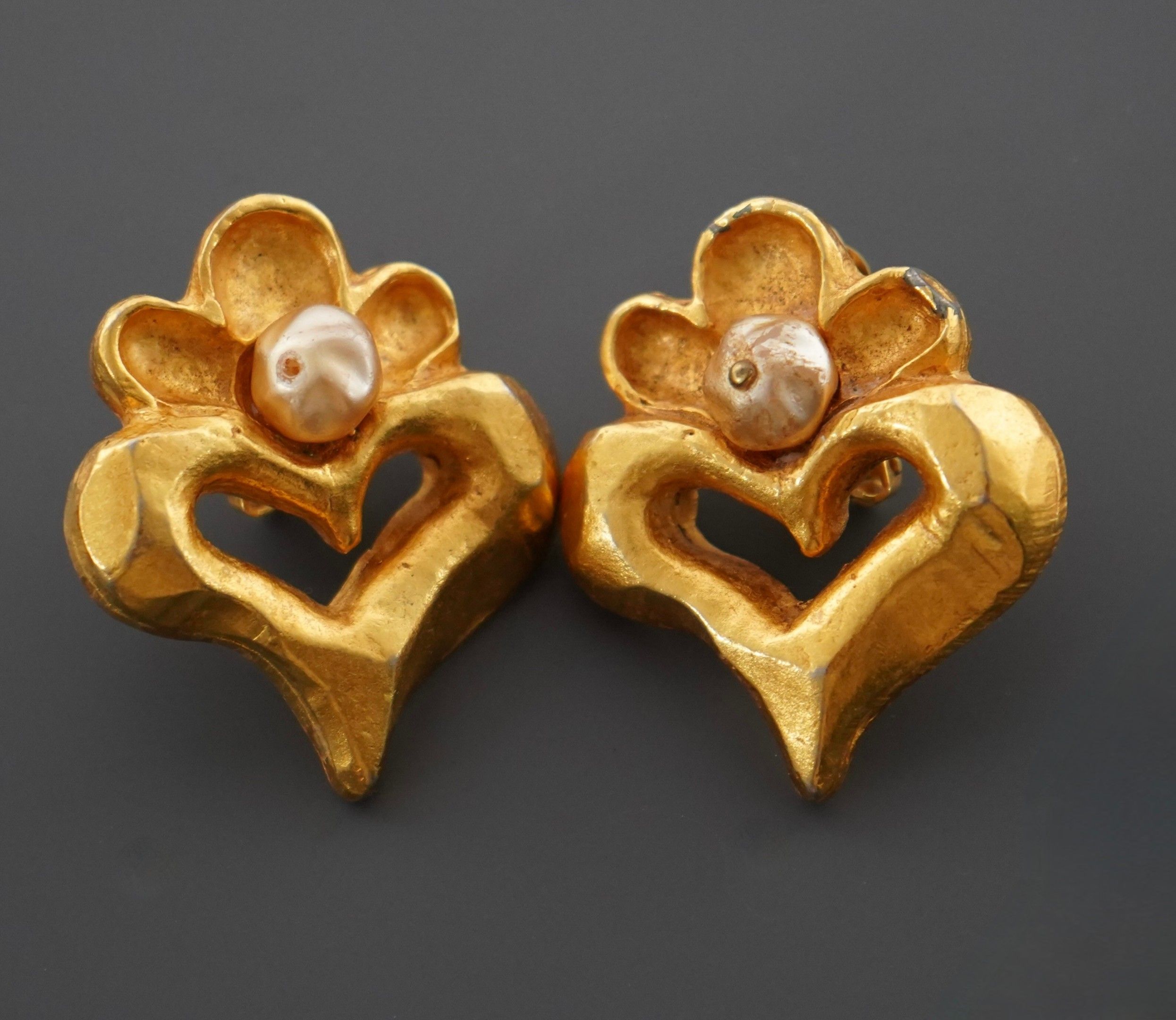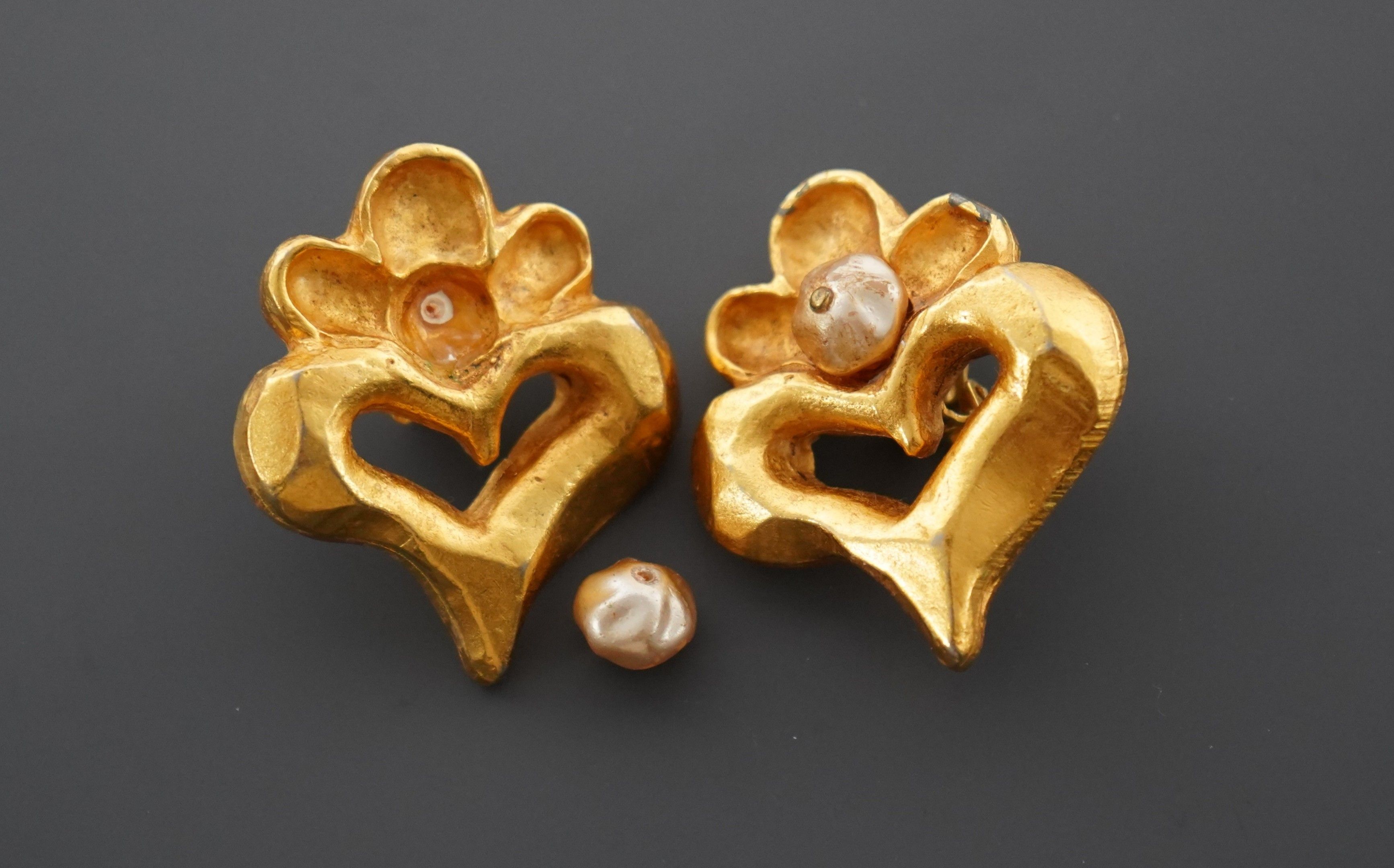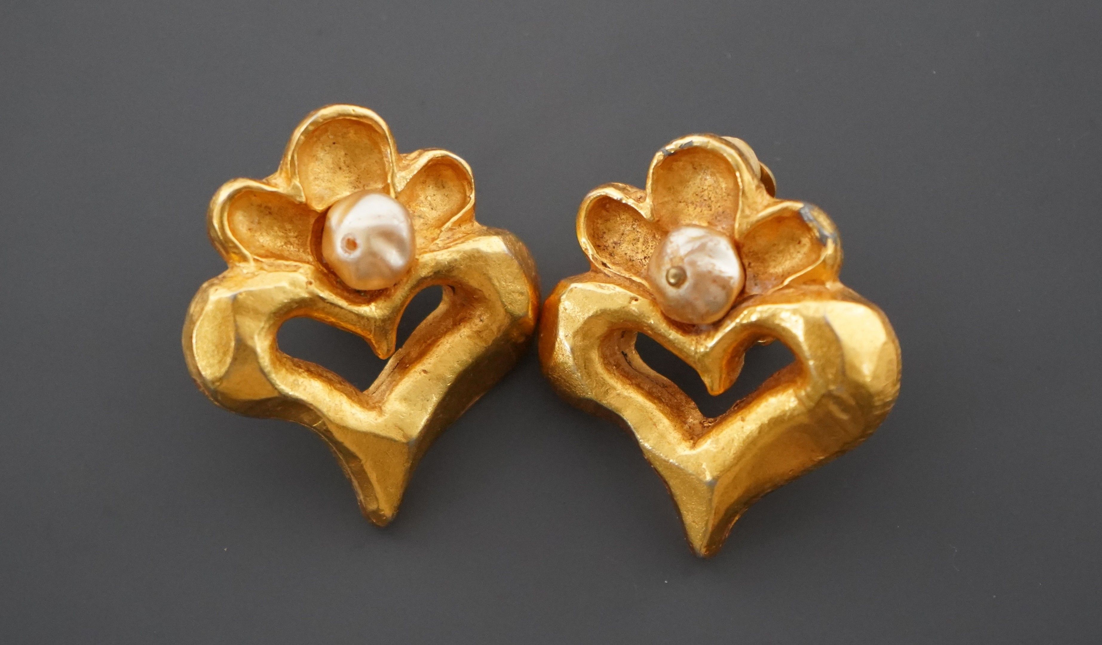 Paire de clips d'oreilles en métal doré et perle fantaisie formant une fleur cœur.