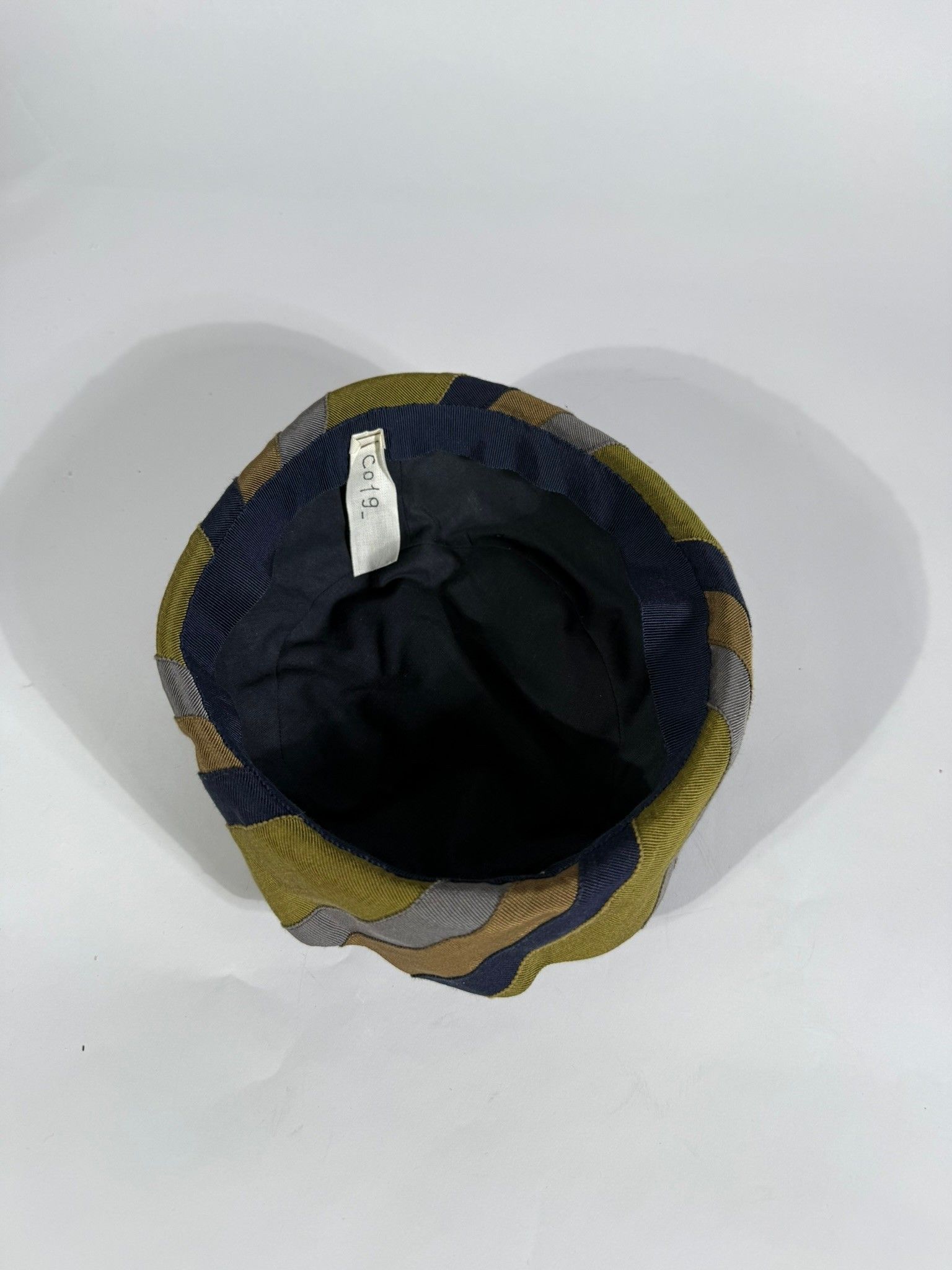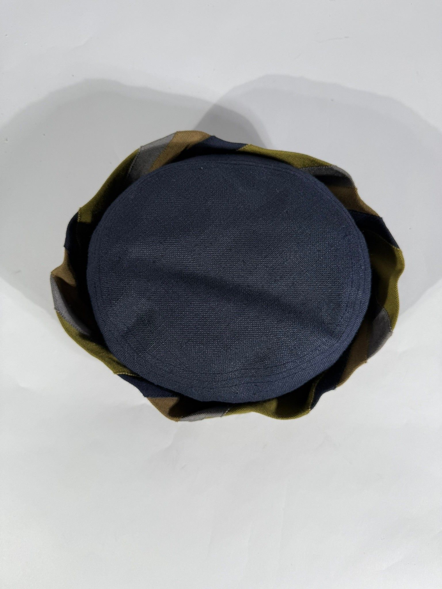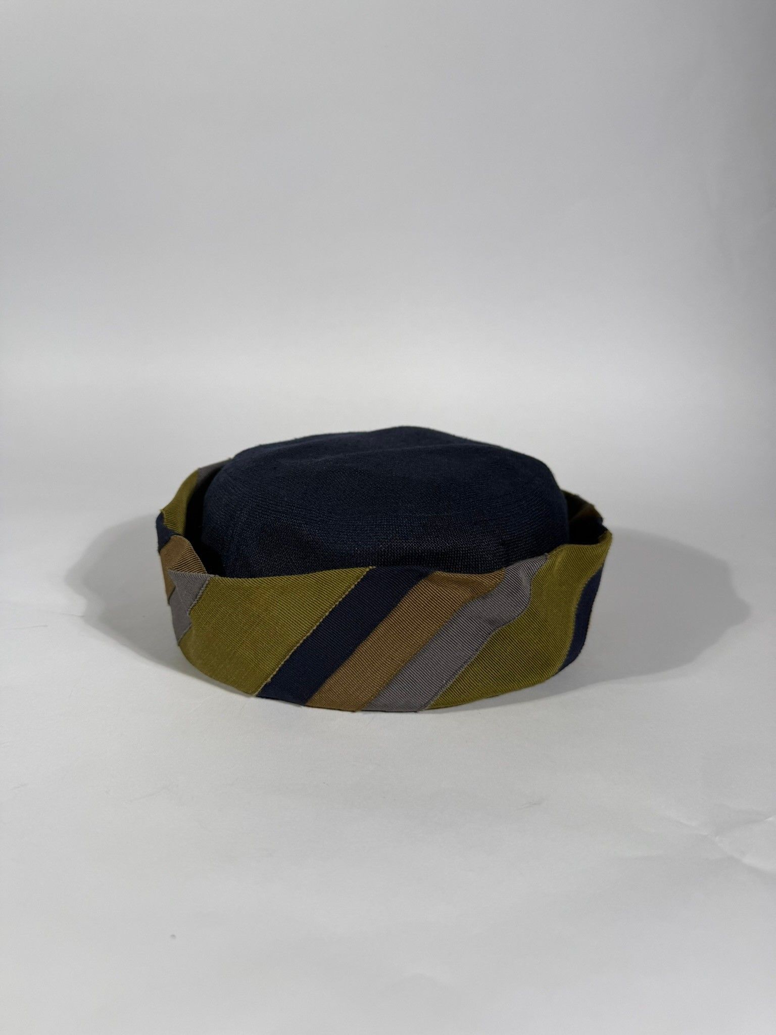 Petit chapeau en toile marine et revers de gros grain brun, vert, marine. Porte un bolduc de défilé