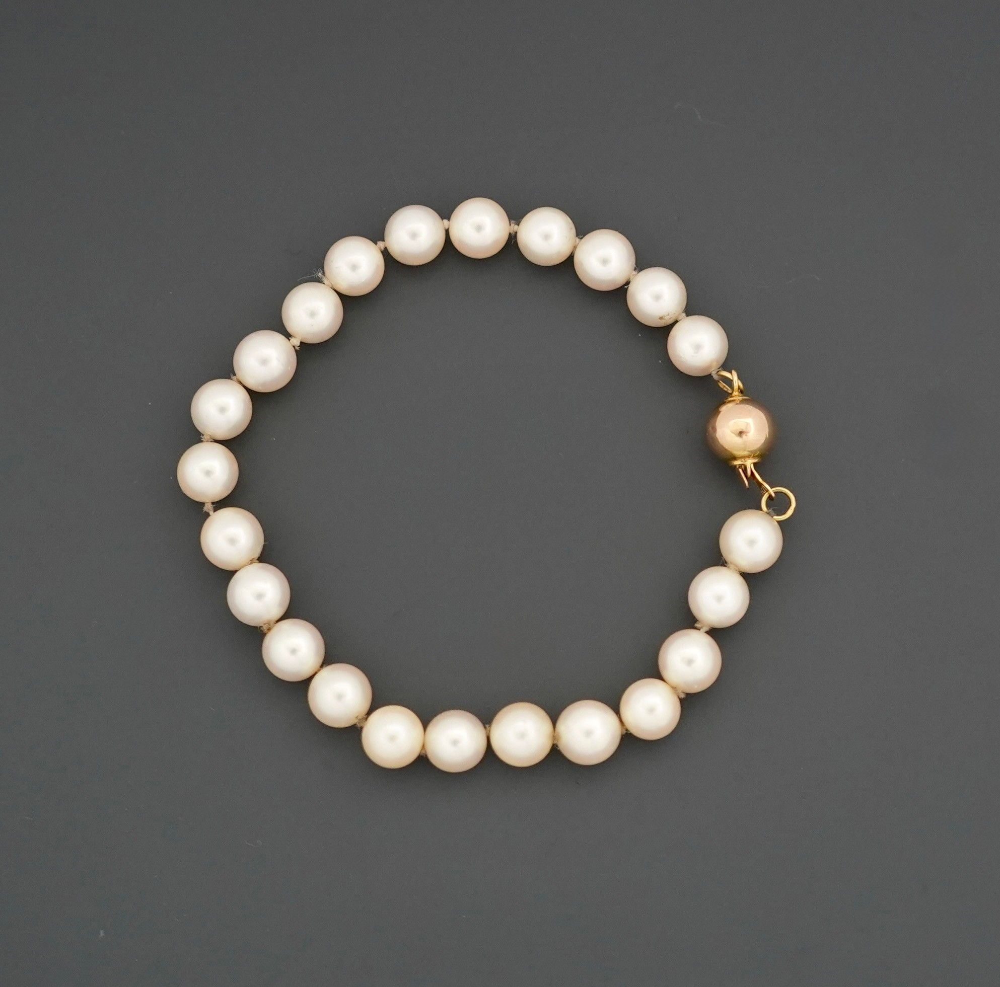 Bracelet en perles de culture de 6,7 mm de moyenne, le fermoir en or jaune 14K 585 millièmes de forme boule à cliquet.