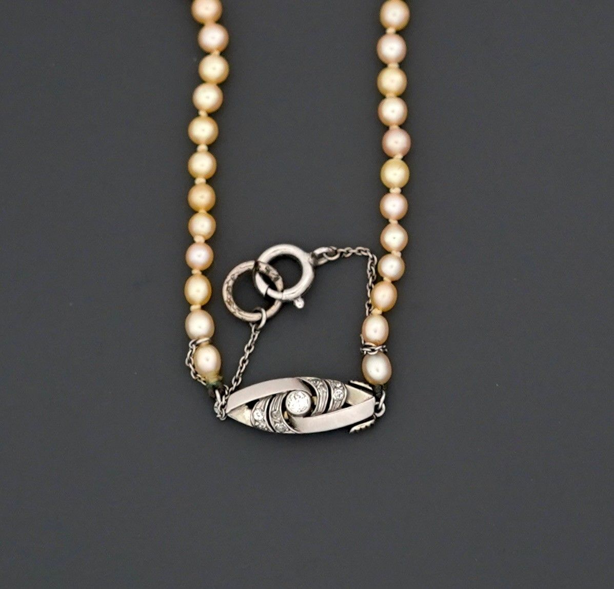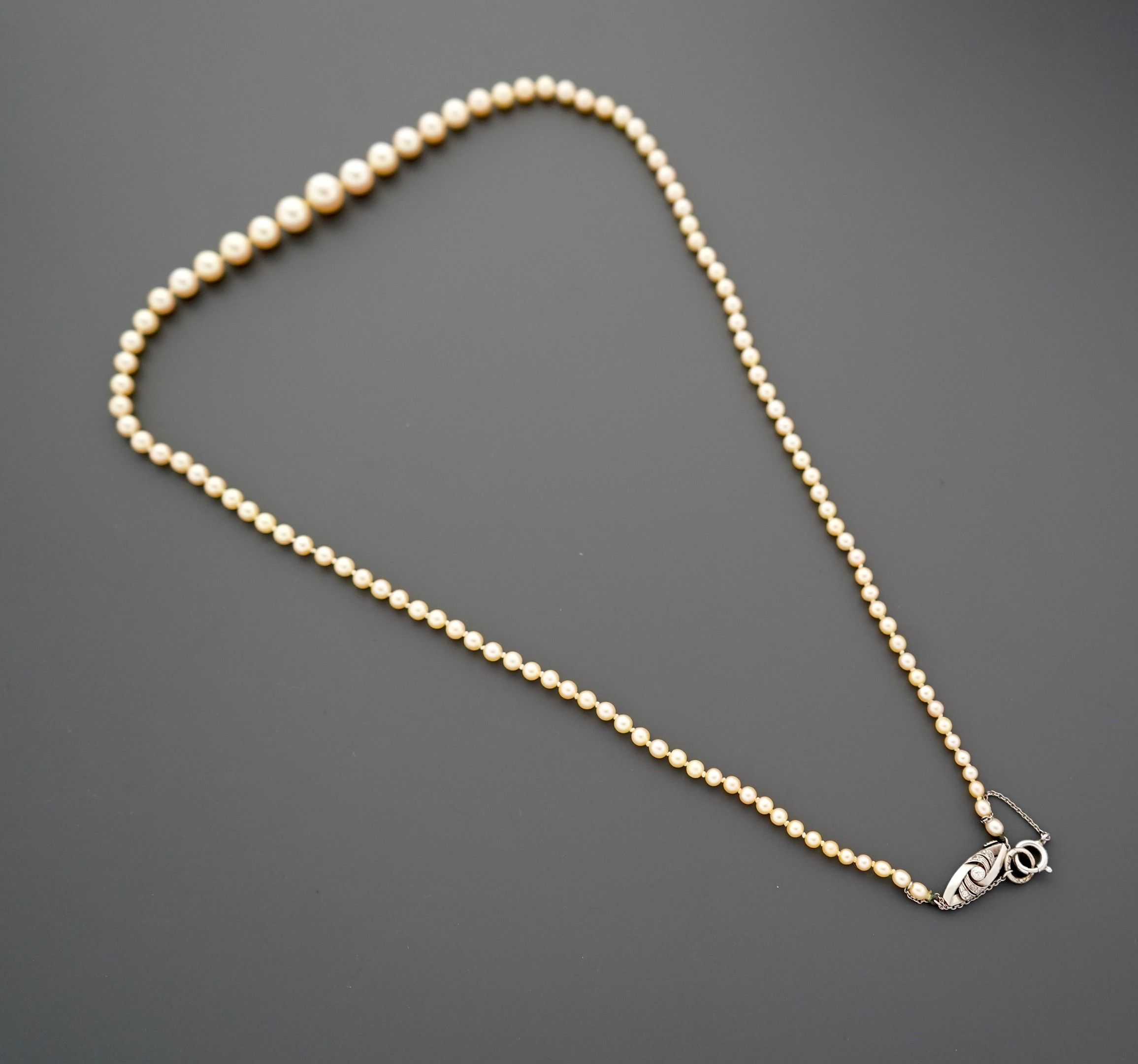 Collier de perles de culture en chute, allant de 3 mm à 8,5 mm, le fermoir à cliquet de forme amande tourbillonnante en or gris 18K 750 millièmes, piqué de diamants de tailles moderne et ancienne, chaînette de sécurité.