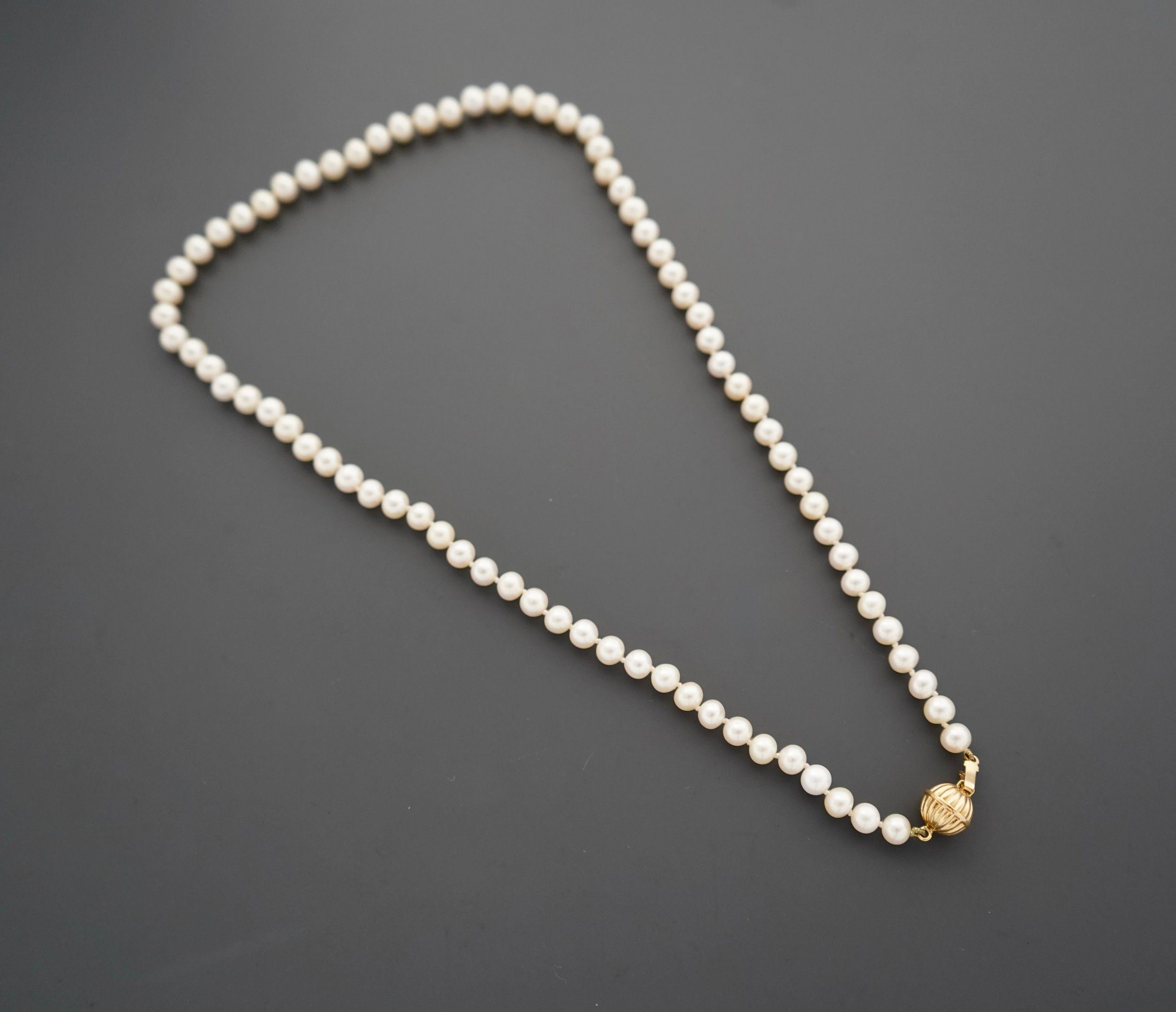 Collier de perles de culture de 5 mm, le fermoir cliquet à boule melonné en or jaune 18K 750 millièmes.