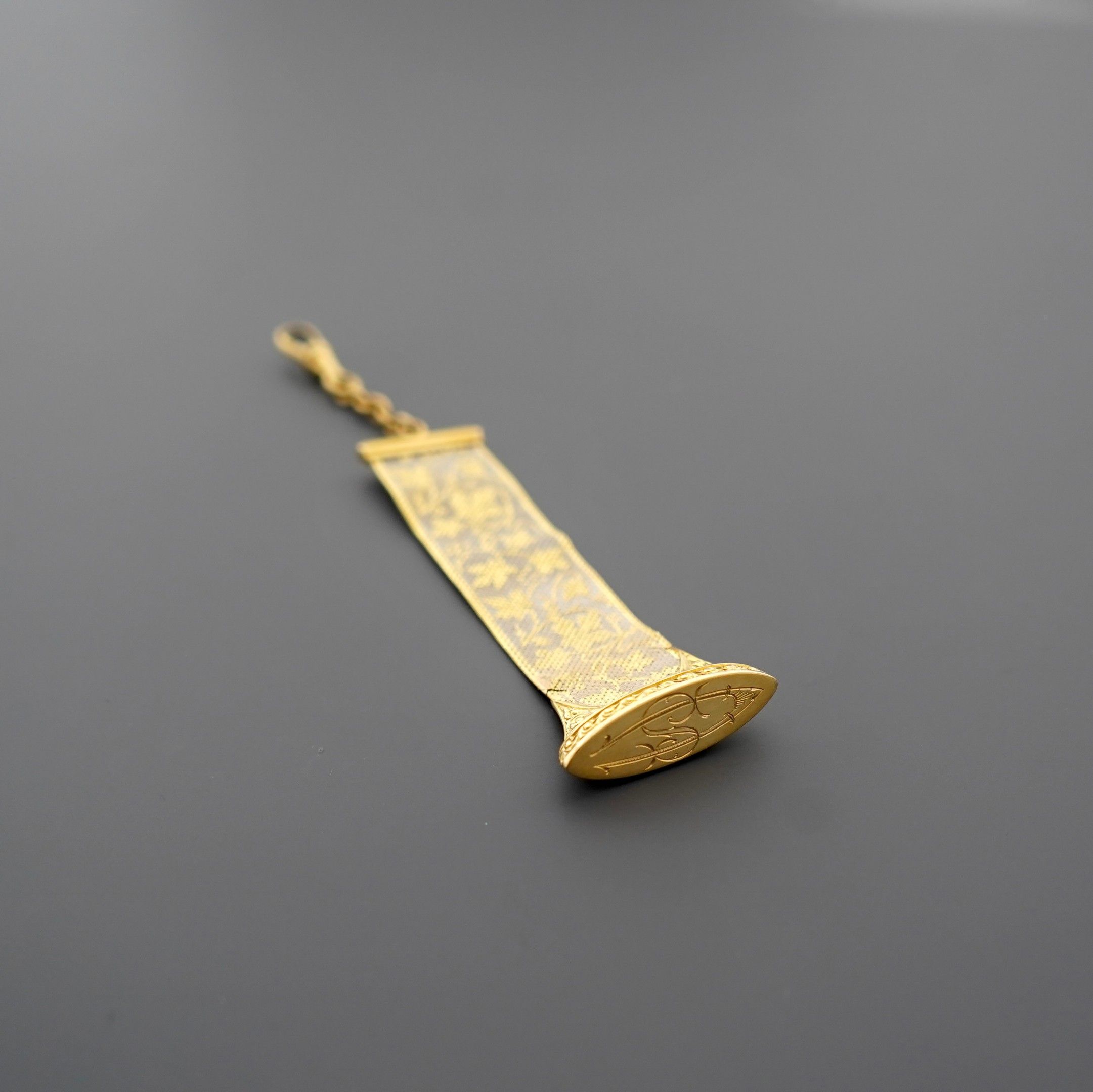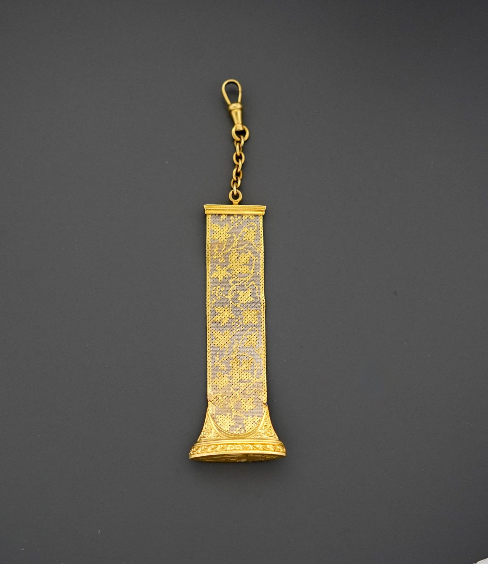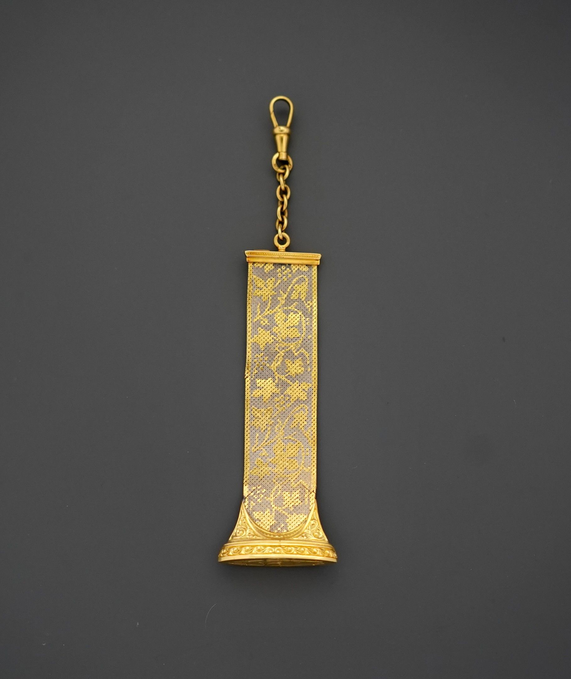 Elément de chatelaine en deux tons d'or gris et jaune 18K 750 millièmes, en tissu d'or à décor de feuilles de vigne et de grappes de raisins, la base de forme ovale ciselée de feuilles, le cachet chiffré CS, le fermoir mousqueton.