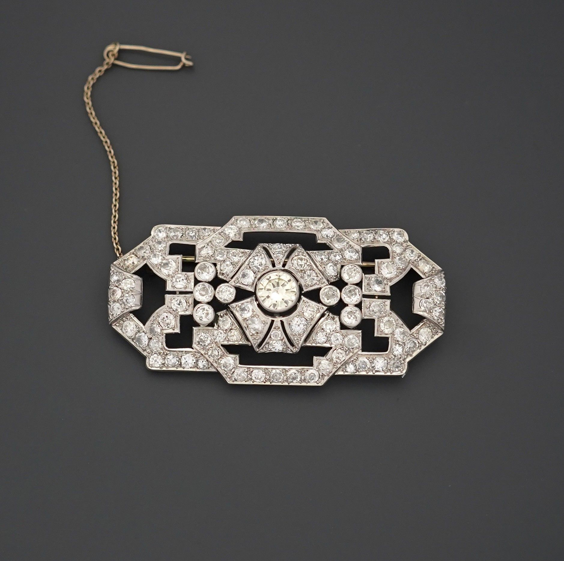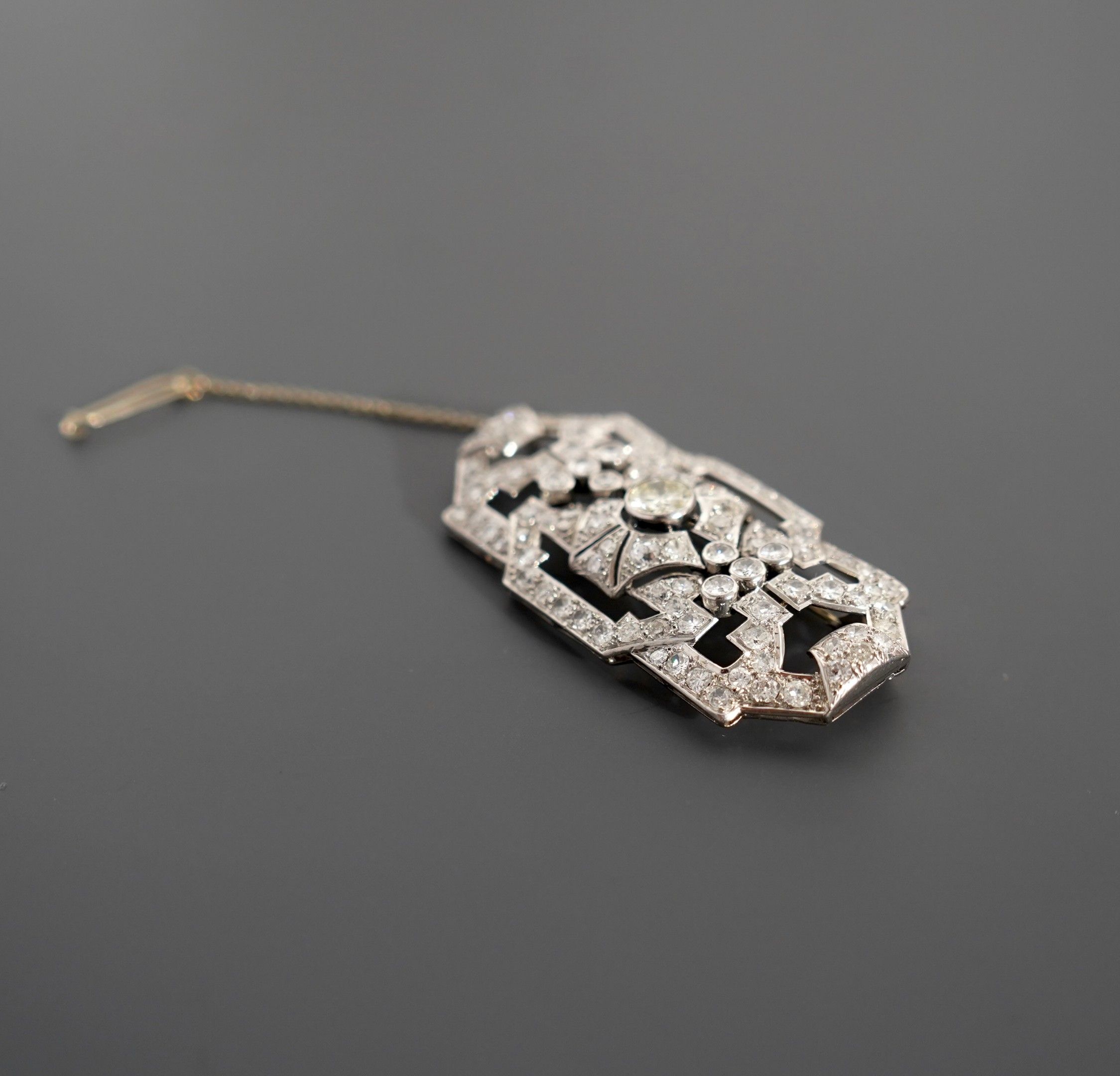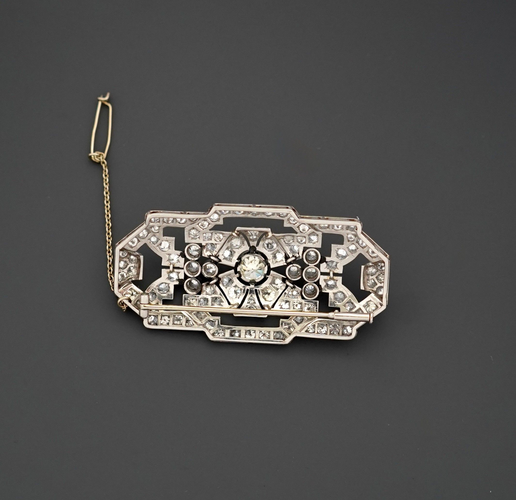 Broche plaque d'époque Art Déco en platine 850 millièmes et or gris 18K 750 millièmes, de forme octogonale allongée en gradin, centrée d'un diamant de taille Old European Cut d'environ 1 carat en serti clos dans un motif central étoilé, ceint dans un entourage géométrique ajouré de 104 diamants de taille ancienne en serti grain.