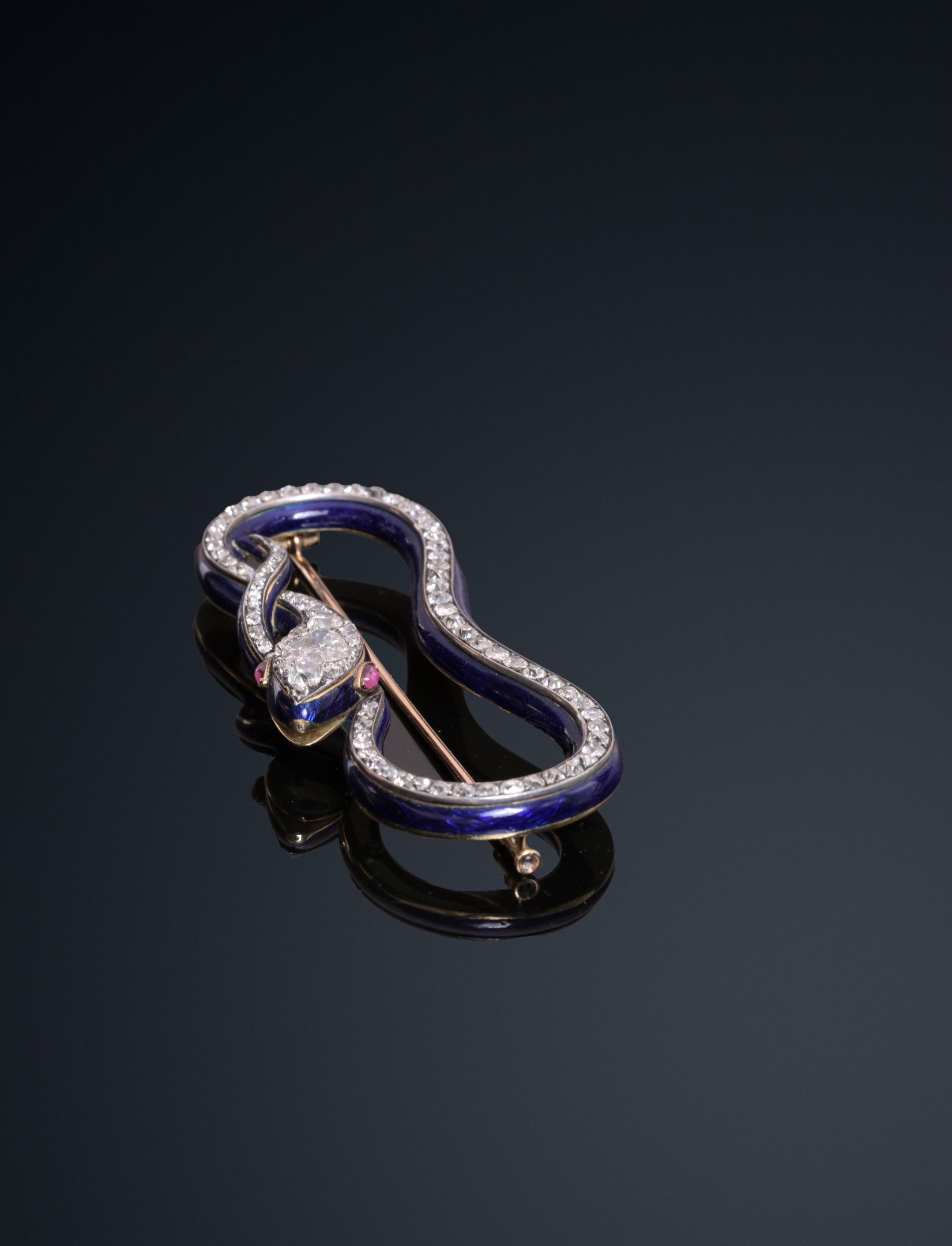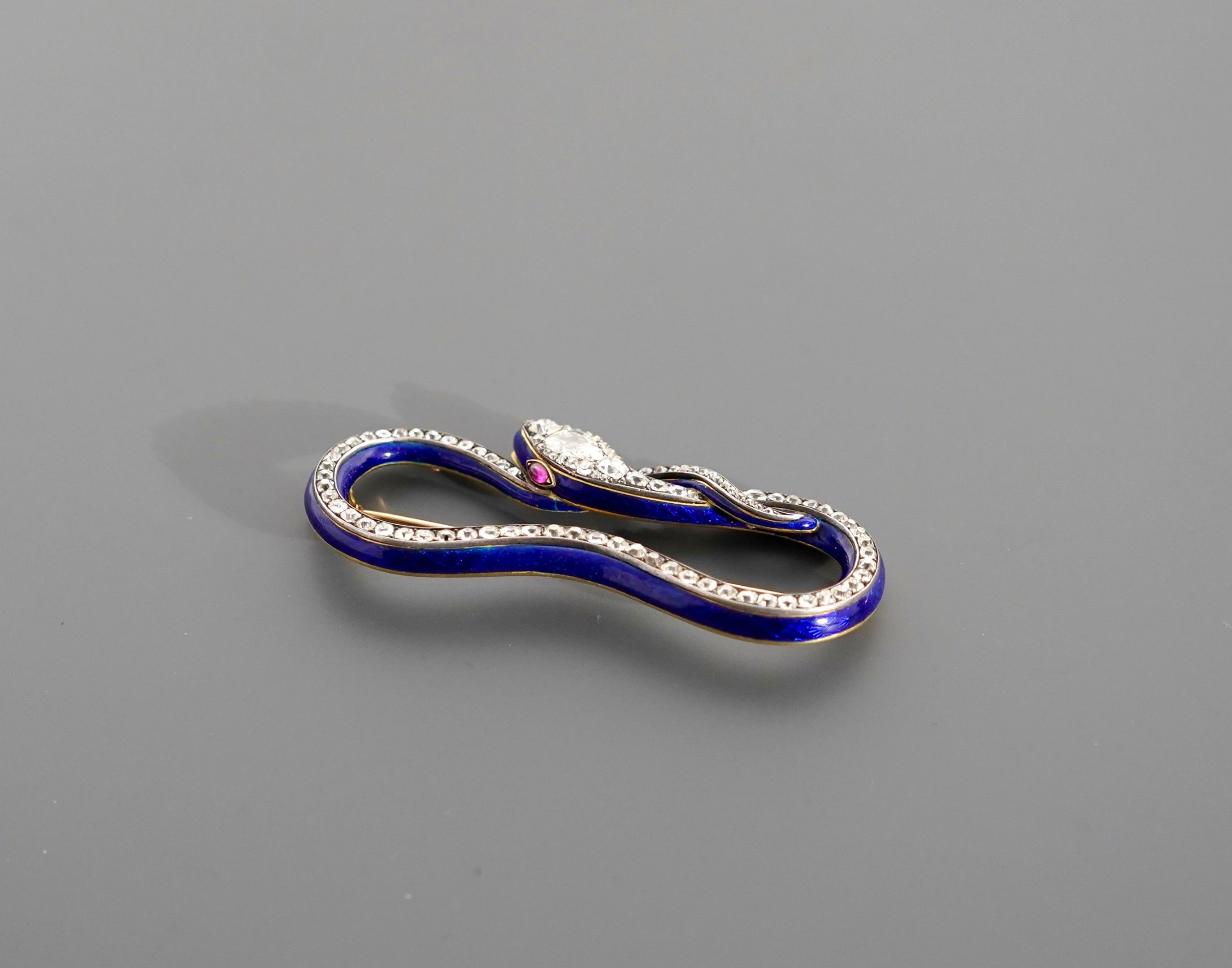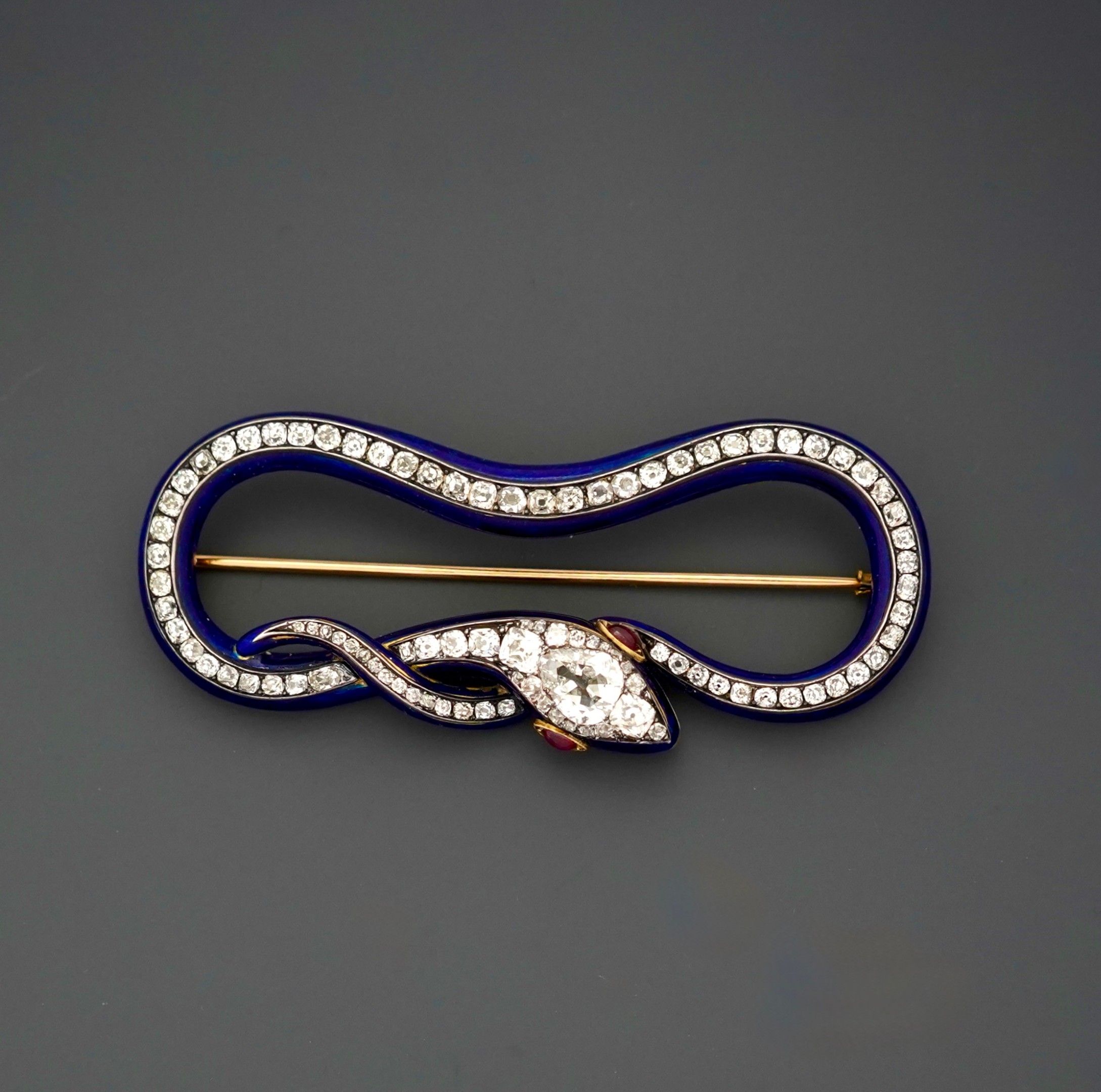 Exceptionnelle et ravissante grande broche en or jaune 18K 750 millièmes et argent supérieur à 800 millièmes, présentant un serpent au corps dessinant le signe de l'infini, celui-ci intégralement émaillé de bleu roi sur un guillochage évoquant ses écailles, l'arrête dorsale ornée de 63 diamants de taille ancienne en serti grain, la tête sertie de 26 diamants de taille ancienne, coussin et poire en serti grain, les yeux piqués de cabochons de rubis en serti griffe.