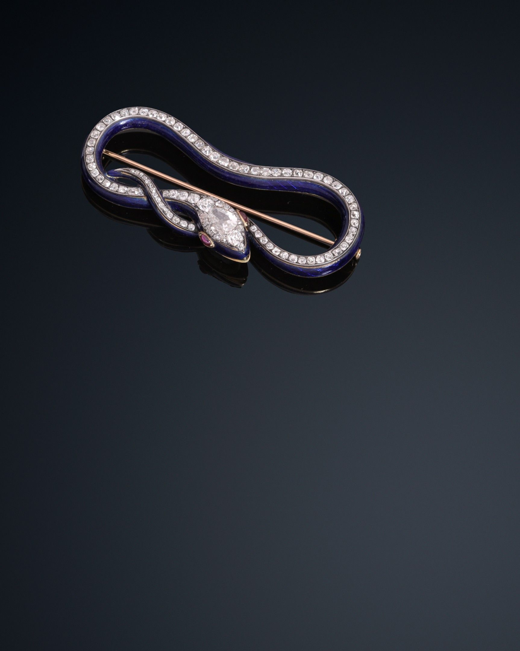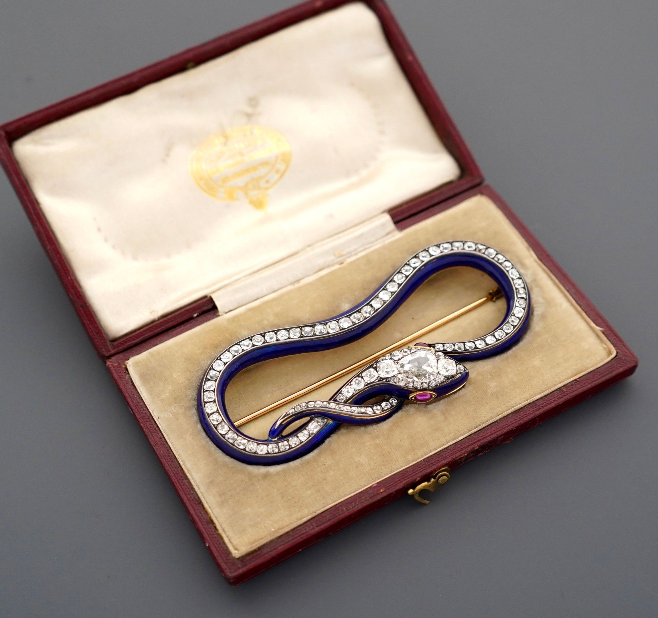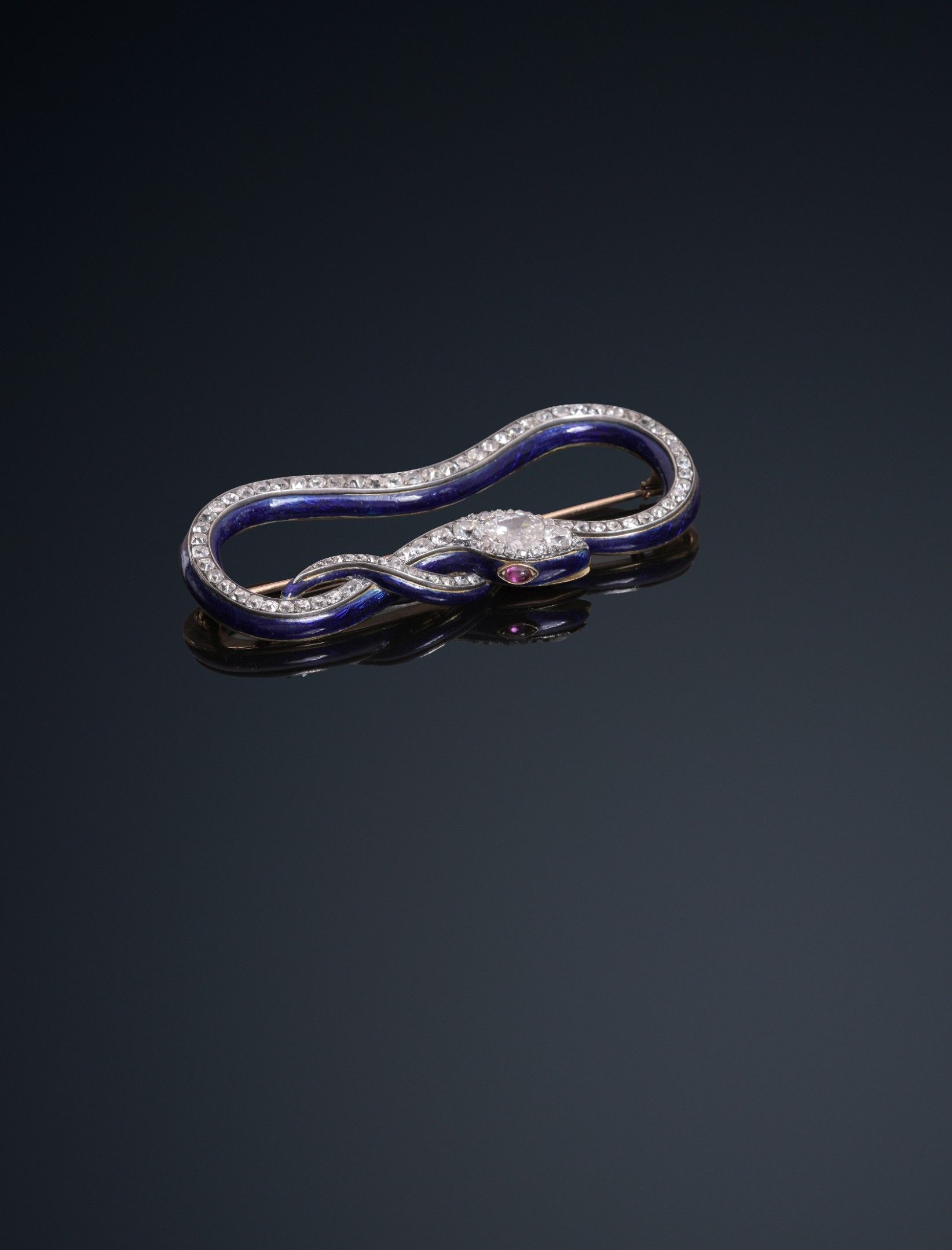 Exceptionnelle et ravissante grande broche en or jaune 18K 750 millièmes et argent supérieur à 800 millièmes, présentant un serpent au corps dessinant le signe de l'infini, celui-ci intégralement émaillé de bleu roi sur un guillochage évoquant ses écailles, l'arrête dorsale ornée de 63 diamants de taille ancienne en serti grain, la tête sertie de 26 diamants de taille ancienne, coussin et poire en serti grain, les yeux piqués de cabochons de rubis en serti griffe.