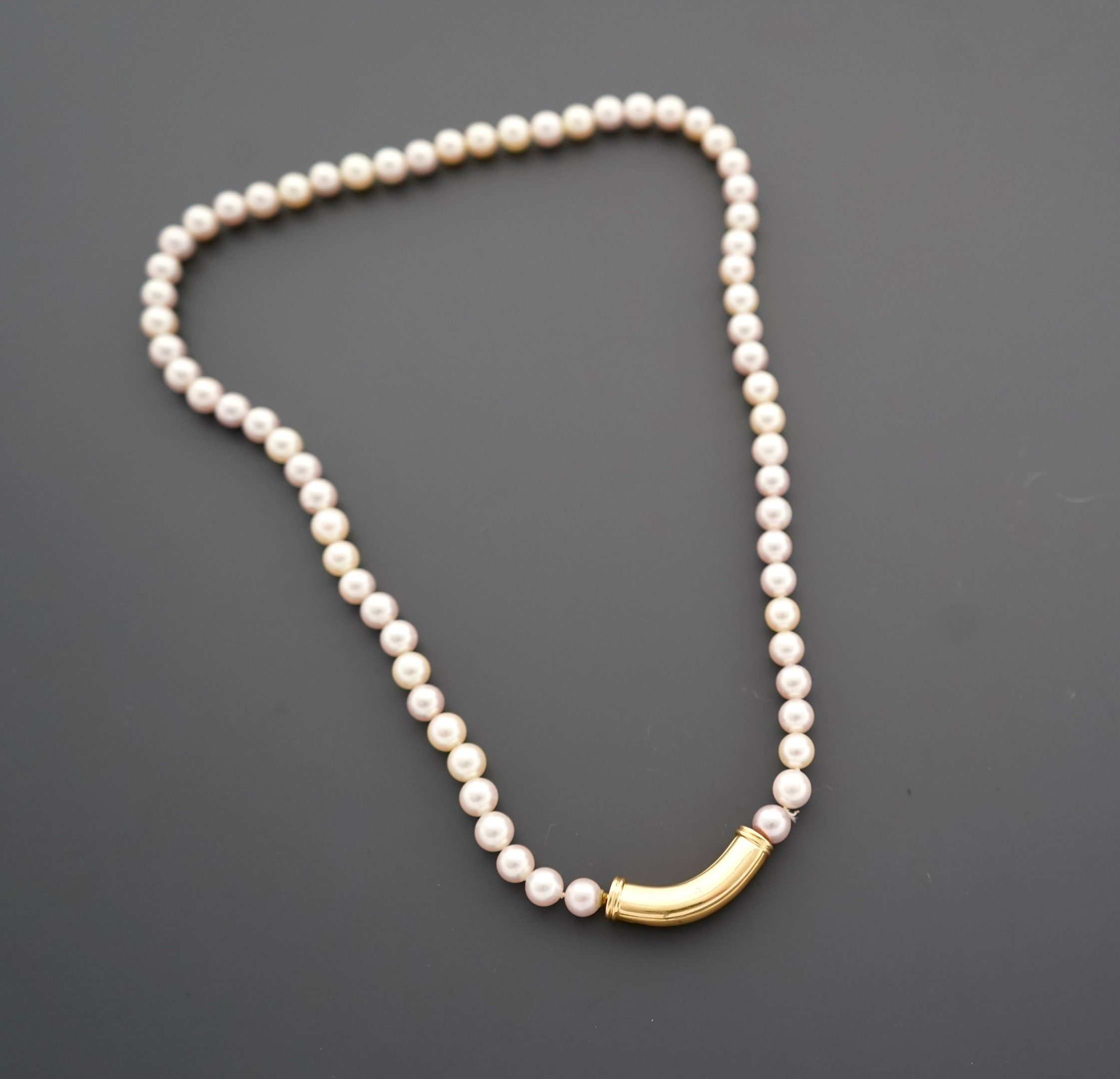 Collier de perles de culture de 7,3 mm de moyenne environ, de couleur crème à reflets rosés, le fermoir de forme boomerang en or jaune 18K 750 millièmes mat et poli, ponctué de six diamants de taille moderne en serti masse, les extrémités godronnées, il s'ouvre par 1/4 de tour.