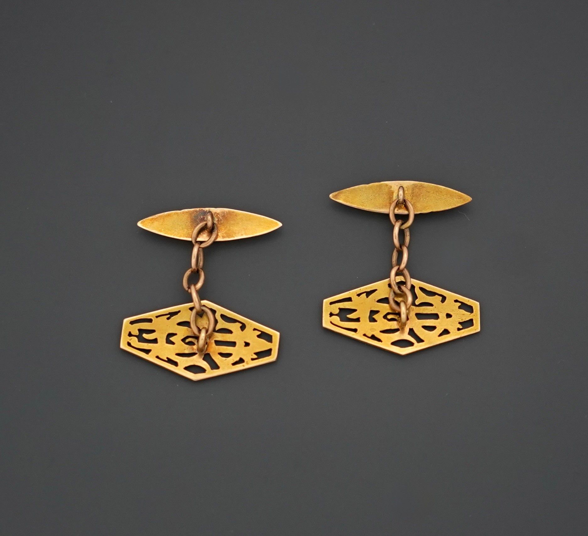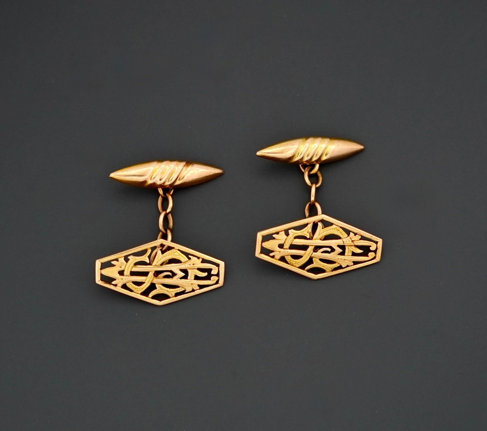 Paire de boutons de manchette en or jaune 18K 750 millièmes, un cartouche ajouré des lettres A S, retenant en chaînette un motif oblong torsadé.
