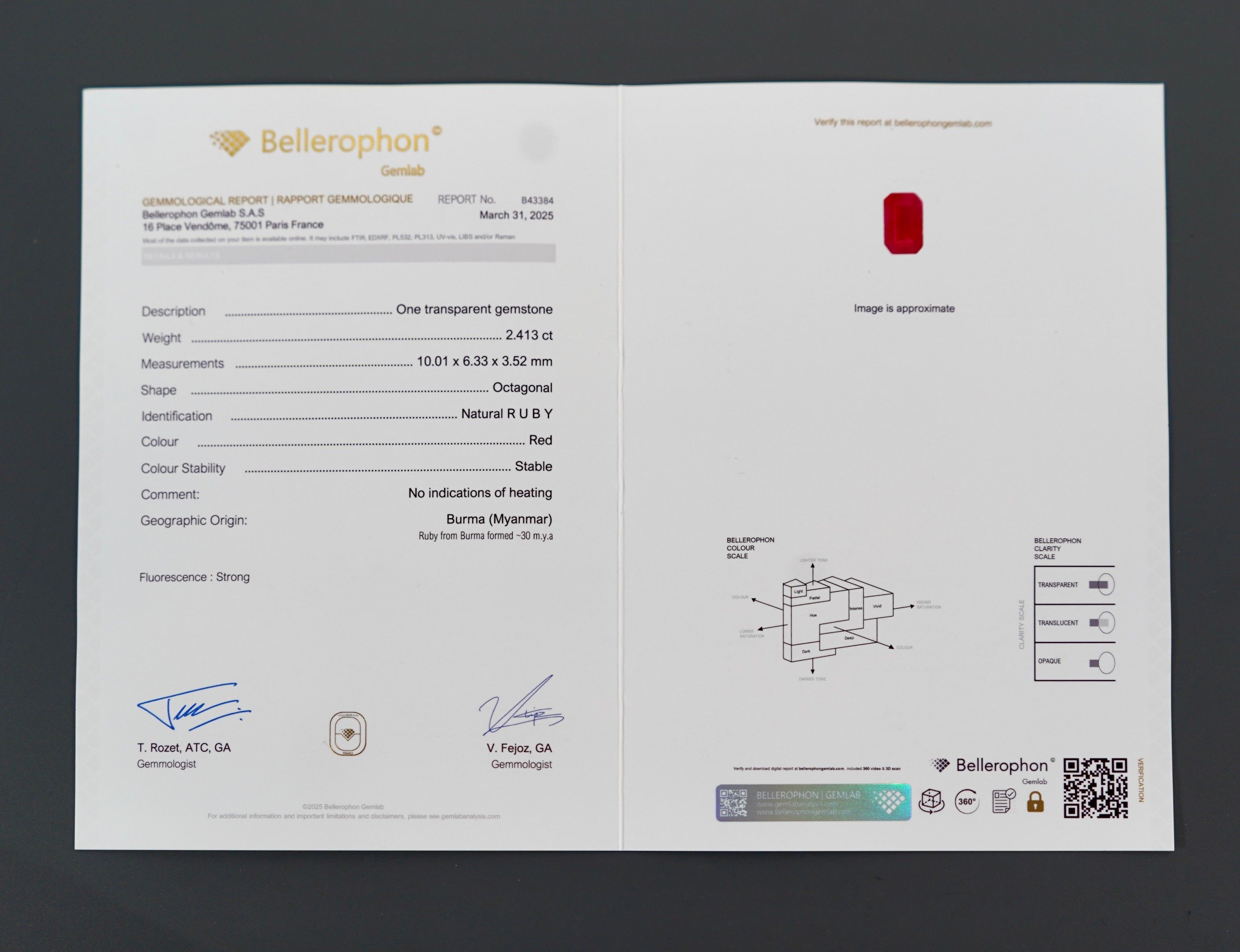 La pierre est accompagnée d'un certificat Bellerophon indiquant selon leur opinion :