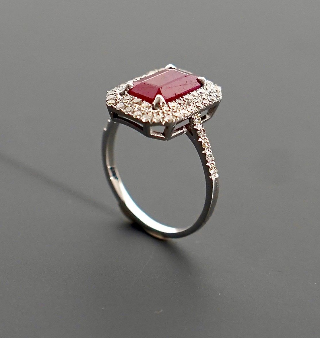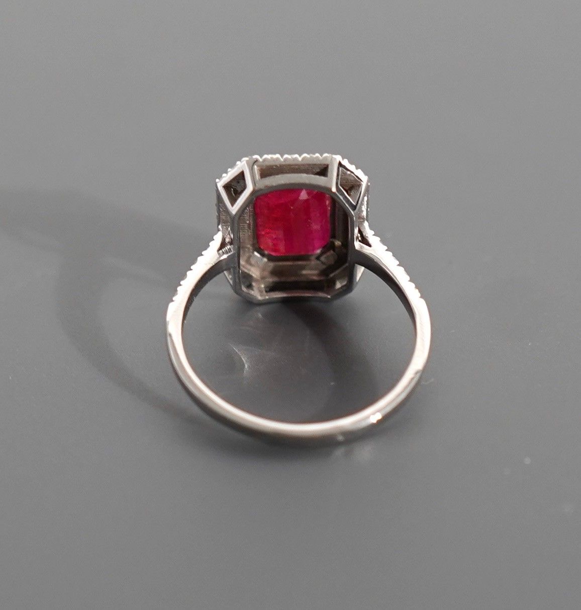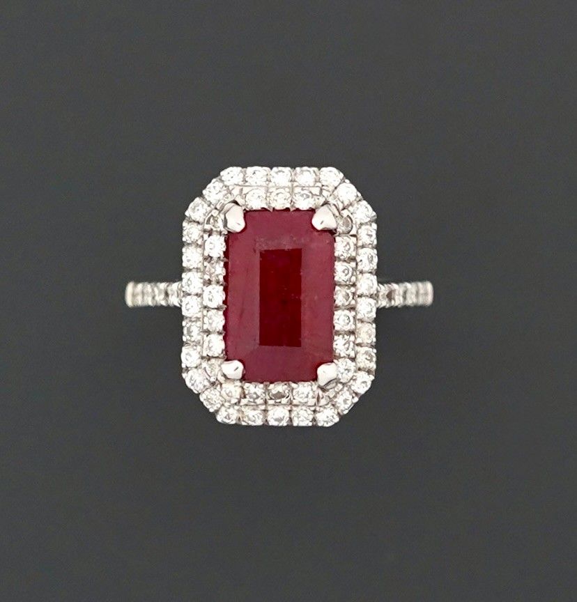 Bague en or gris 18K 750 millièmes ornée d'un rubis de taille rectangulaire à pans coupés de 2,4 carats en serti griffe, ceint d'une double ligne