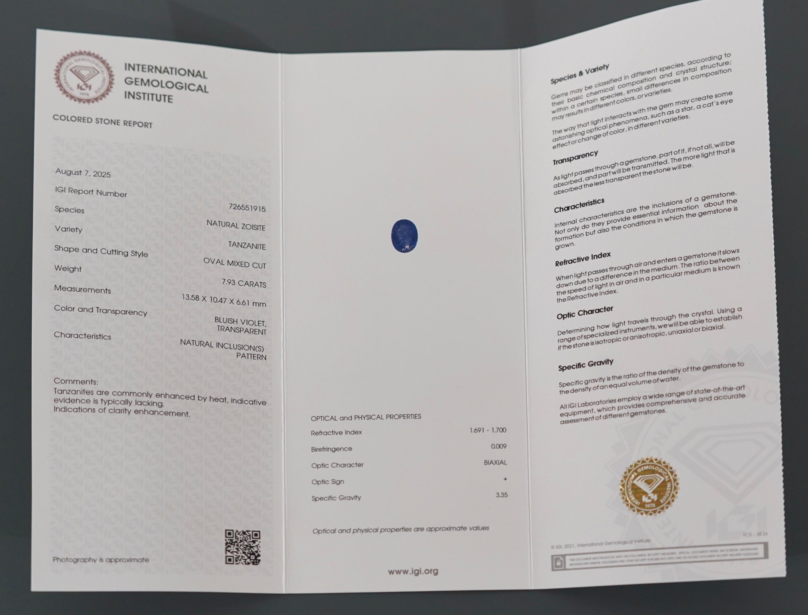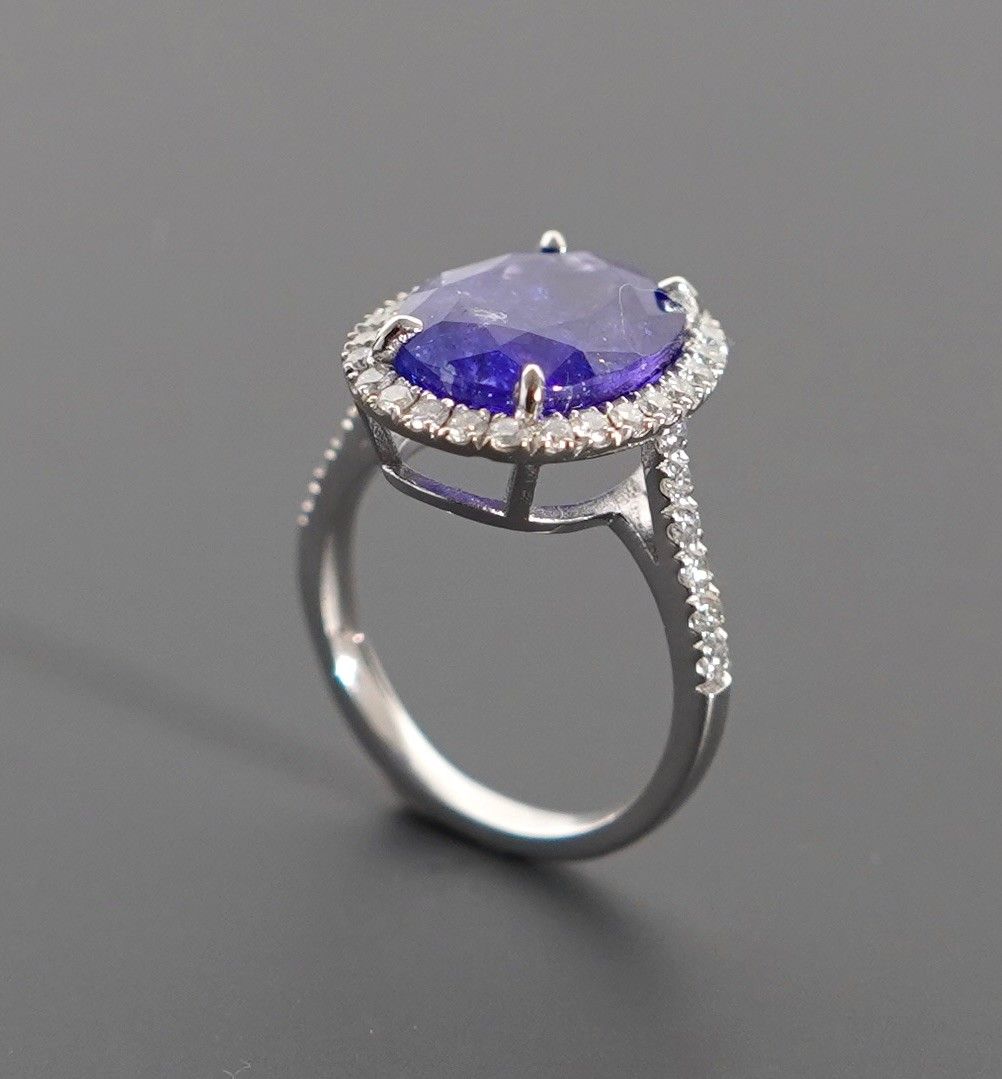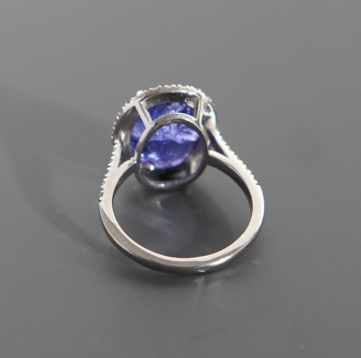 Bague en or gris 18K 750 millièmes ornée d'une tanzanite de taille ovale de 7,93 carats en serti griffe, ceinte d'une ligne de 25