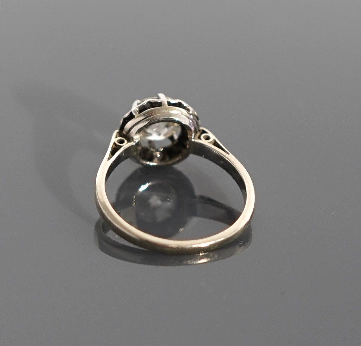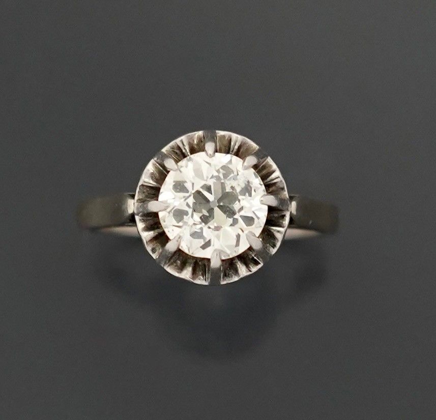Bague en or gris 18K 750 millièmes et platine 850 millièmes ornée d'un diamant de taille Old European Cut d'environ 1,70 carat en serti griffe sur illusion.