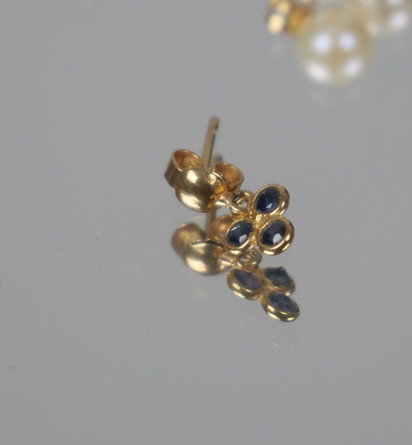 - Un élément de boucle d'oreille en or jaune 750 millièmes en forme de trèfle à trois feuilles serti de pierres bleues saphir. Poids brut :0,5 g