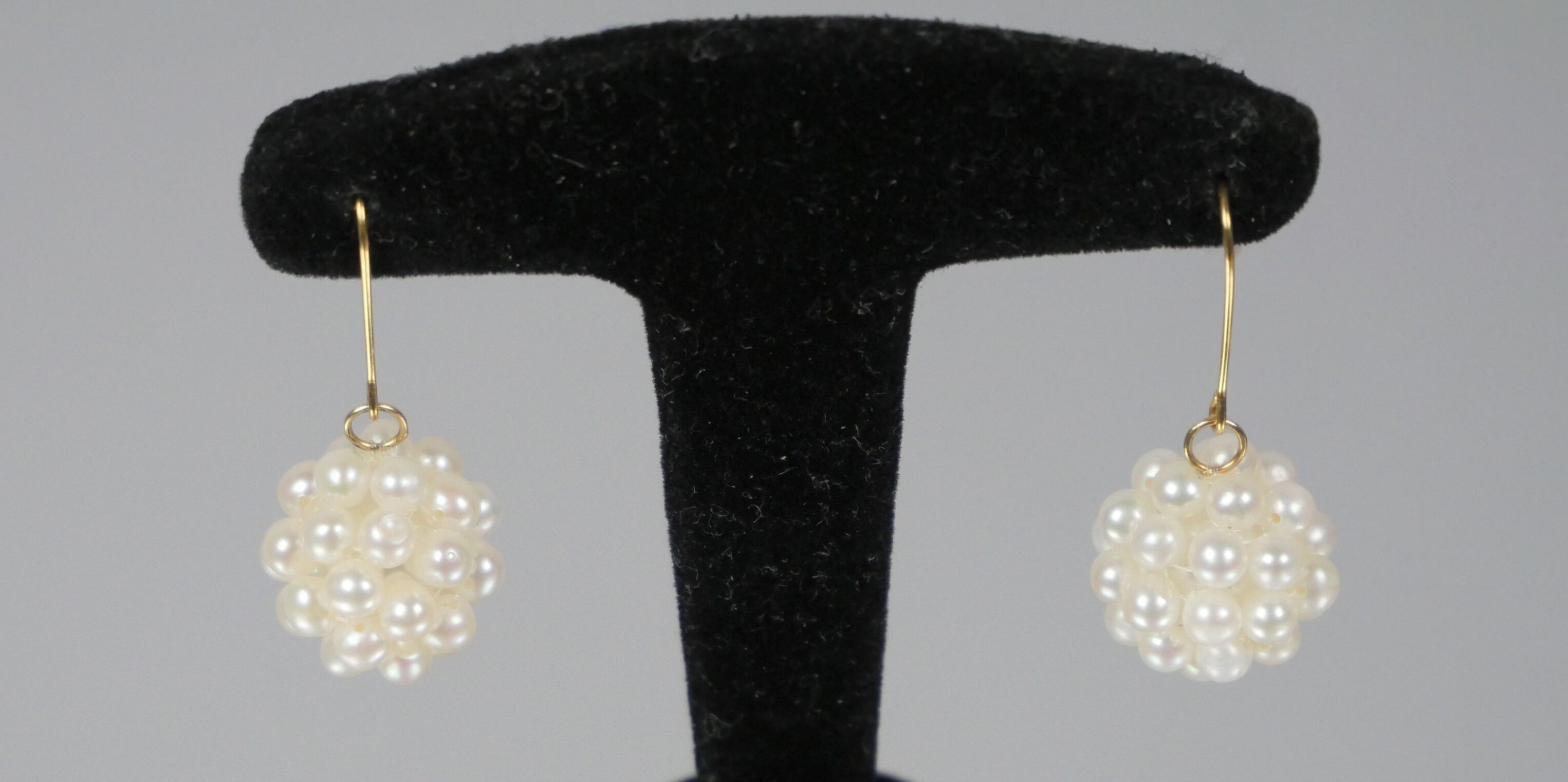 - Paire de pendants d'oreilles en or jaune 750 millièmes soutenant une boule forme de perles blanches artificielles.