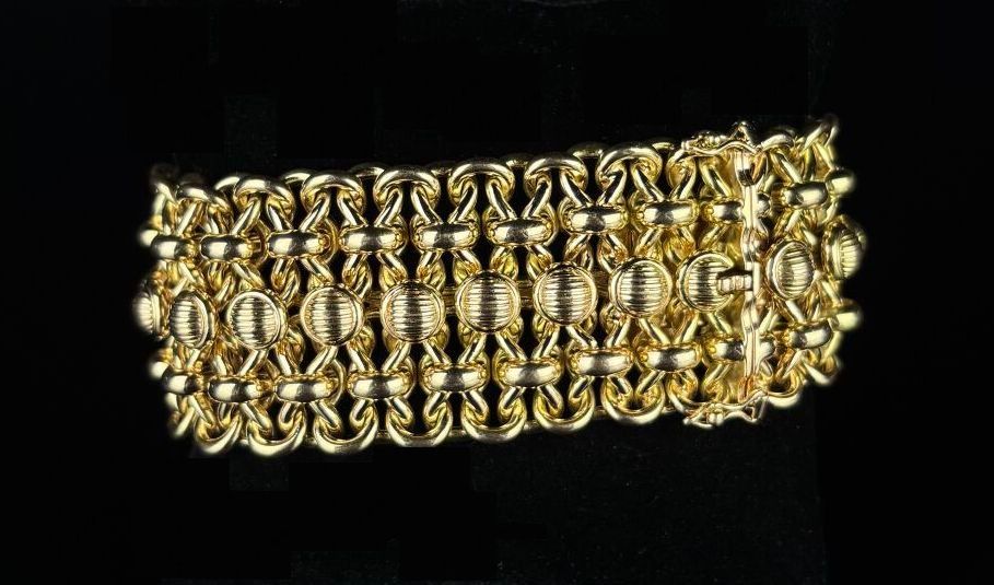Bracelet en or, à mailles croisées ornées de demi-sphères cannelées.