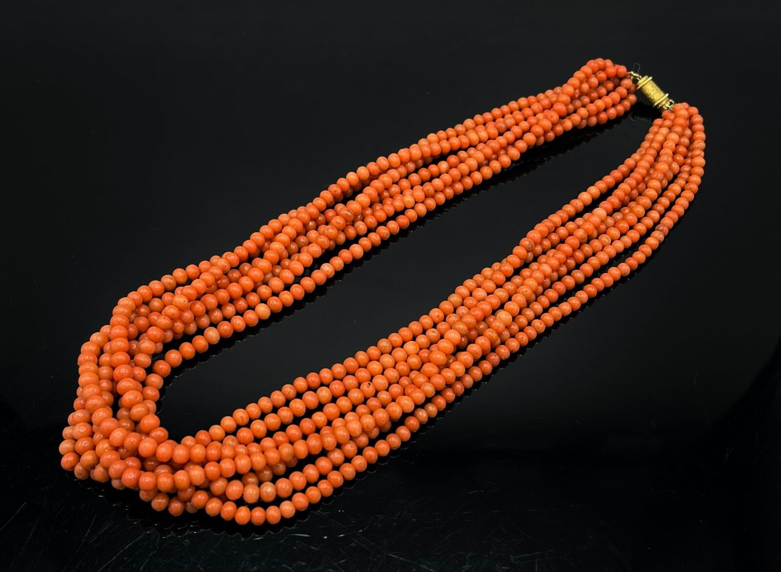 Collier ras de cou à 7 rangs de perles de corail rouge, fermoir en or jaune 18 k (750 millièmes).