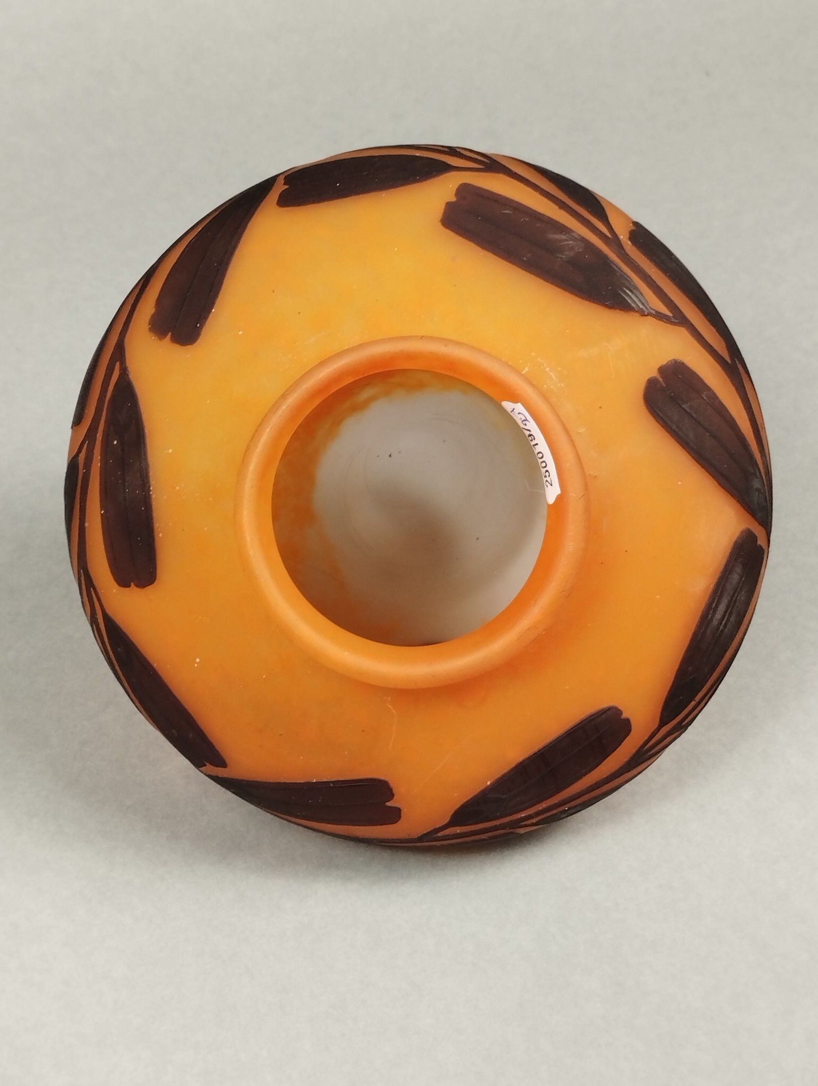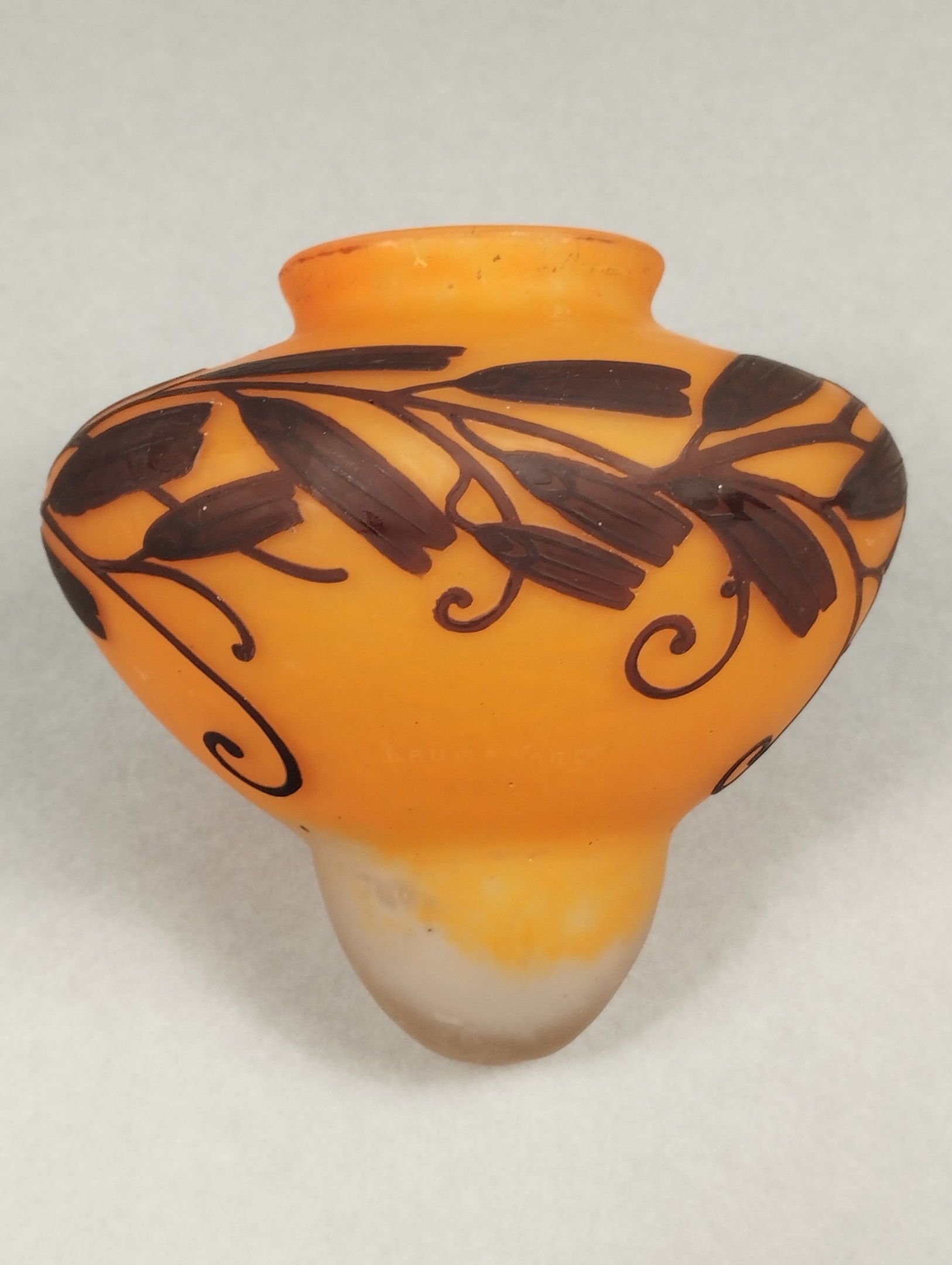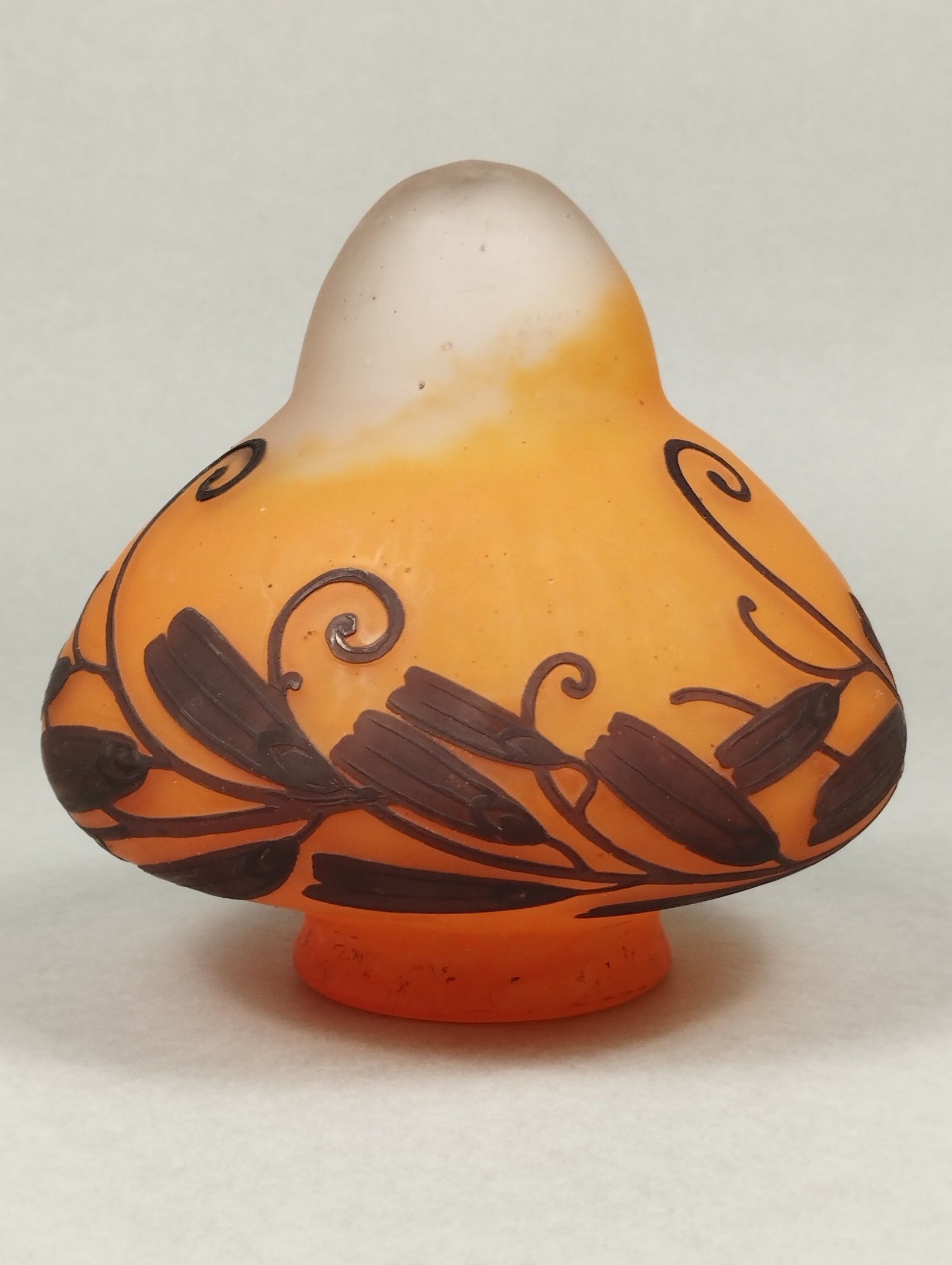 Le décor de samare de frêne est des plus rares chez Daum et même chez les artistes de l'Ecole de Nancy. A notre connaissance, seul Jules Cayette (1882-1953) utilisa ce motif. Il travaillait exclusivement avec la maison Daum ; aussi peut-on légitimement penser que ce verre était destiné à orner une de ses montures de bronze.