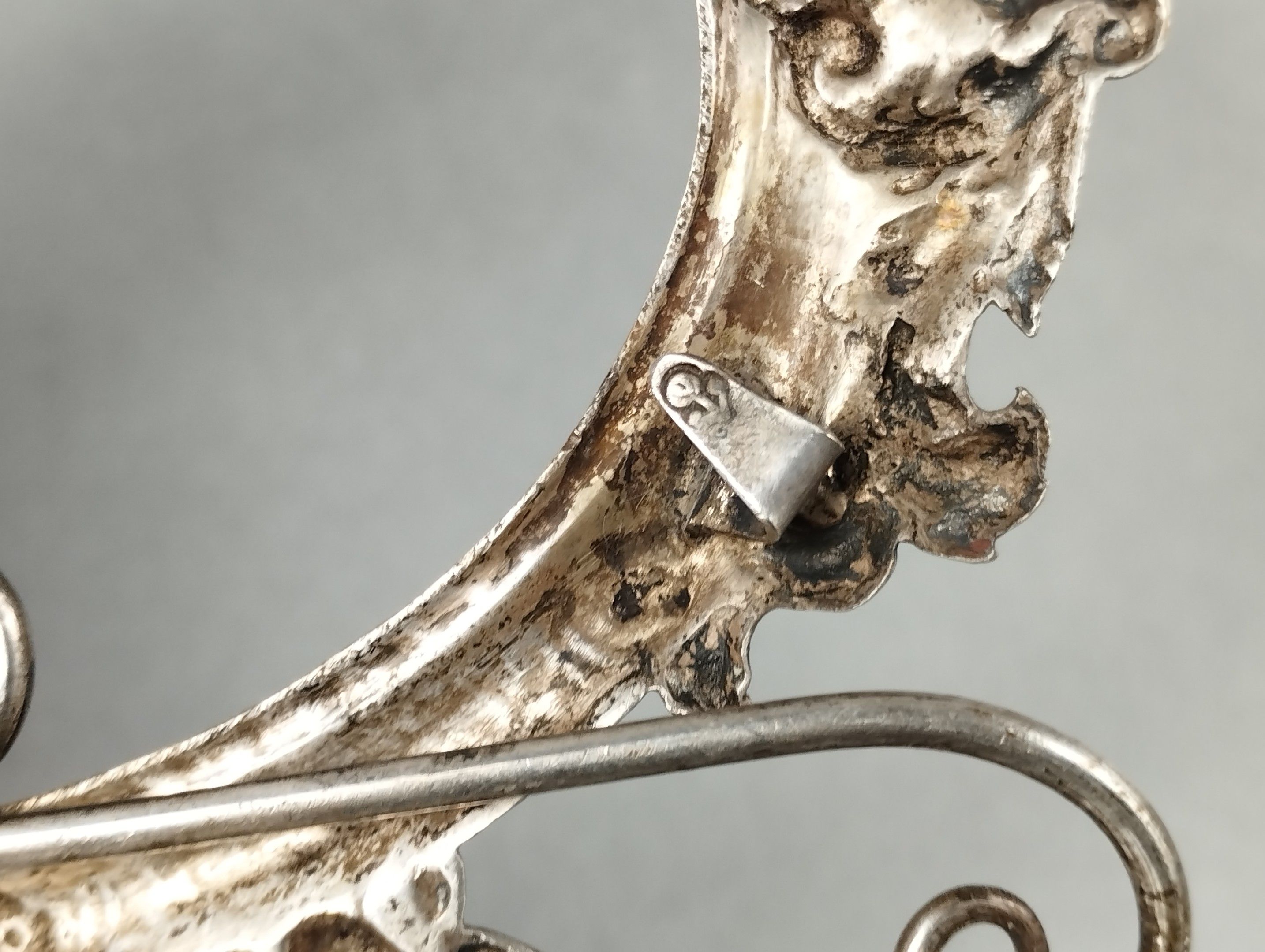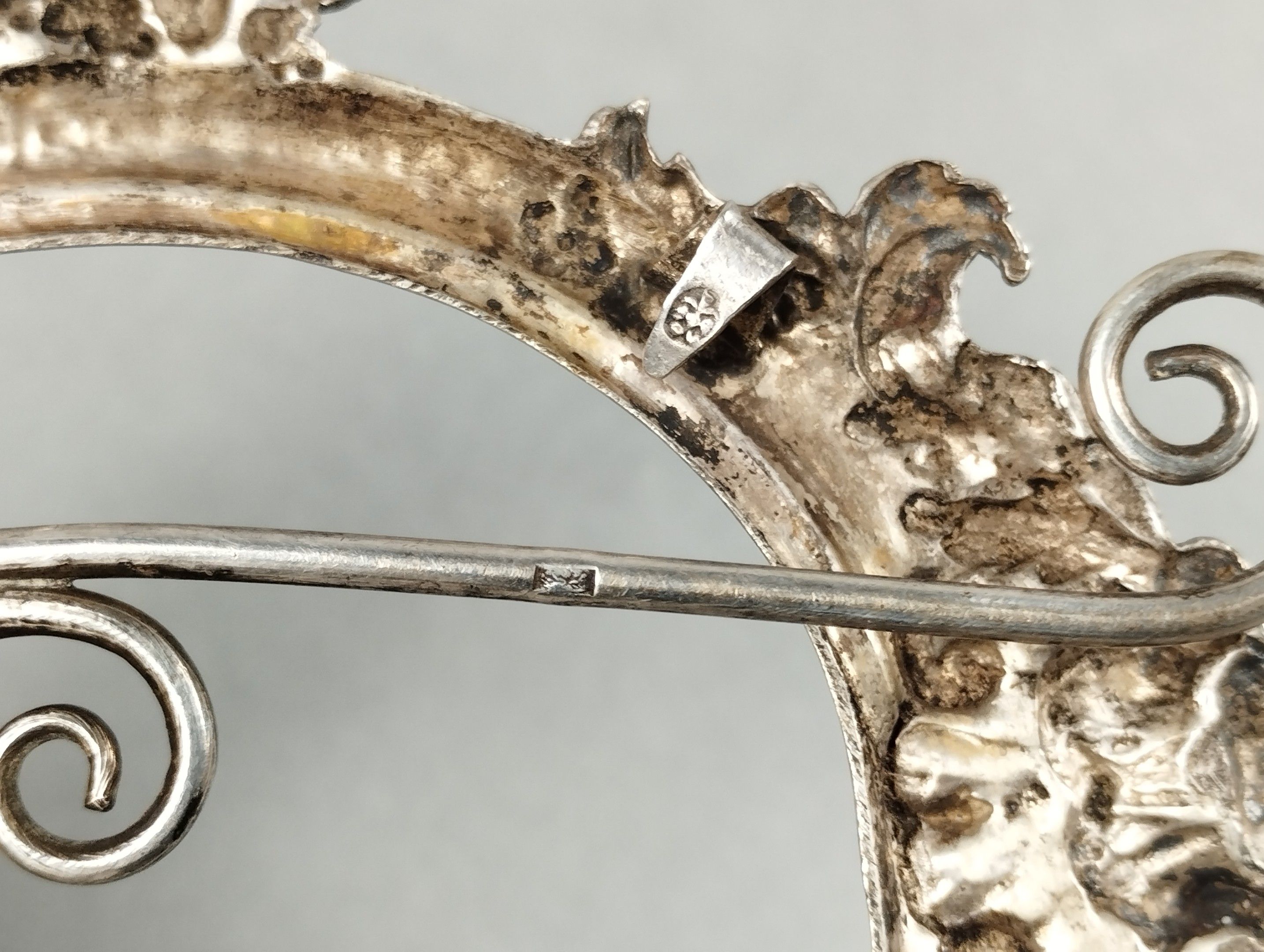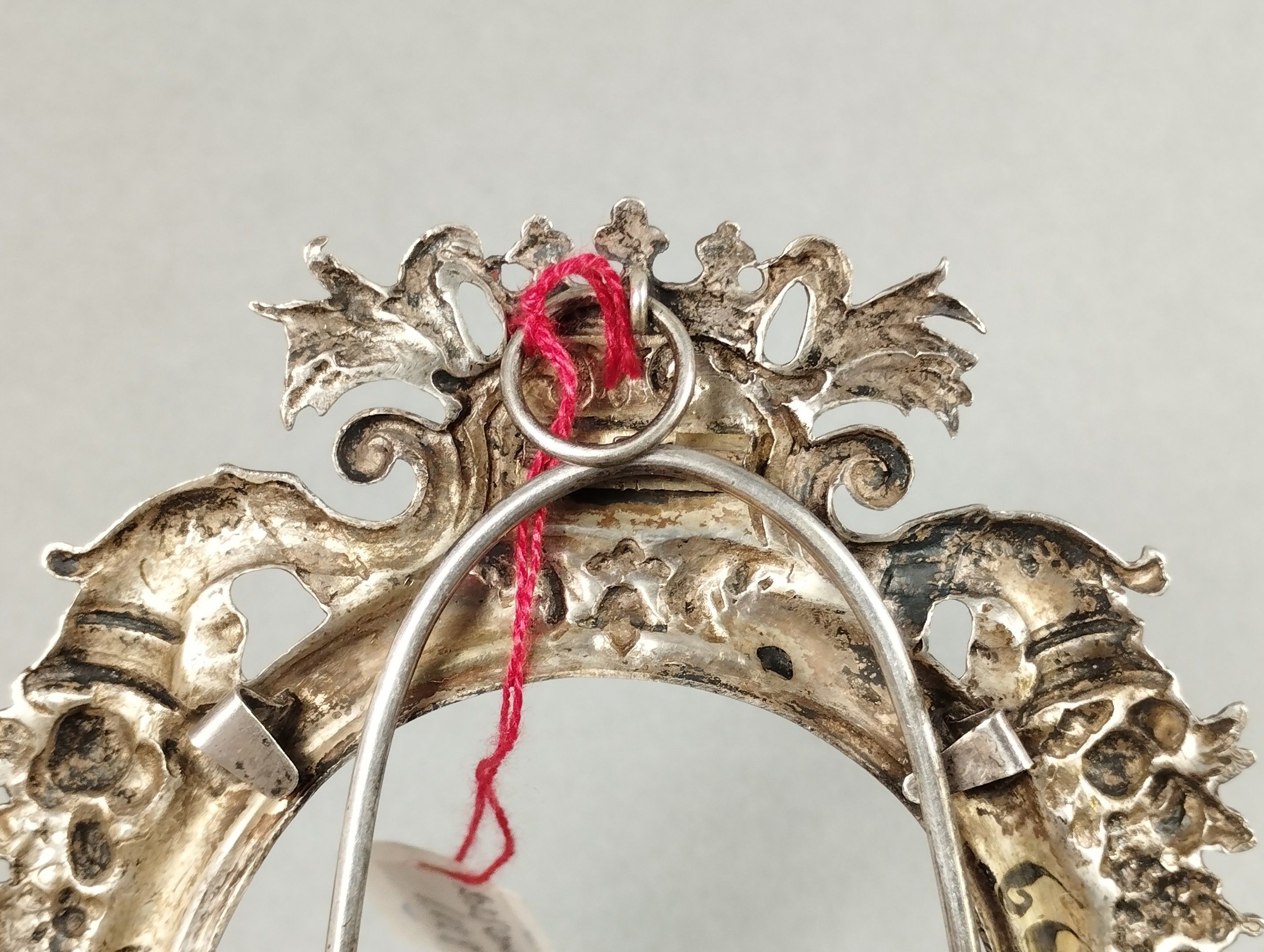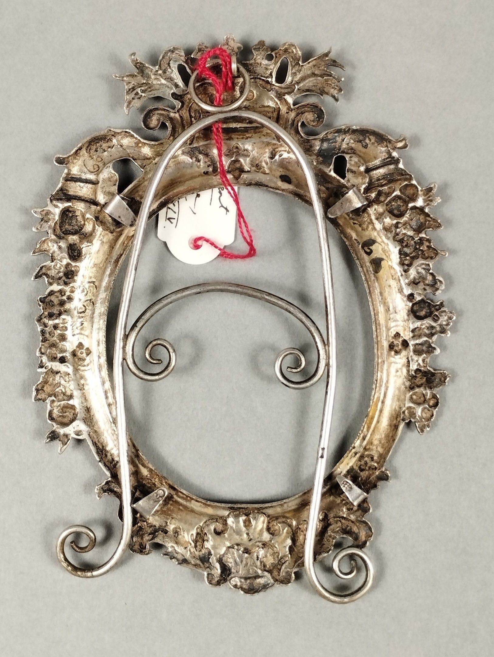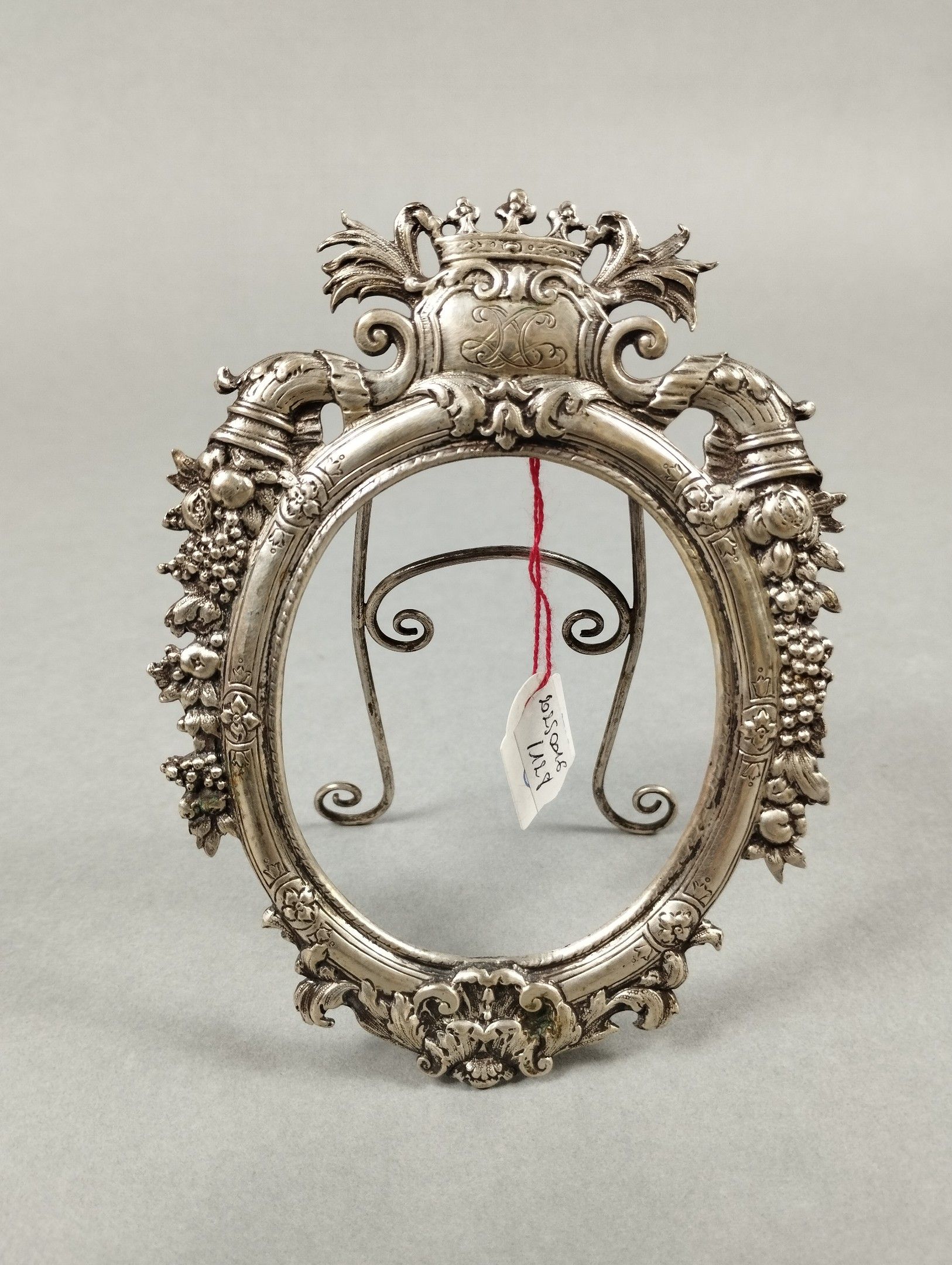 Cadre ovale à suspendre, à miniature, en argent, à décor de cornes d'abondance, coquille et feuilles d'acanthe, sommé d'un cartouche chiffré surmonté d'une couronne ducale. XVIIIe siècle. Poinçons étrangers au revers, et charançon. 12,5 x 10 cm. Piètement à chevalet ajouté au XIXe siècle. Poids : 65 g.