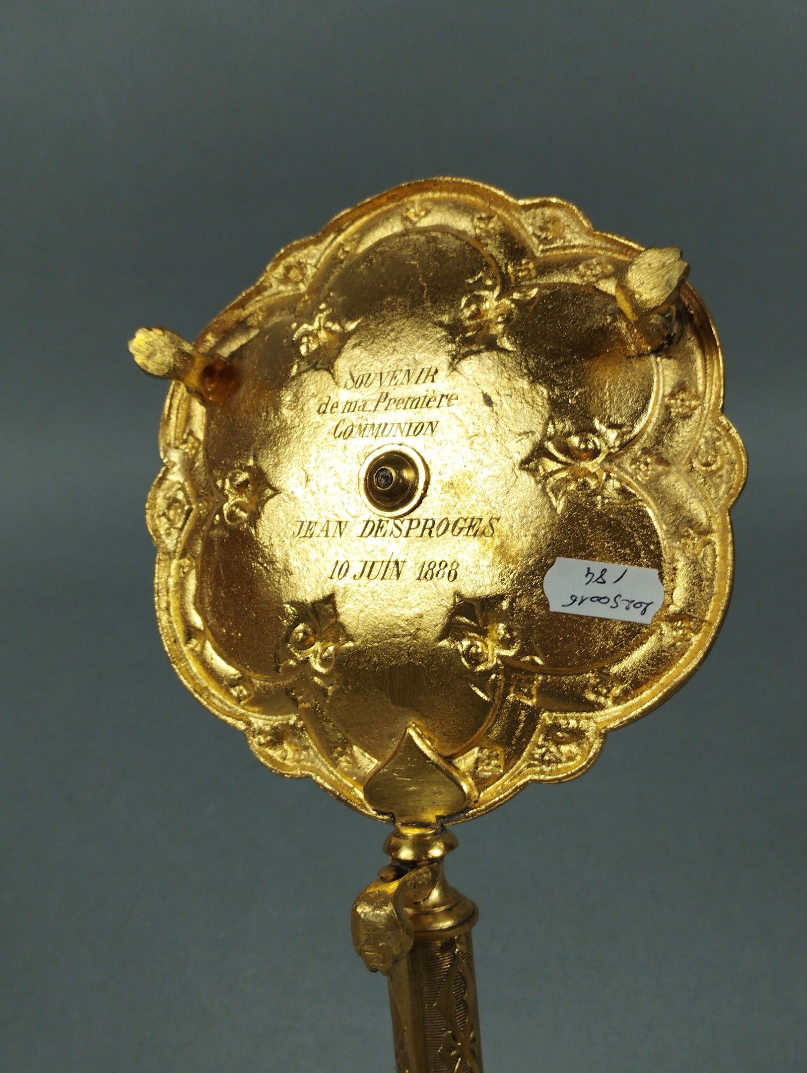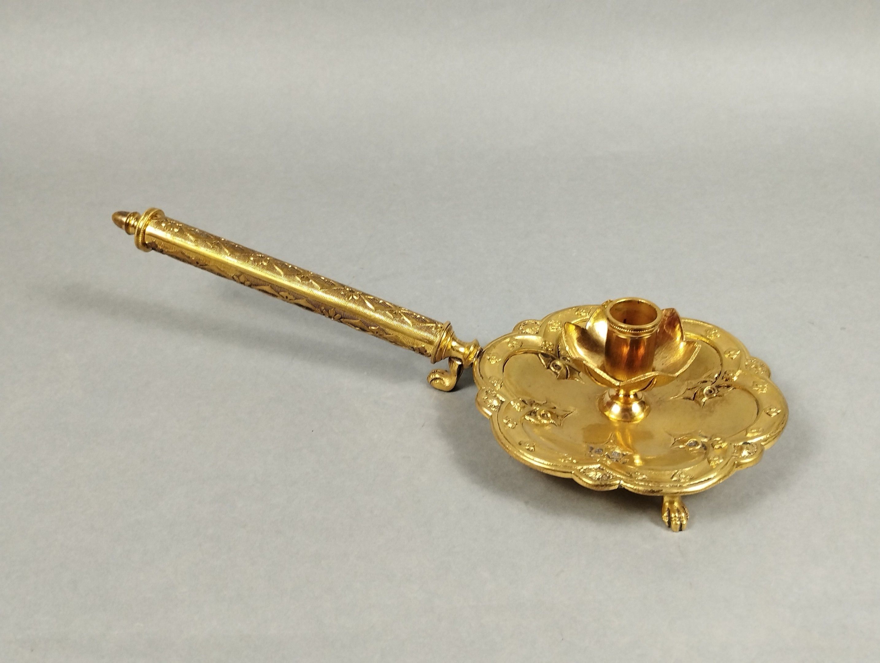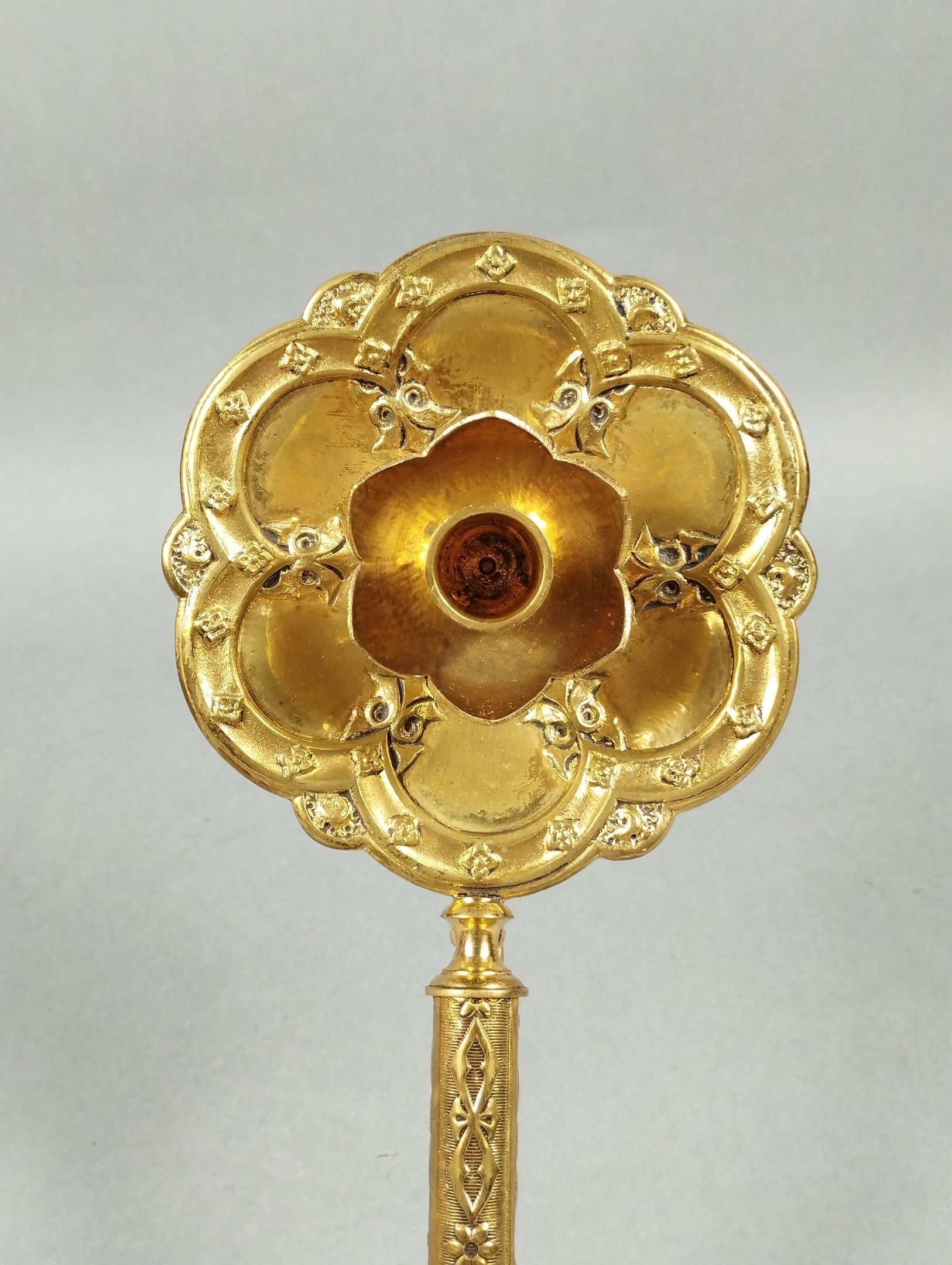 Art sacré. Bougeoir épiscopal néogothique tripode en bronze doré. Epoque Second Empire. Long. 37,5 cm.