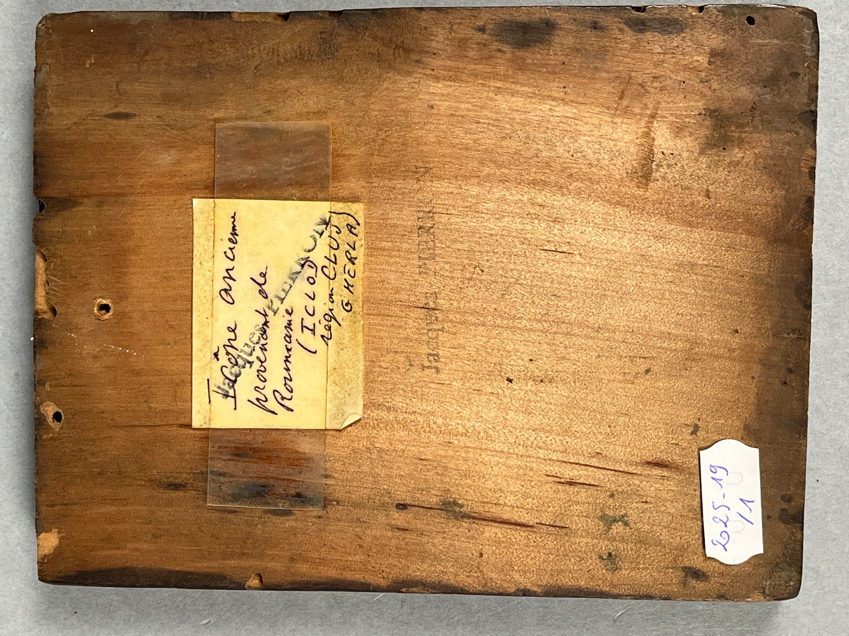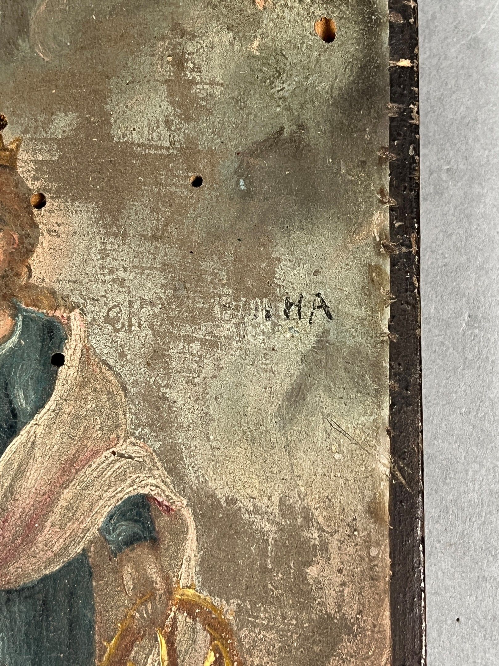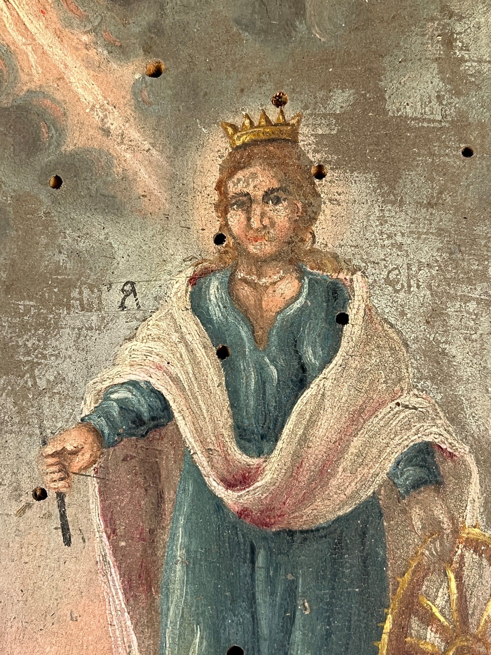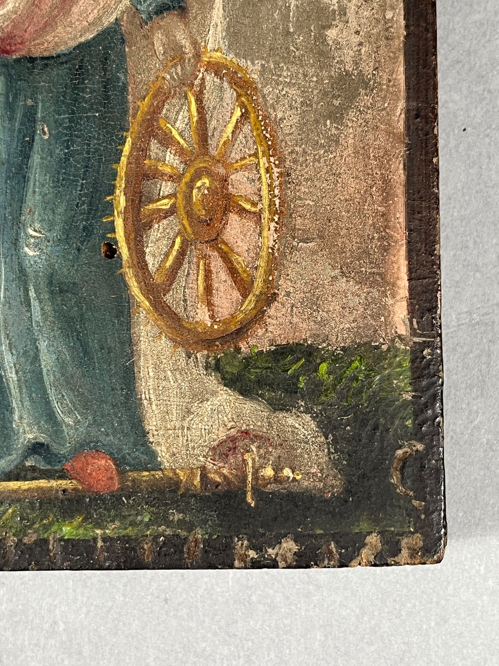 Art sacré. ROUMANIE. Icône orthodoxe représentant sainte Catherine d'Alexandrie. Travail de la région de Cluj (Transylvanie). Tempera sur bois. XIXe siècle. 16,5 x 12,5 cm. Trous d'insectes xylophage.