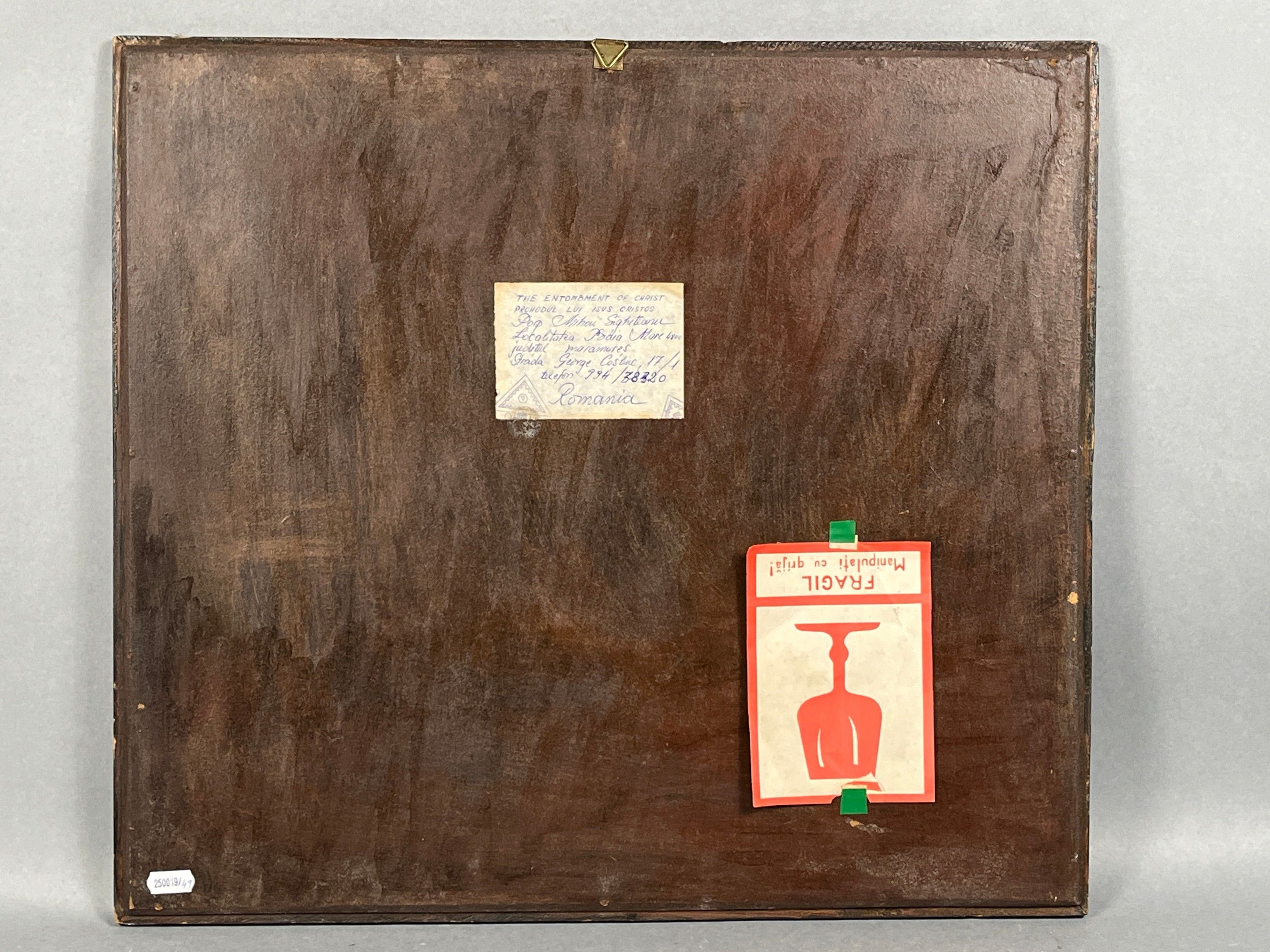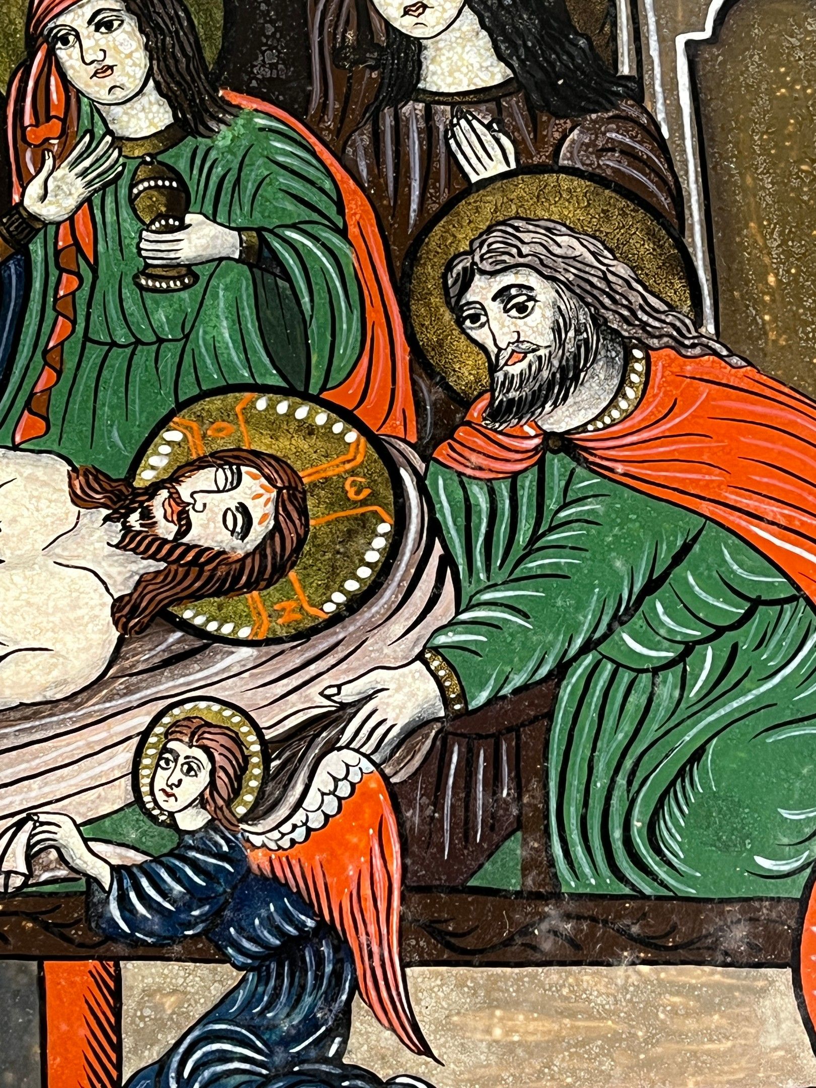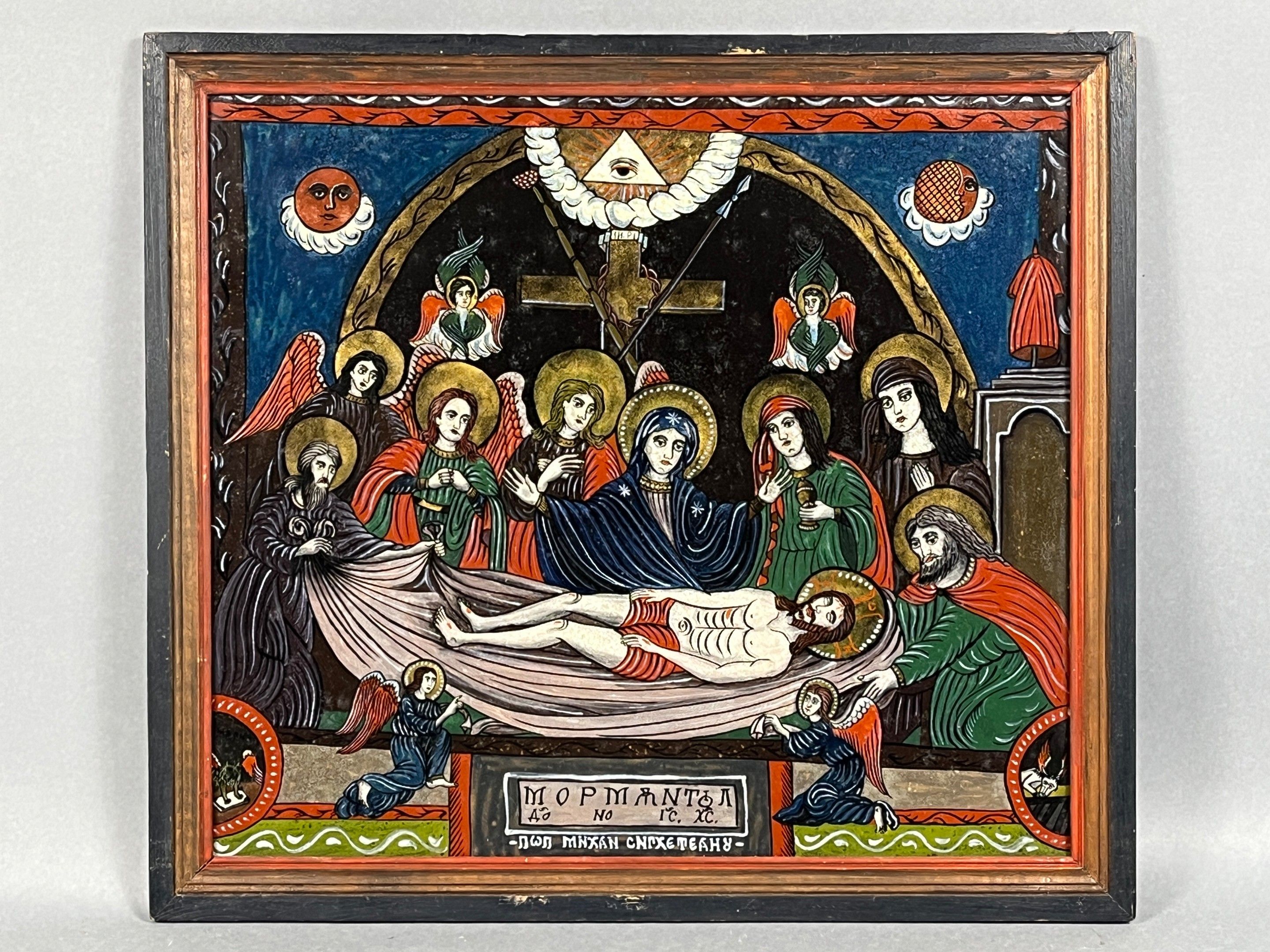 Art sacré. Pop Mihai SIGHETEANU (XXe siècle), Roumanie. Fixé sous verre représentant la mise au tombeau du Christ, entouré notamment de la Vierge Marie, de saint Jean, de Marie-Madeleine et de nombreux anges. Années 1980. 49,5 x 55 cm.