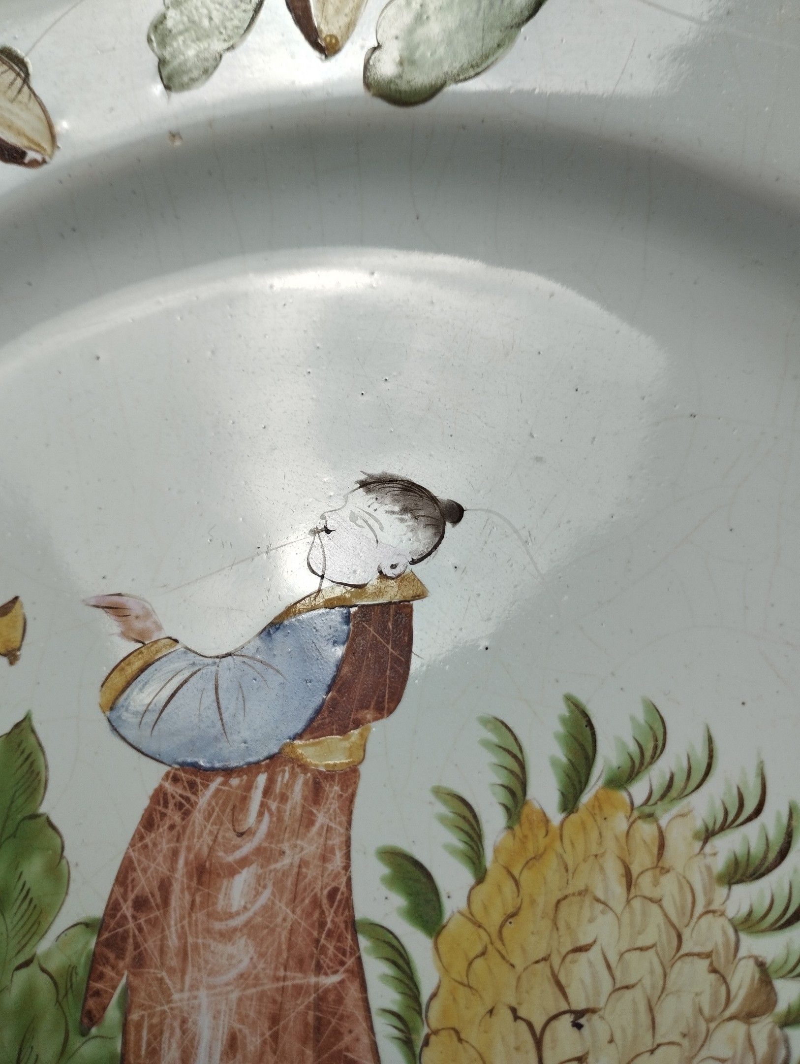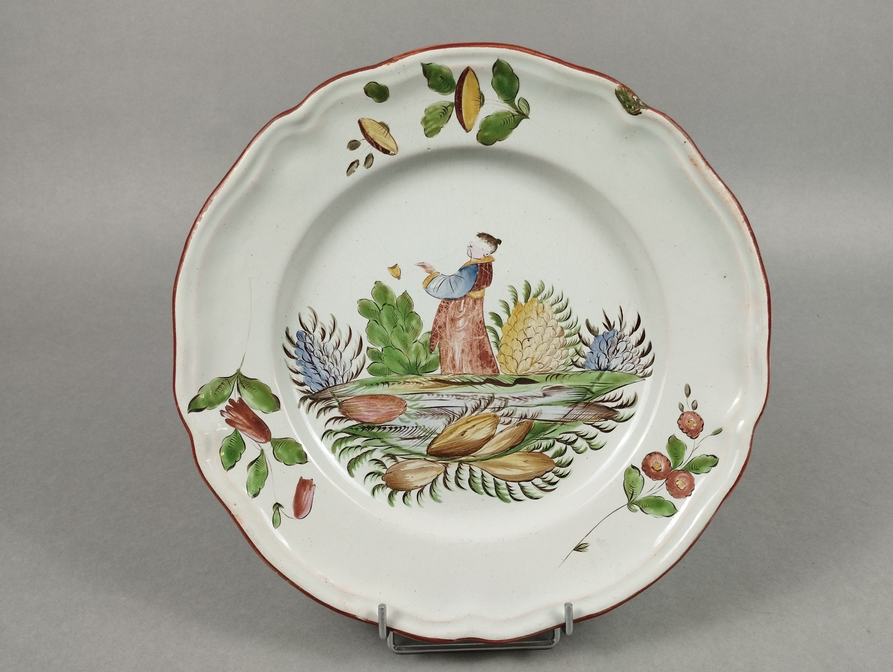 LUNEVILLE. Plat chantourné en faïence émaillée polychrome à décor de chinois fumant dans un paysage luxuriant. XVIIIe siècle. Diam. 30 cm.