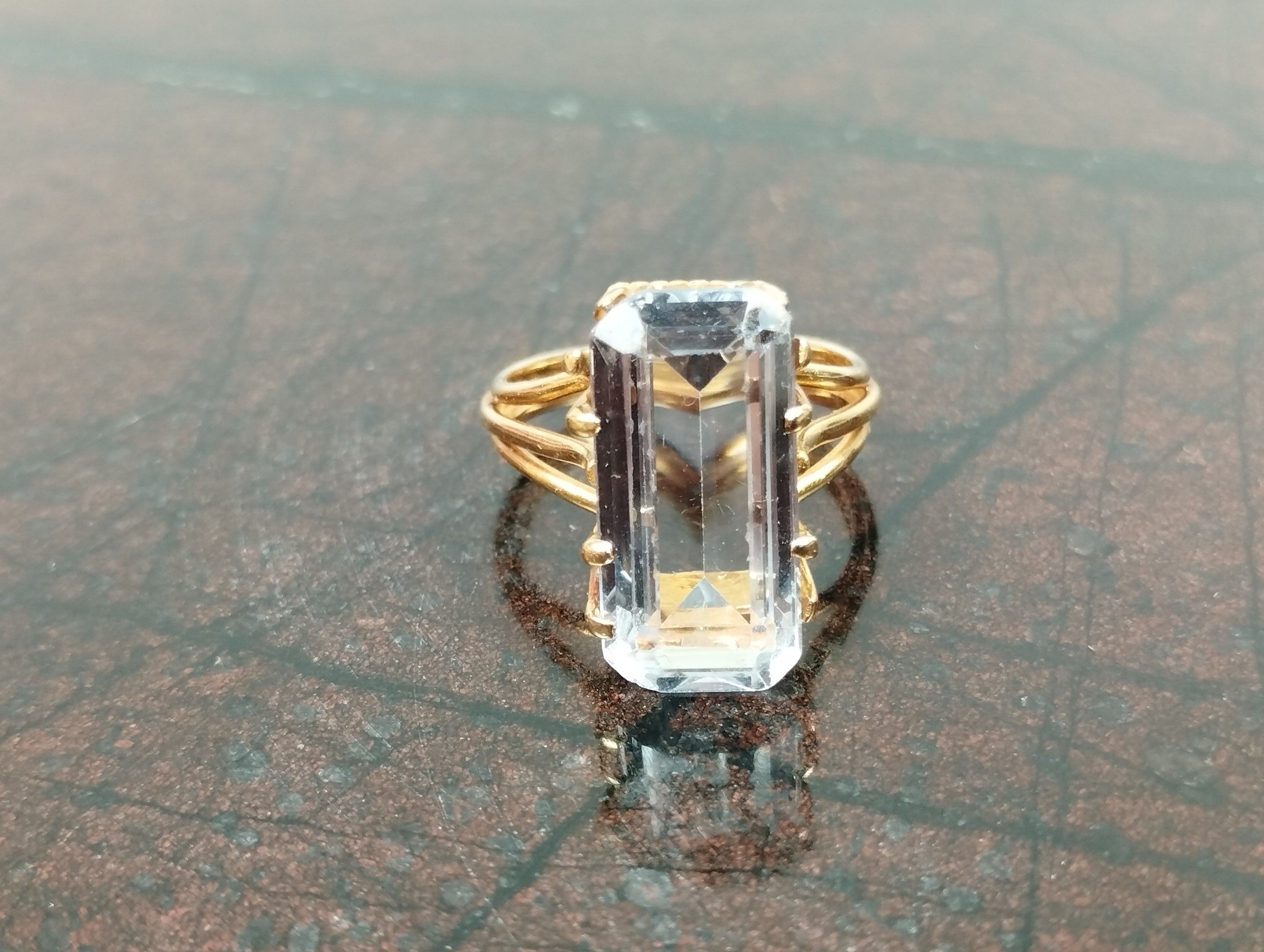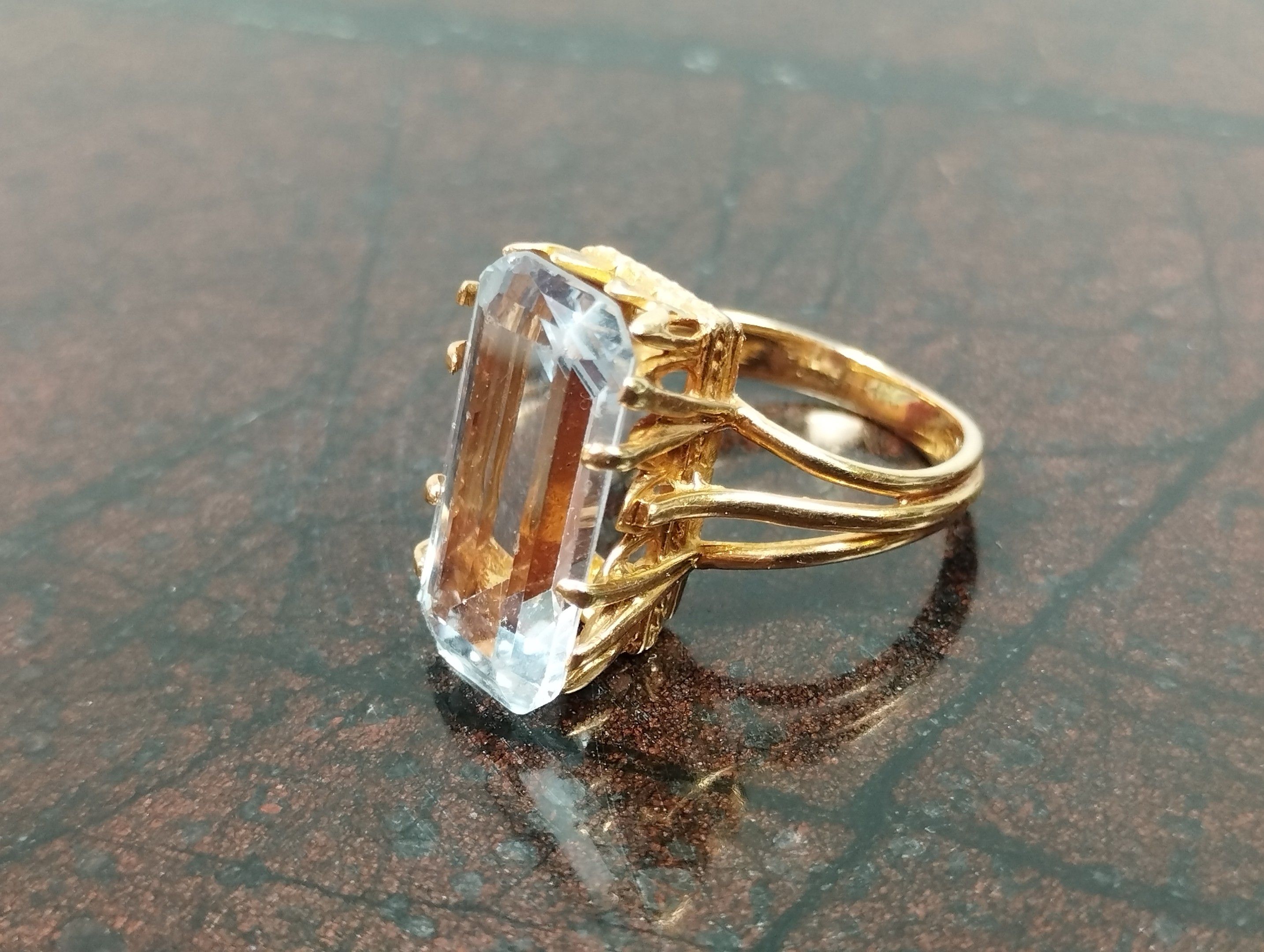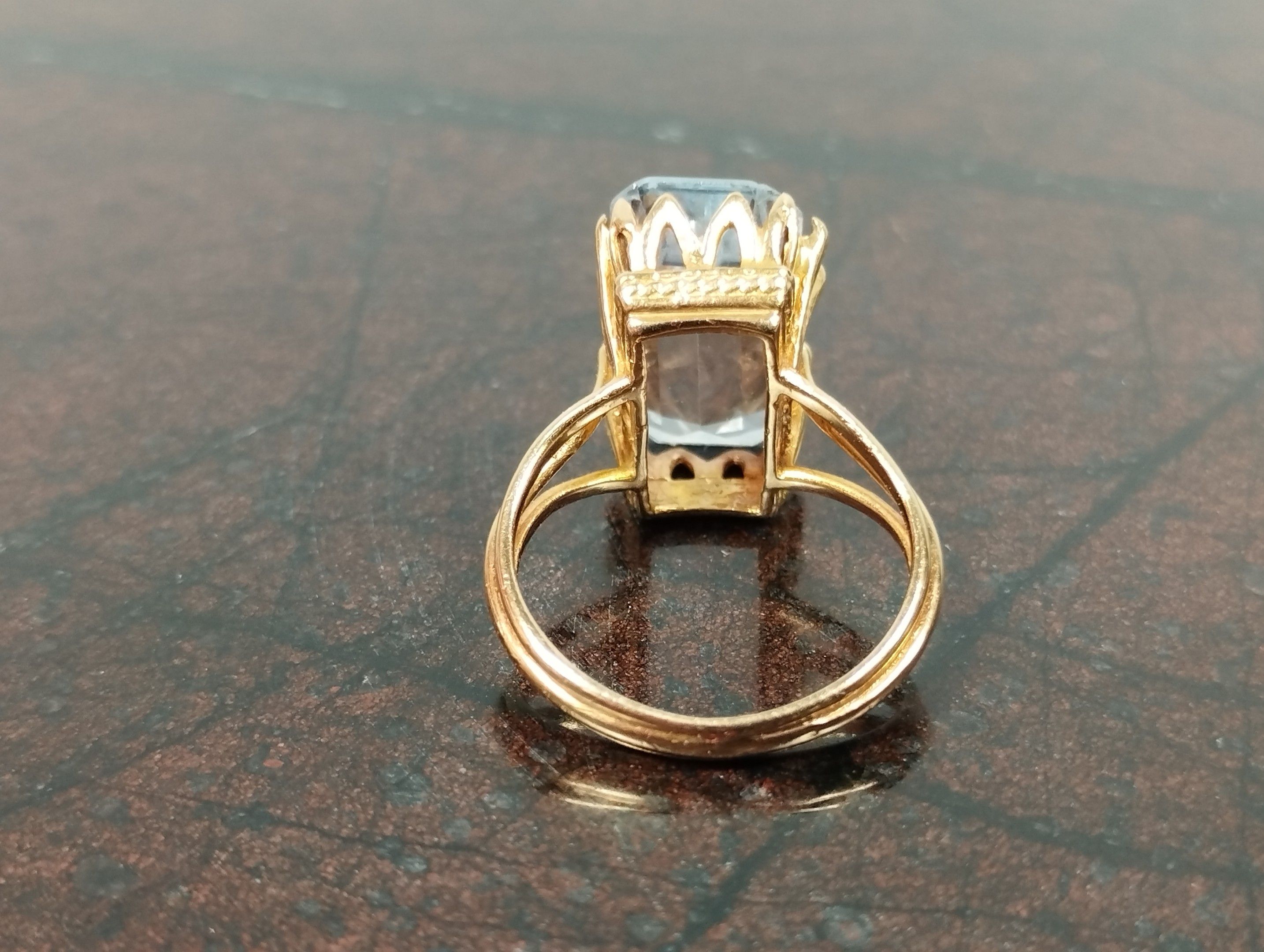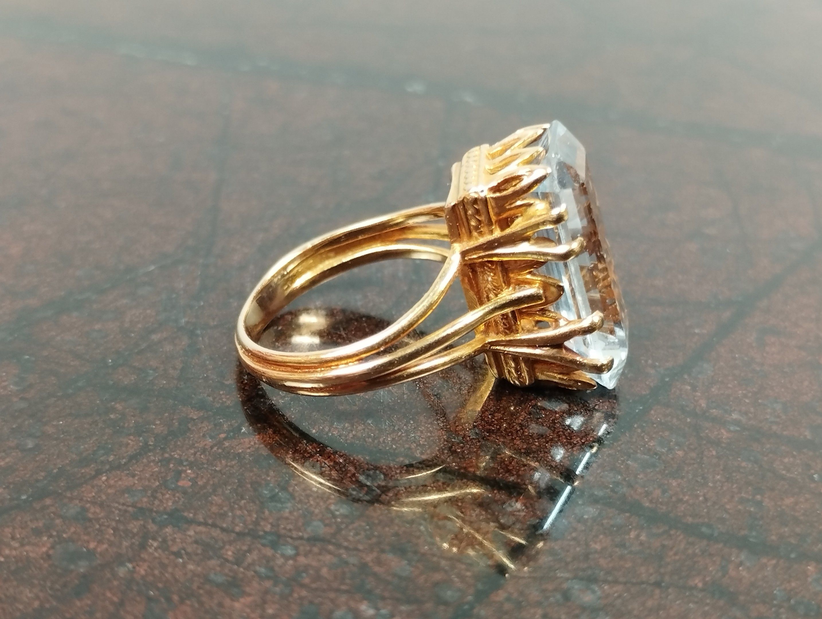 Bague, la monture en or jaune (750/00), sertie d'une importante aigue-marine rectangulaire taillée à gradins (9 x 18 mm.). P. brut: 6,25 g. TDD: 50. Egrisures sur la pierre.
