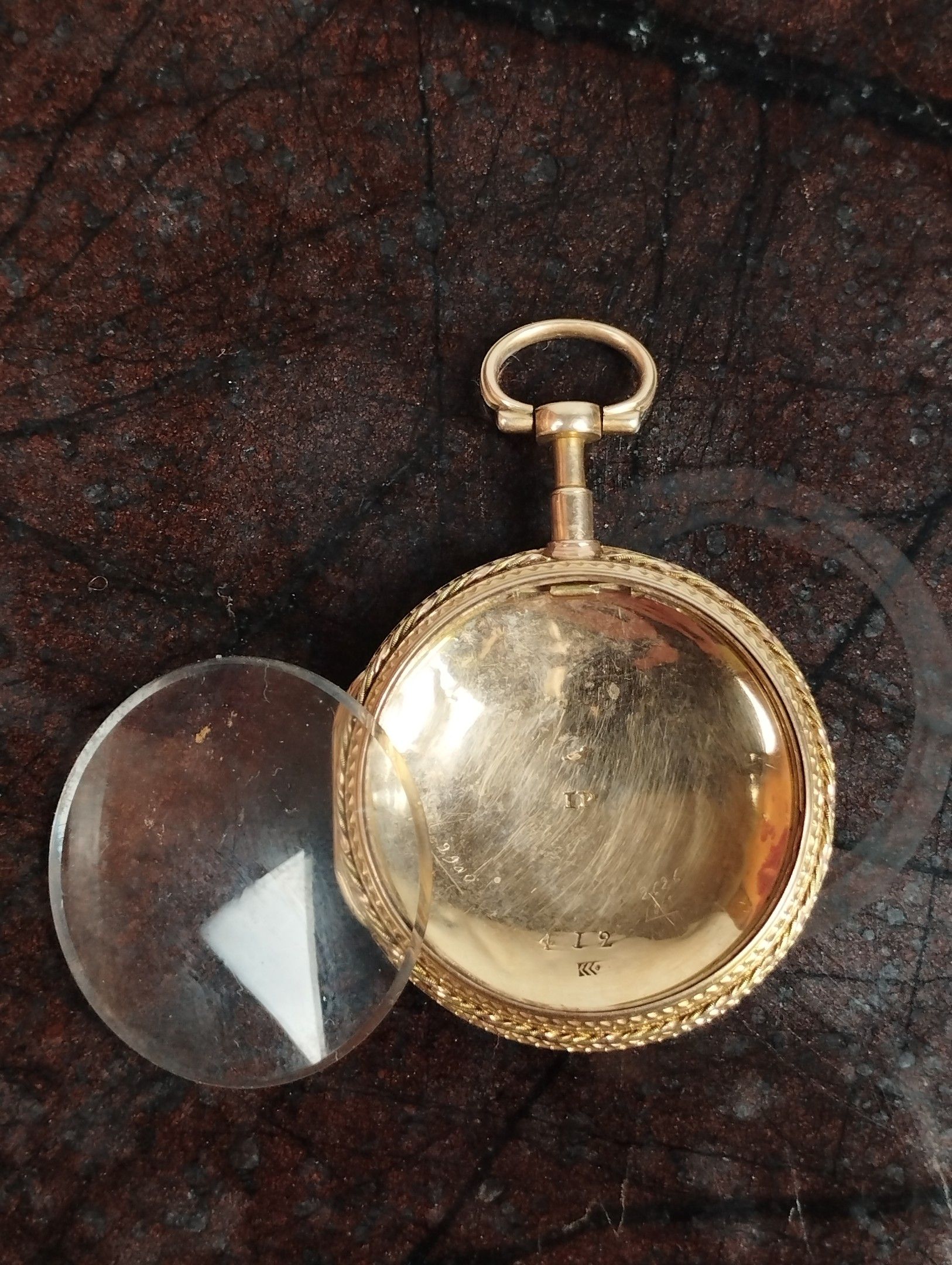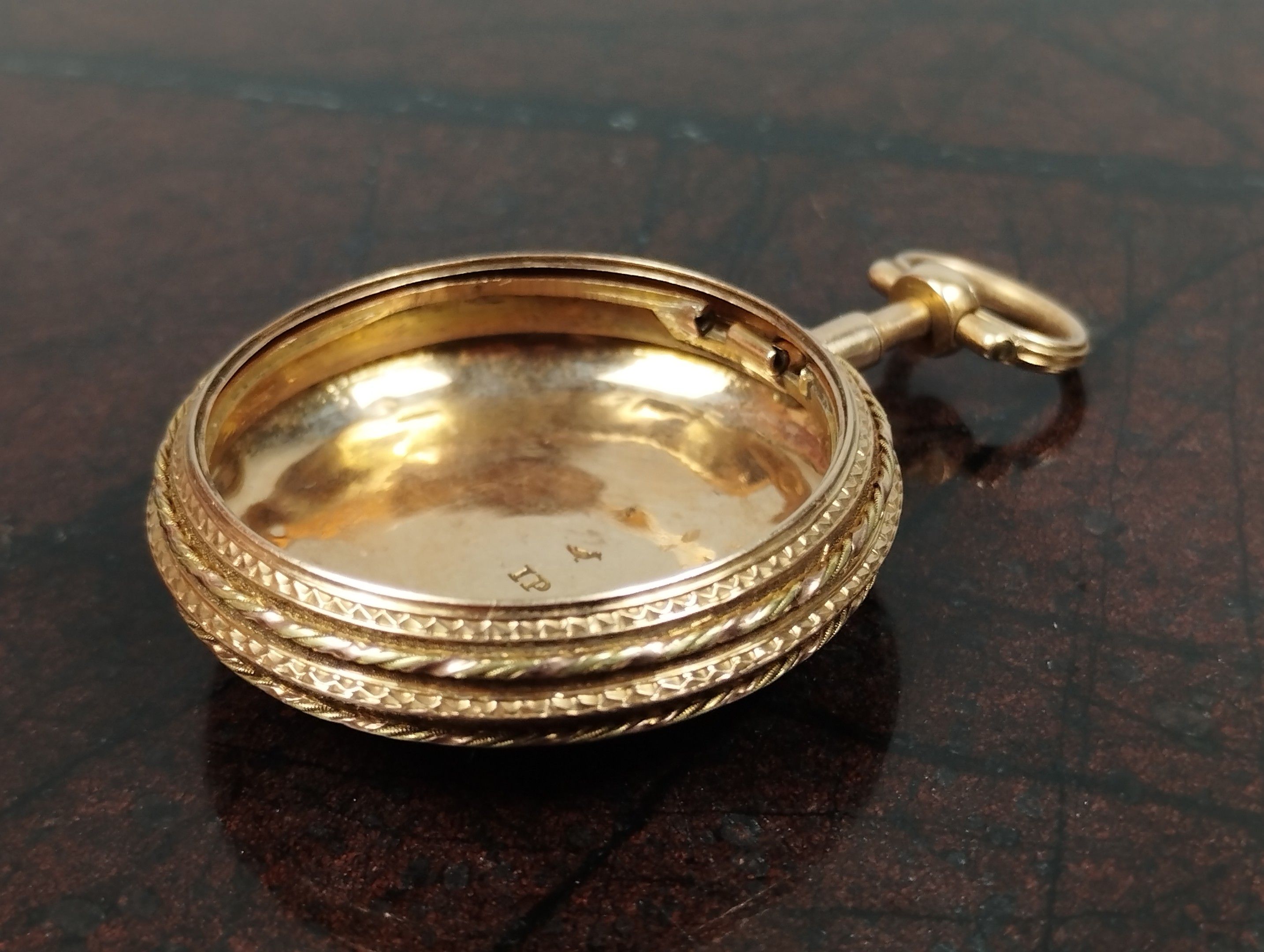 Boitier de montre de gousset en or (585/00) de différents tons, à motif néoclassique. Angleterre ? Fin du XVIIIe siècle. Diam. int. du boîtier : 32 mm. Poids net (sans verre) : 16,8 g.