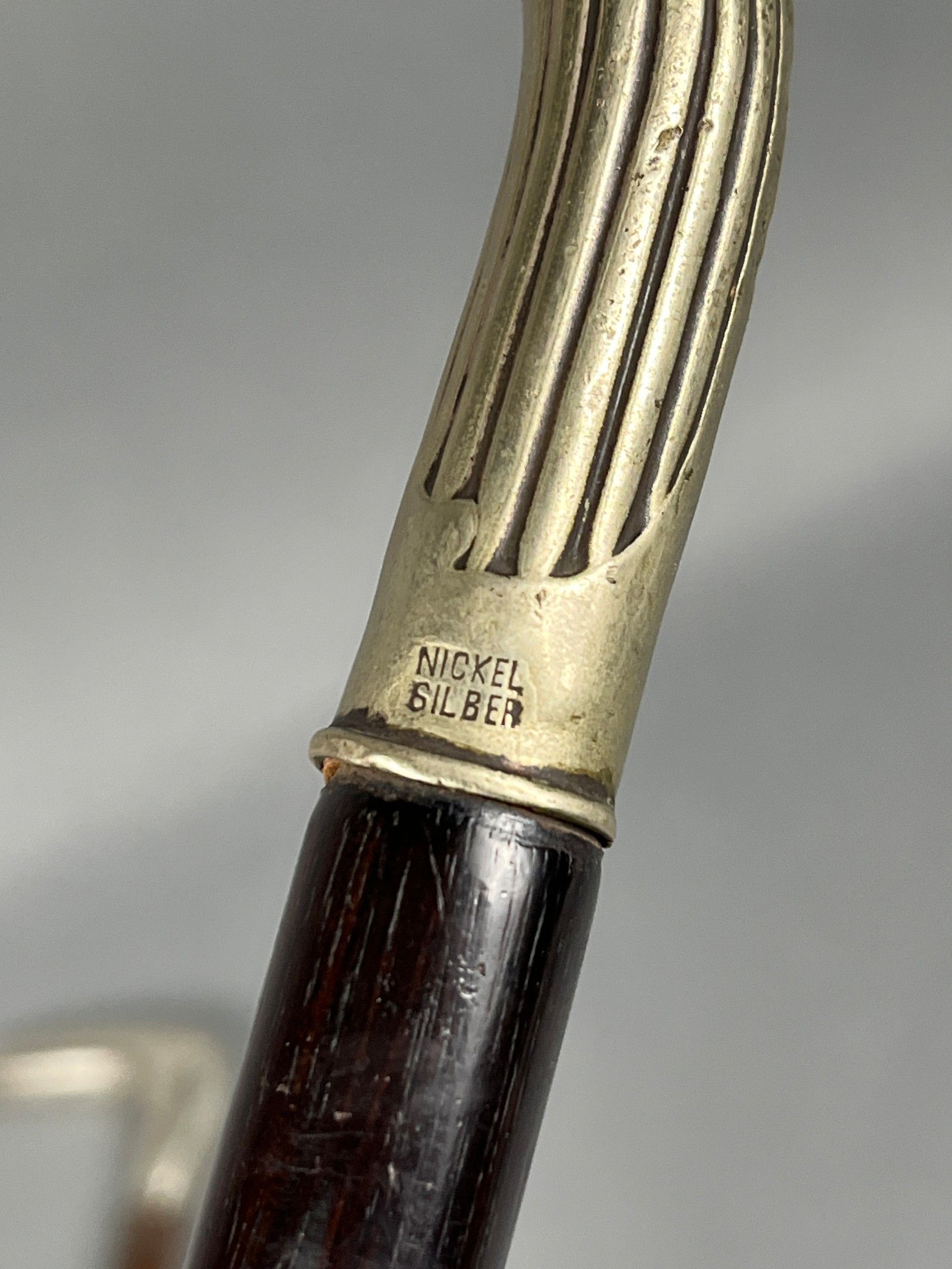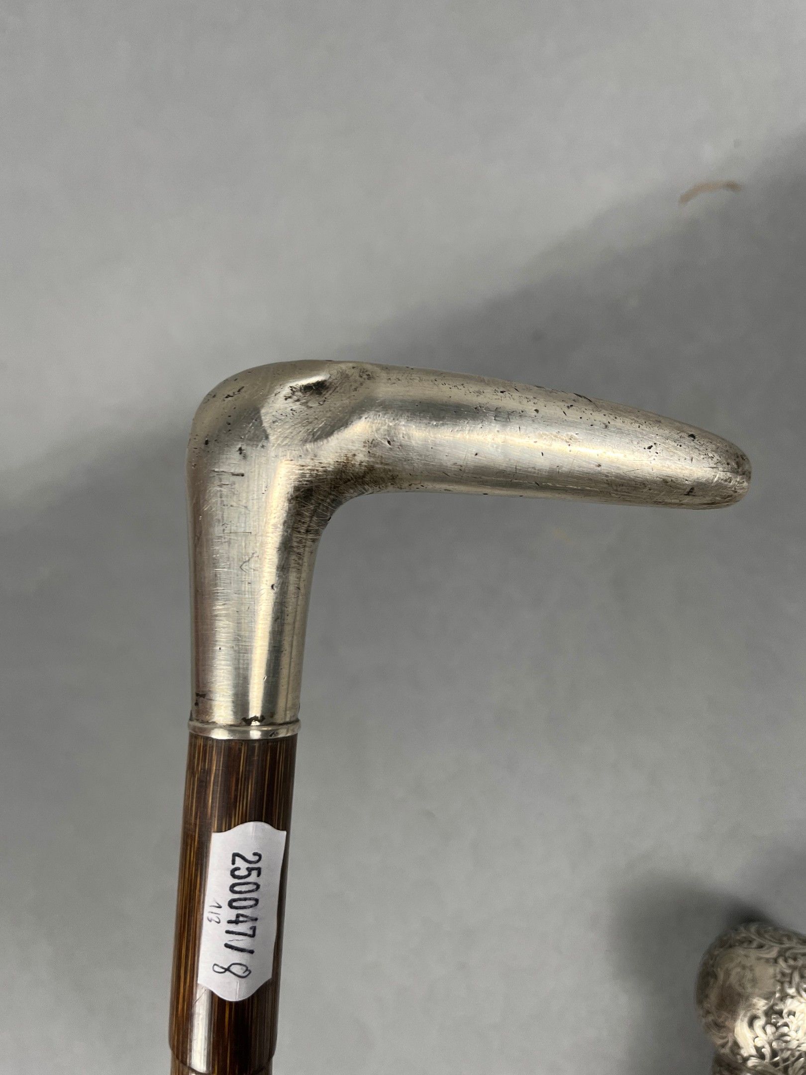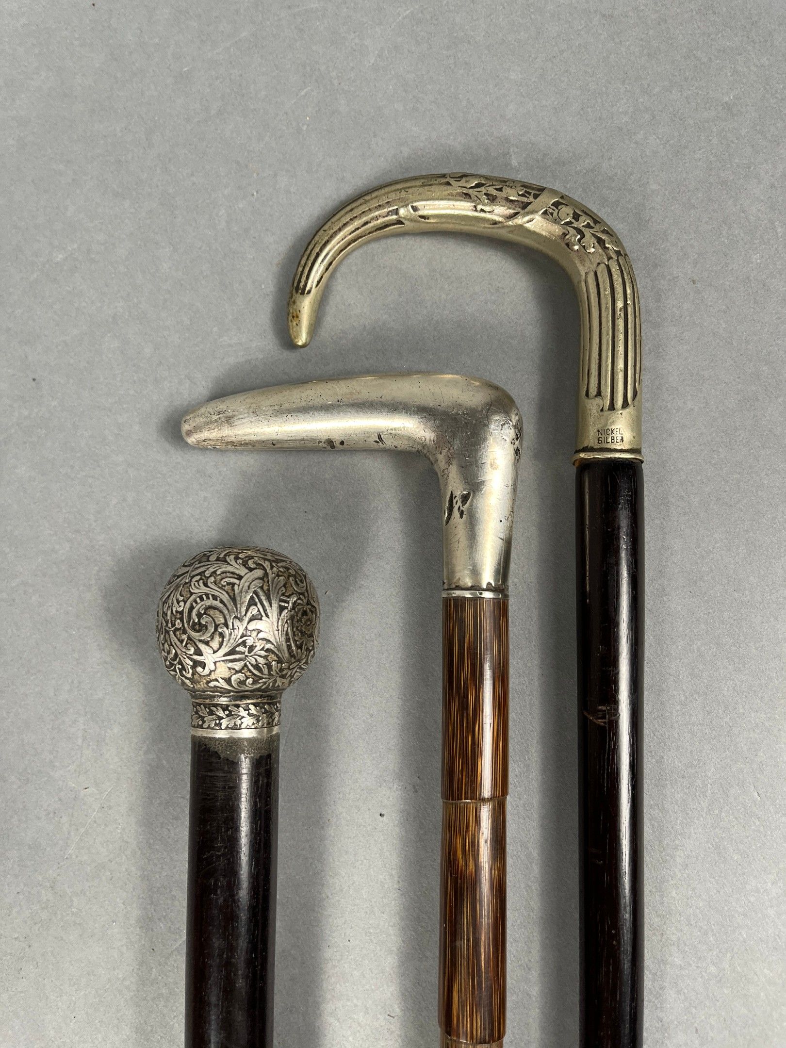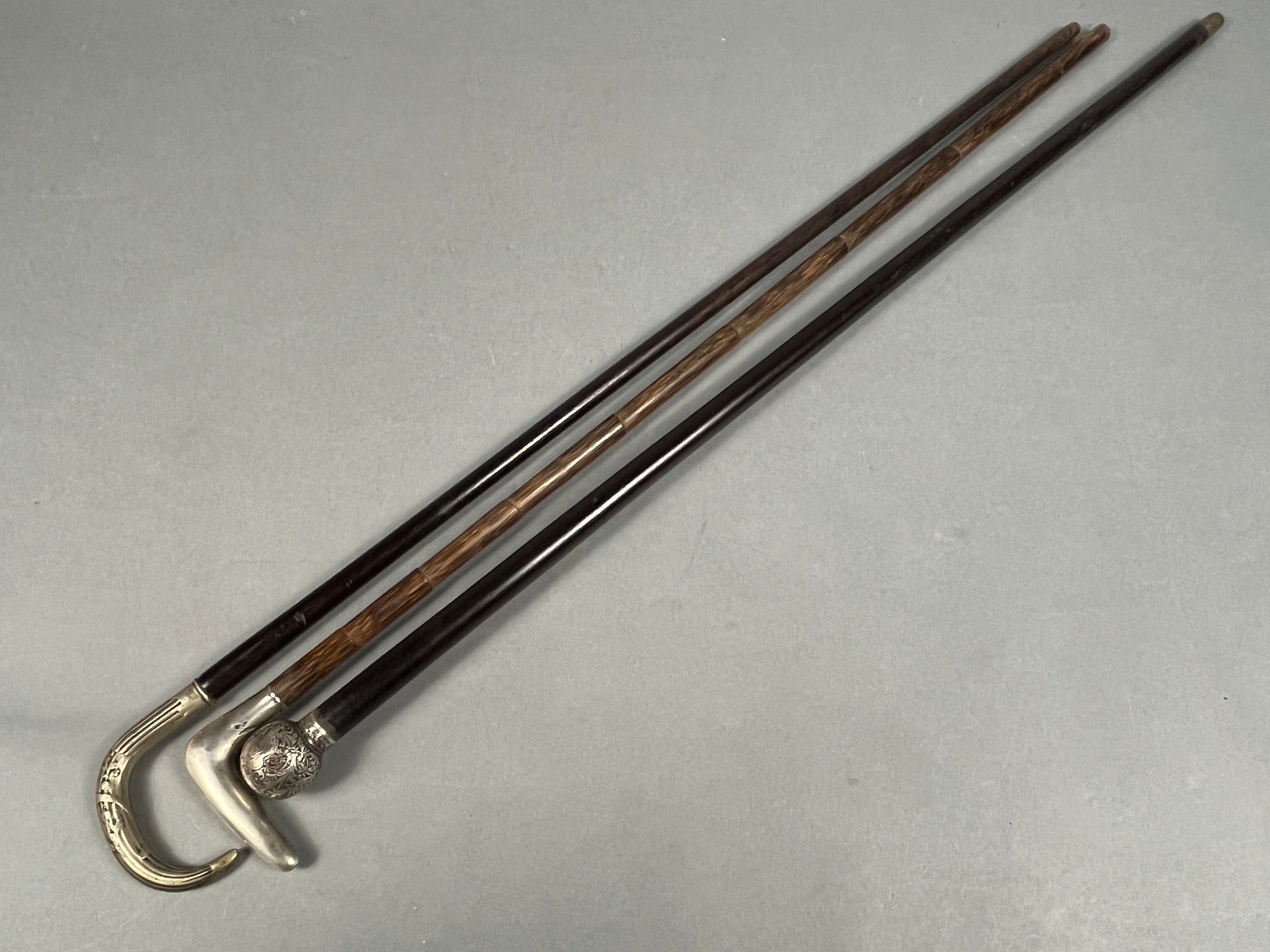Réunion de trois cannes, l'une "casse-tête" (L. = 88,5 cm.), les prises et pommeau en argent (divers titres) et maillechort.