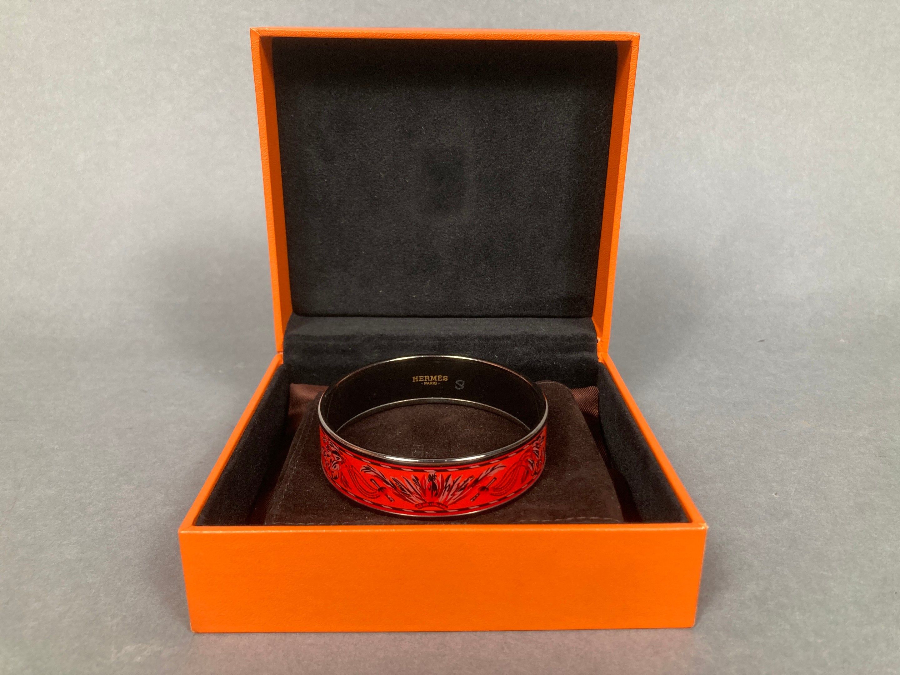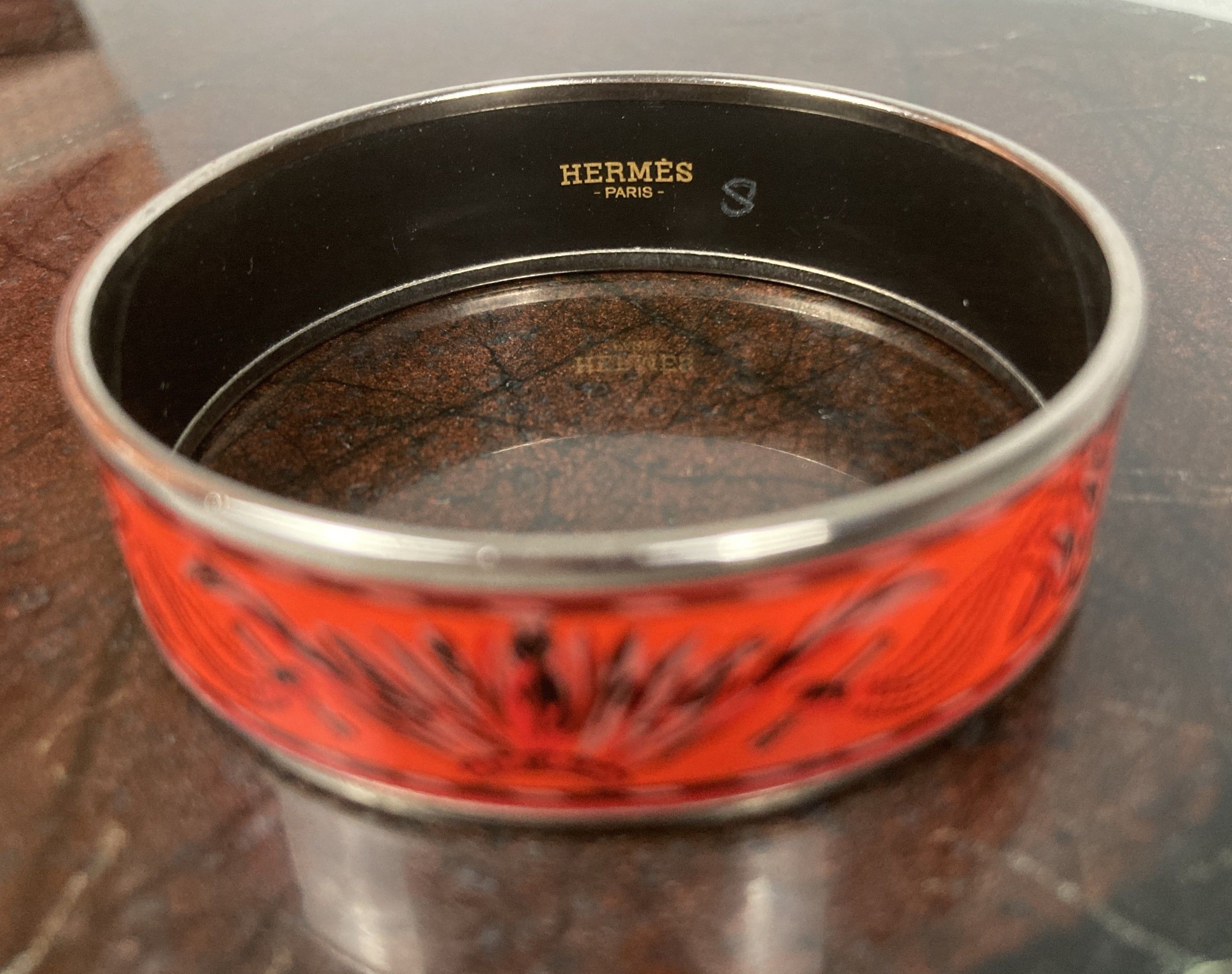 HERMES, Paris. "Brazil". Large bracelet jonc, en métal palladié et à décor émaillé imprimé de coiffes à plumes. Signé. D. int.: 6,2 cm.; larg.: 18 mm. Bel état. Avec pochon et coffret de la Maison.