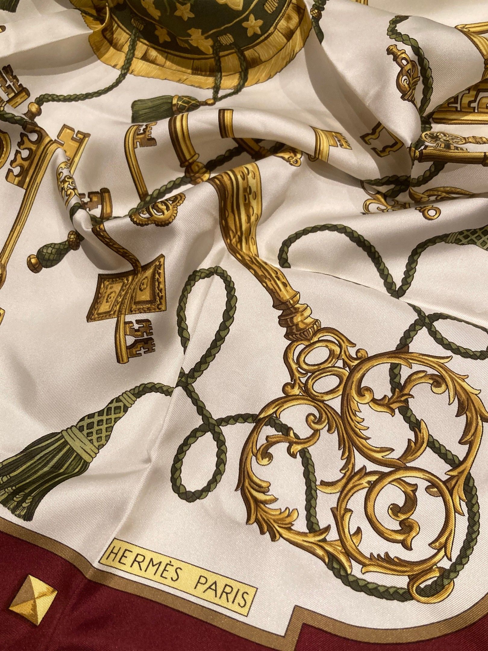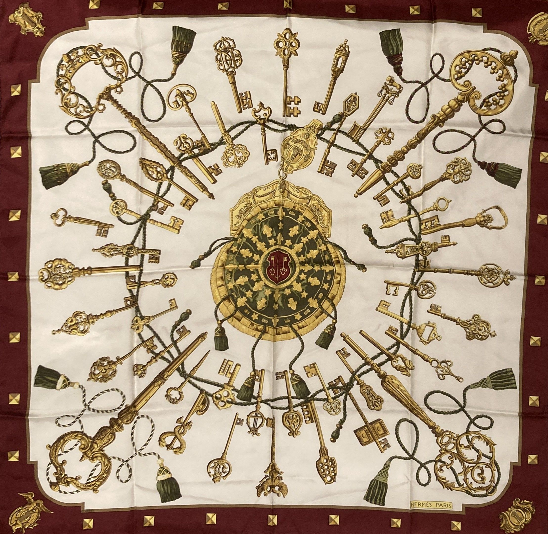 HERMES, Paris. "Les Clés". Carré 90 en twill de soie imprimée (bordure aubergine, fond crème), d'après un modèle de Cathy Latham. Signé, avec étiquette. Très bel état.