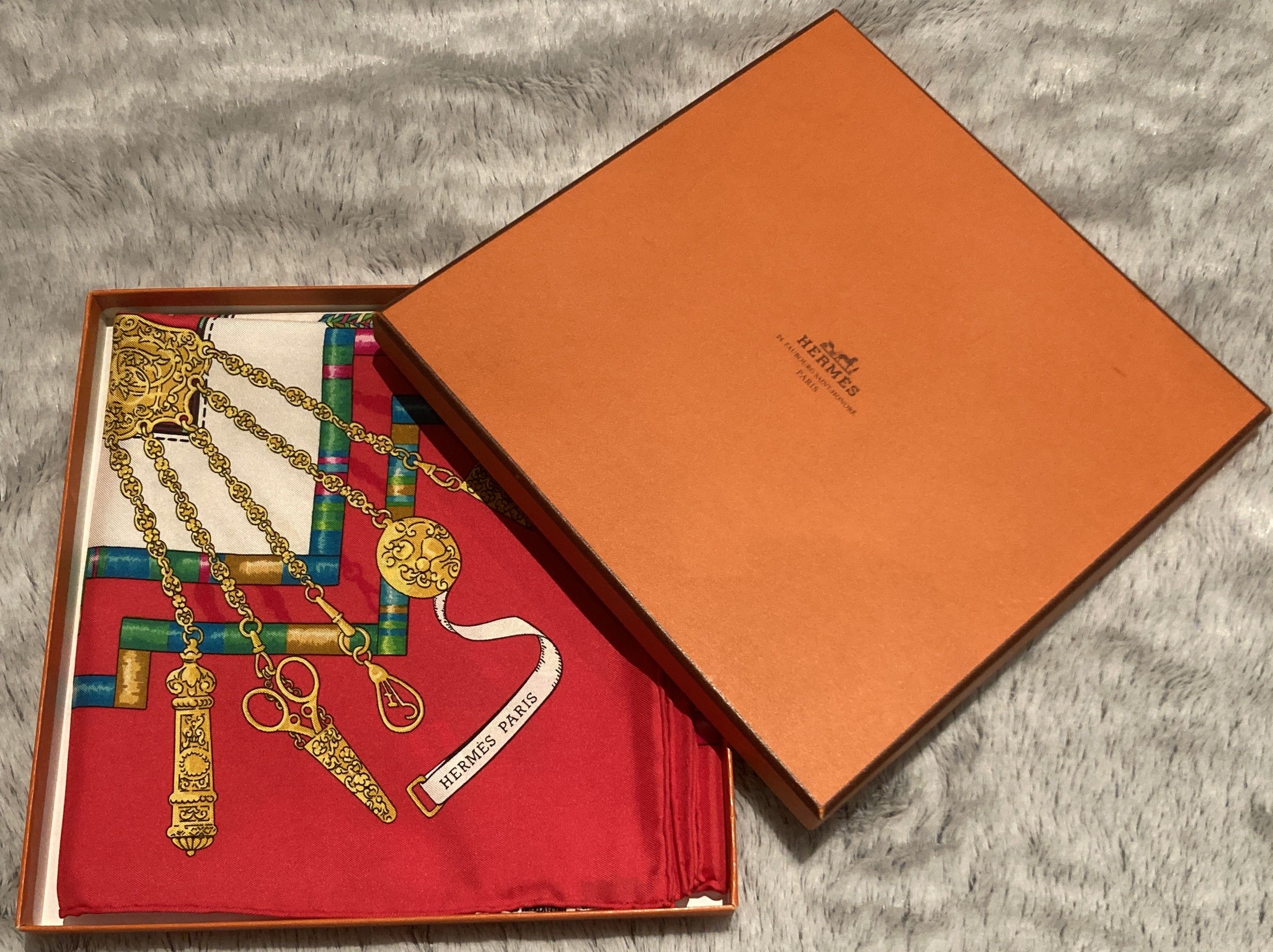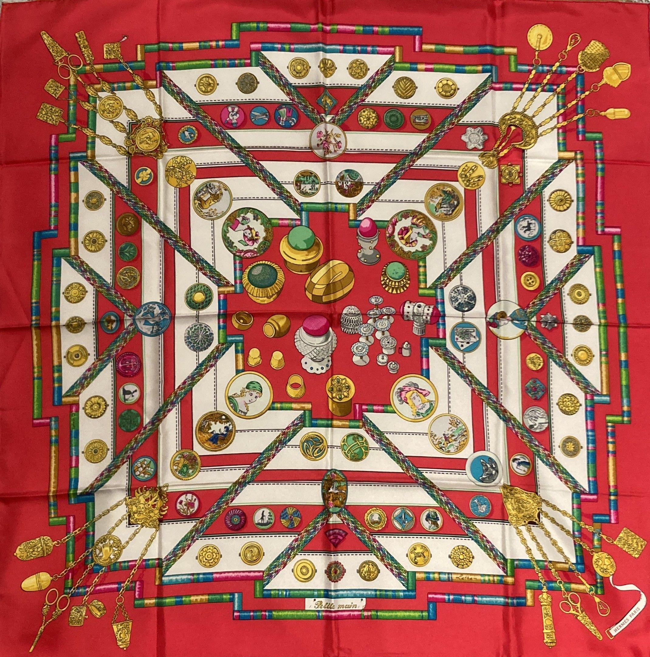 HERMES, Paris. "Petite Main". Carré 90 en twill de soie imprimée (bordure rouge), d'après un modèle de Cathy Latham. Signé, avec étiquette. Très bel état, proche du neuf. Dans un coffret de la Maison.