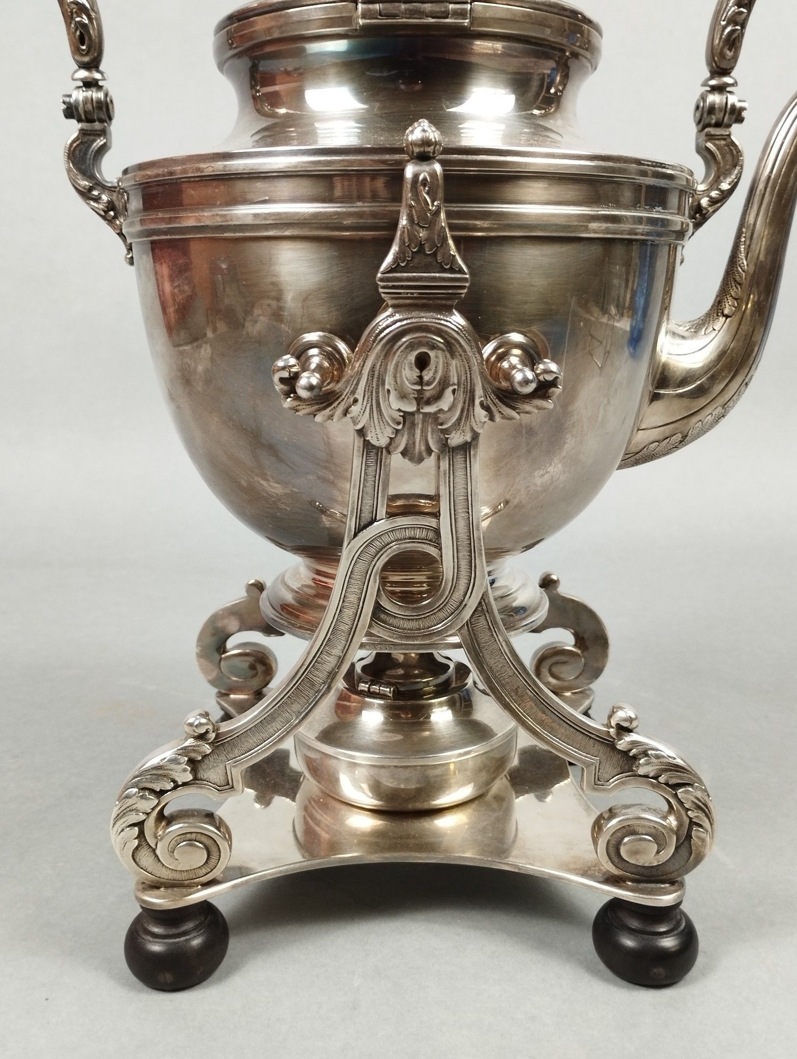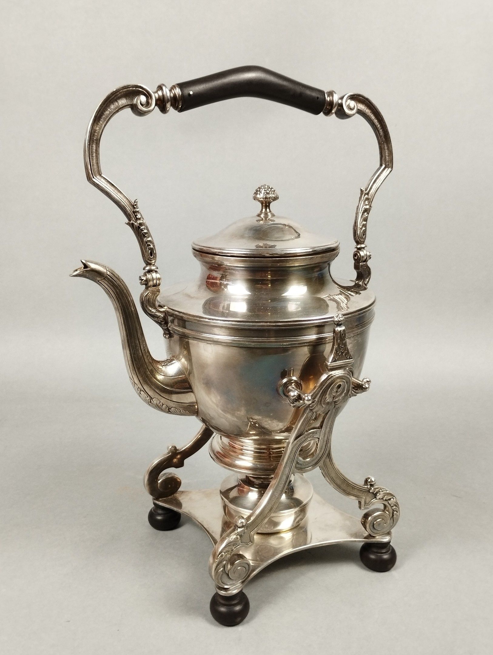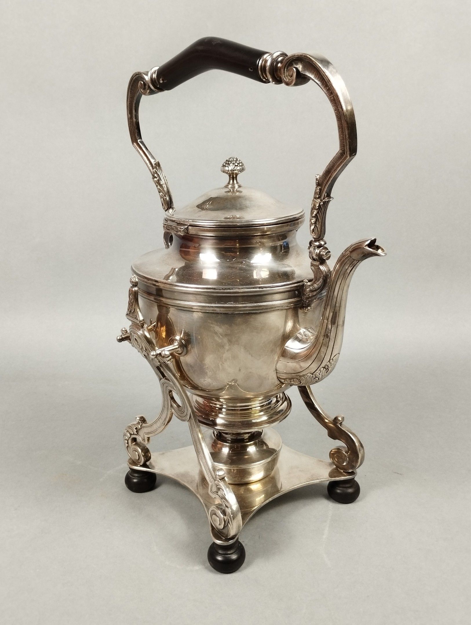 ERCUIS. Fontaine à eau chaude et son support en métal argenté. Le frétel affectant la forme d'une mûre. Signée. H. totale: 39 cm.