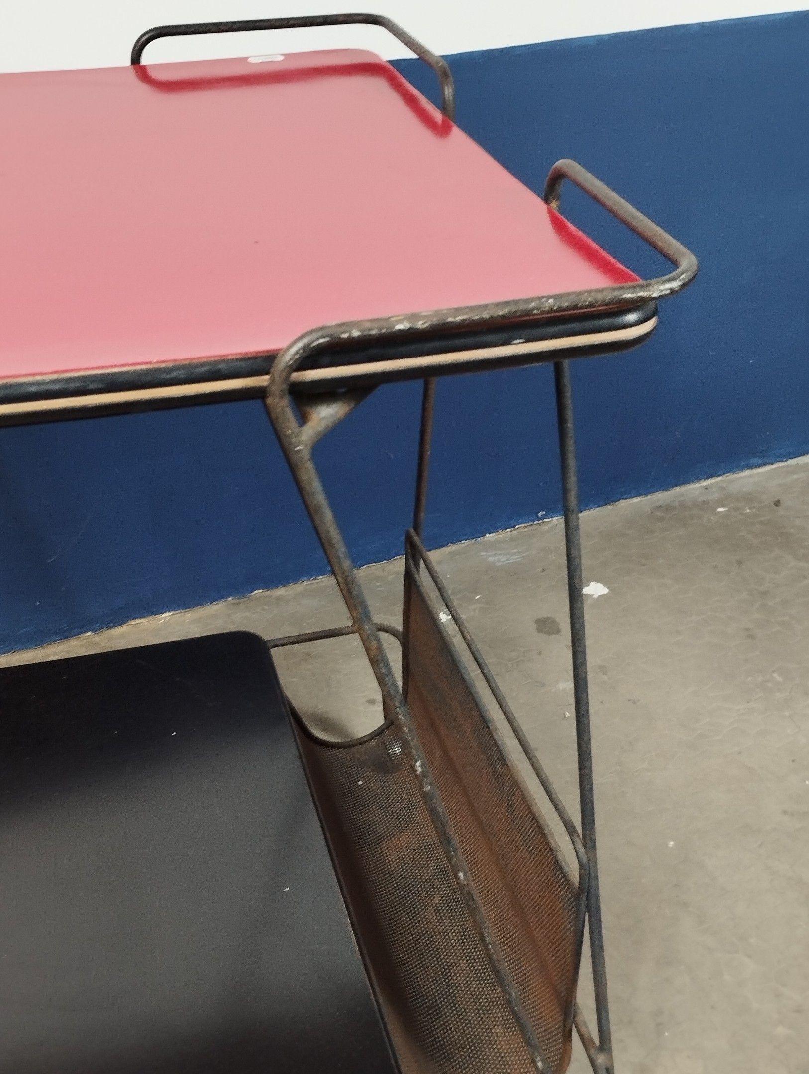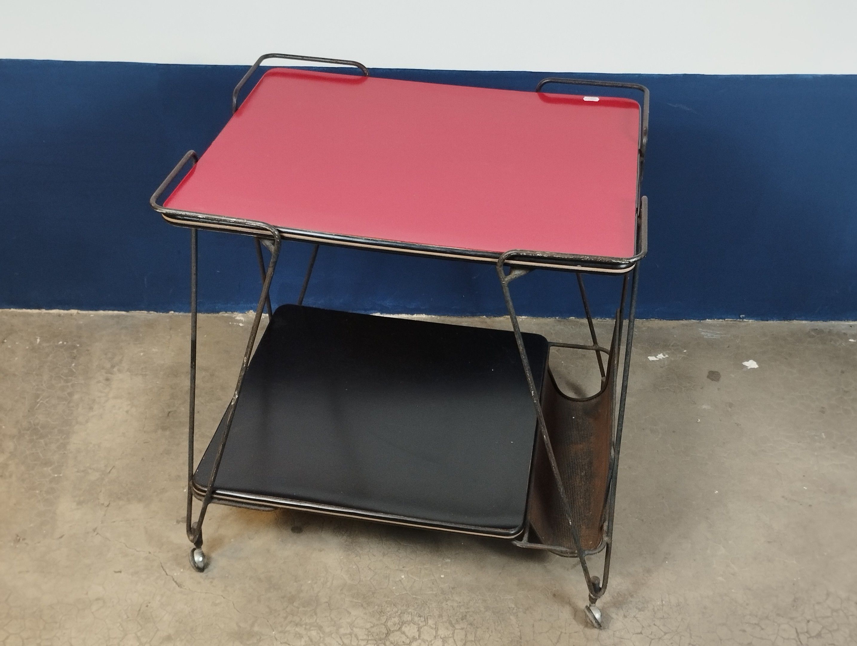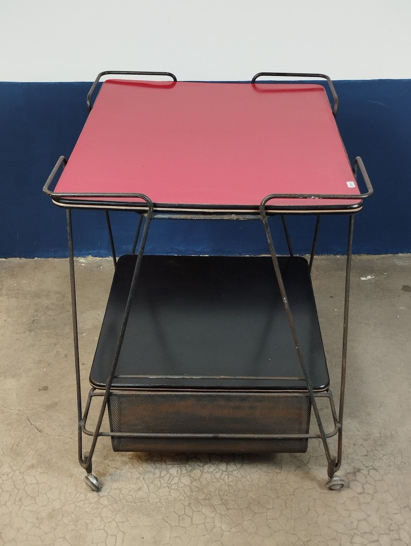 Mathieu MATEGOT (1910-2001). Table desserte roulante "Trolley", à deux plateaux mélaninés stratifiés rouge et noir, et loge en rigitulle. 67 x 56 x haut. 71 cm.