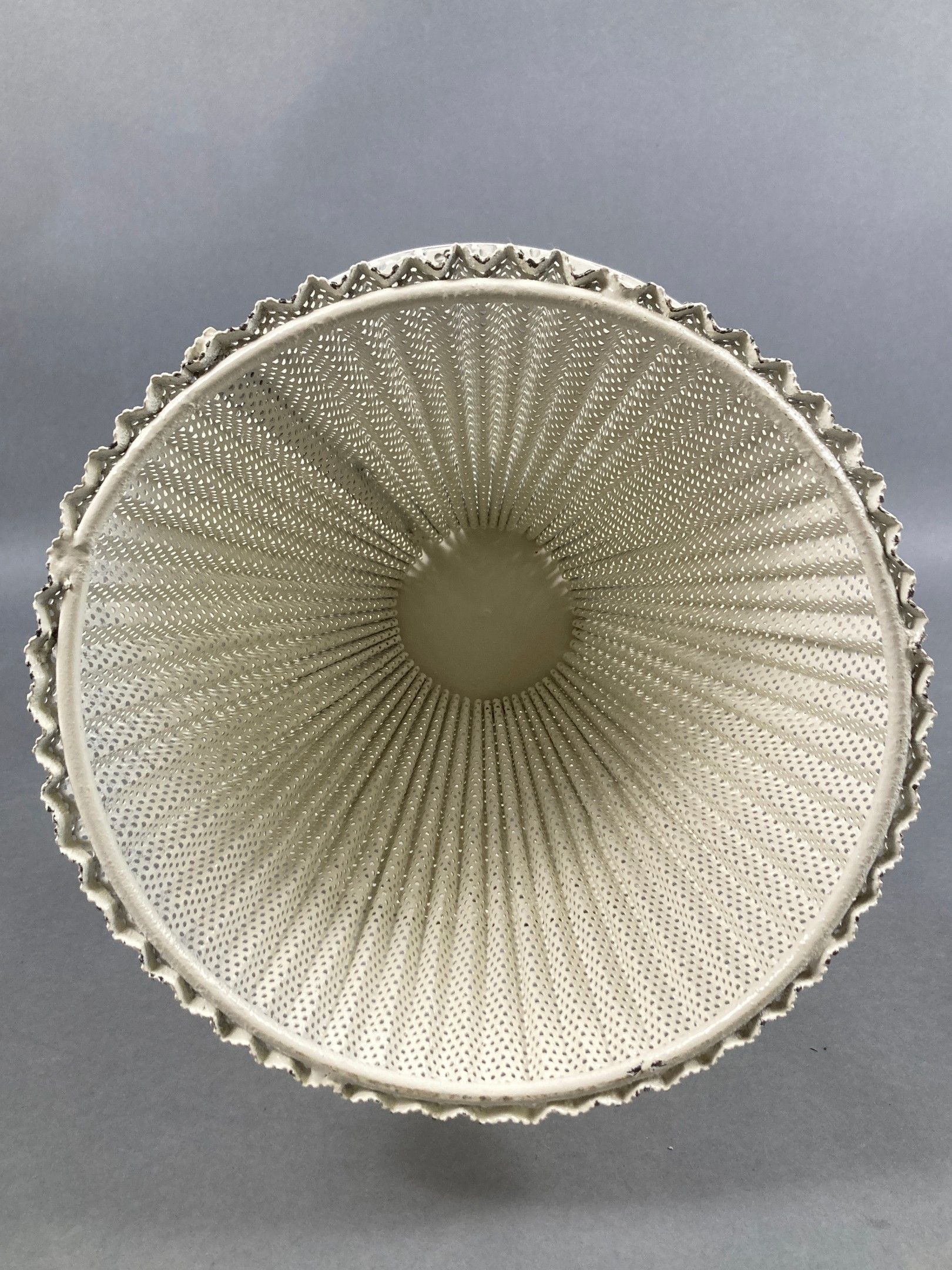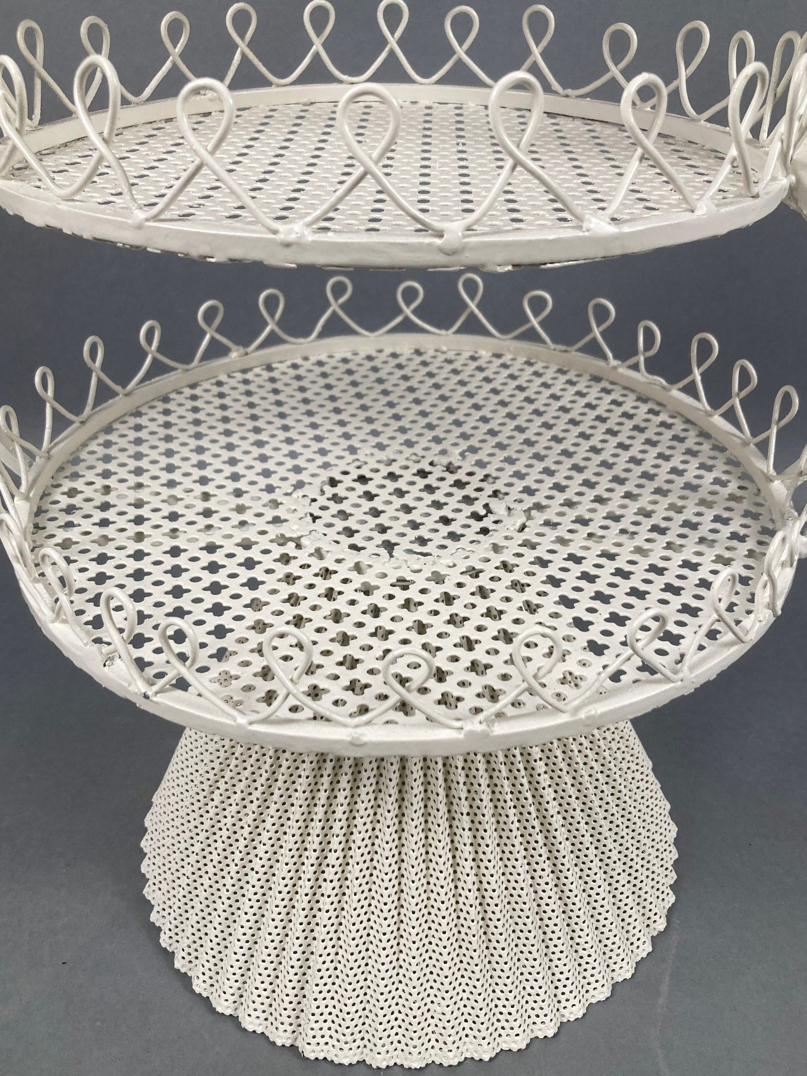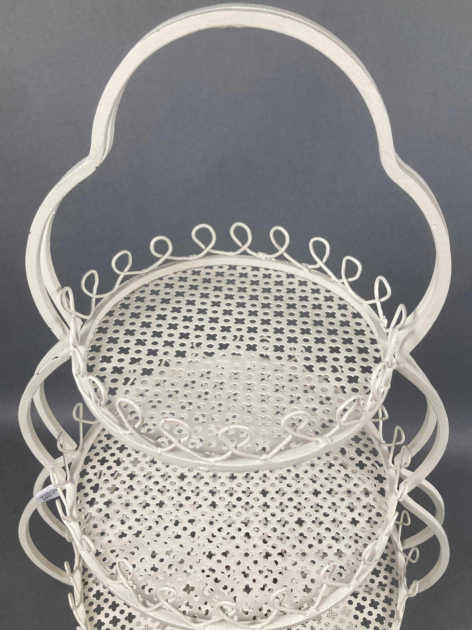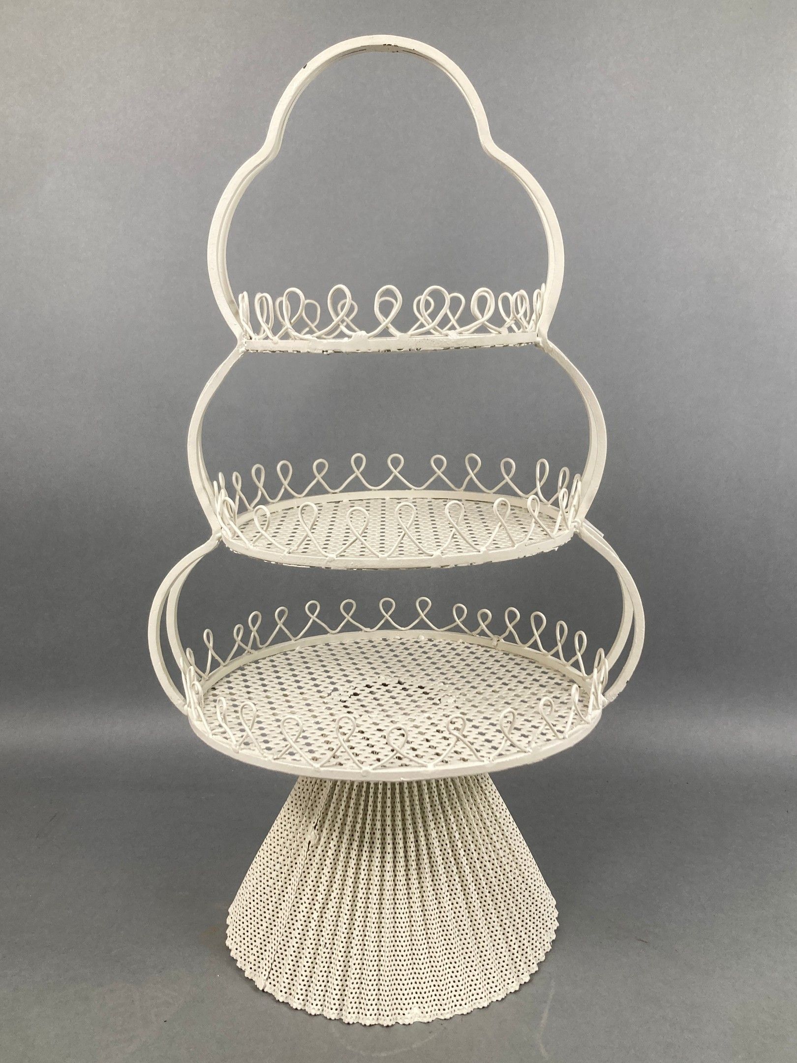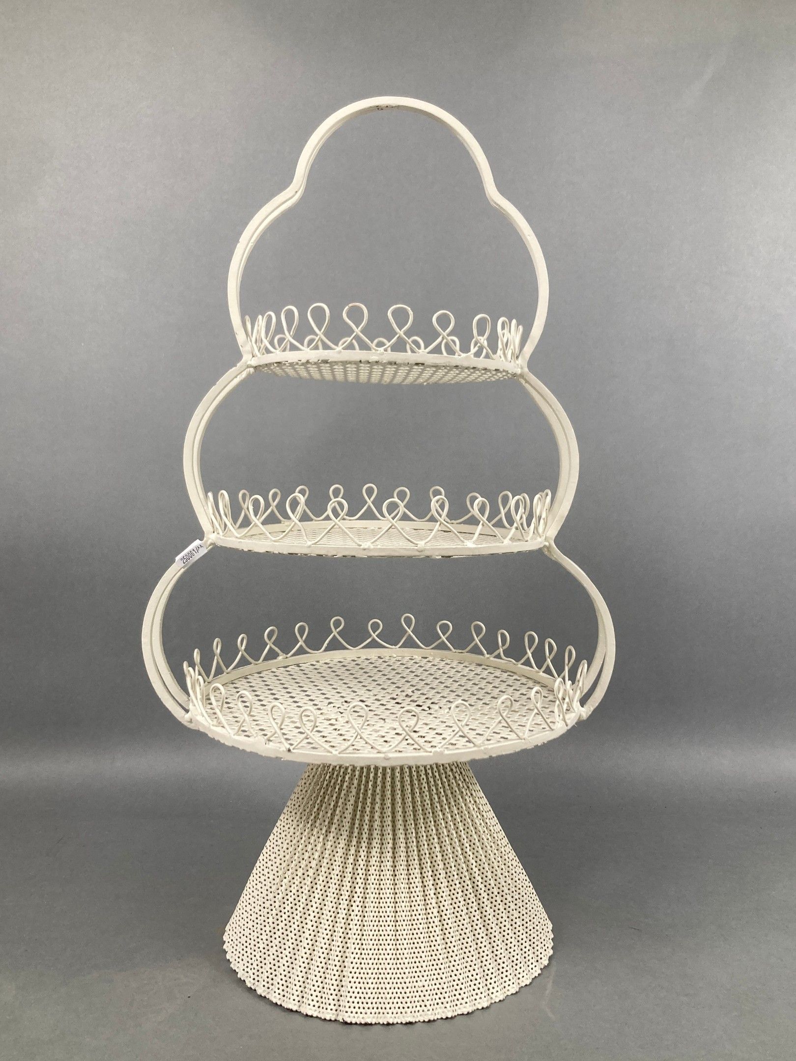Mathieu MATEGOT (1910-2001). Serviteur de table (ou jardinière) à trois niveaux en métal perforé reposant sur un pied conique en rigitulle. Relaqué blanc. Haut. 67 cm.