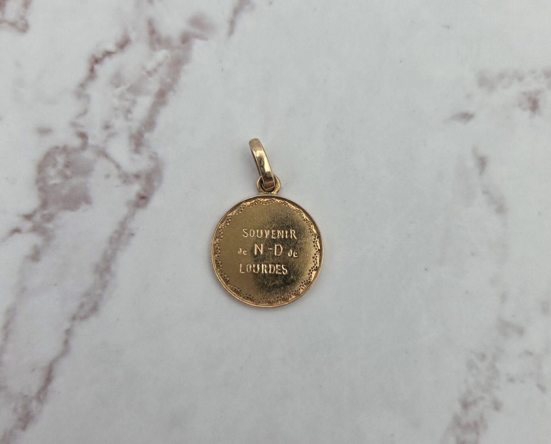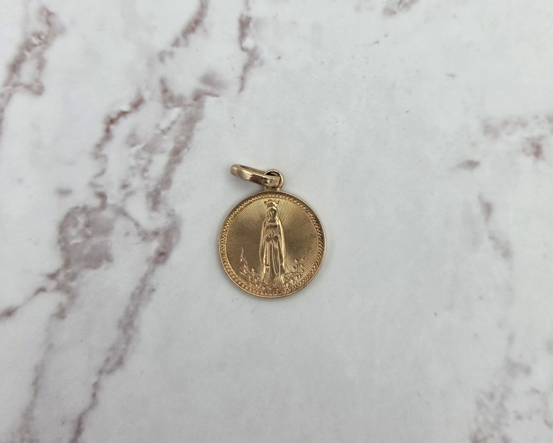 Une médaille ronde en or jaune 750 millième, décors guilloché et gravé d'une vierge en pied - PB : 1.4g - Diamètre : 1.8 cm
