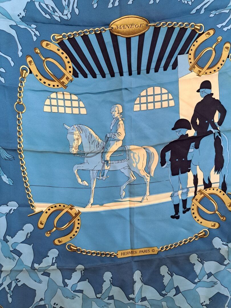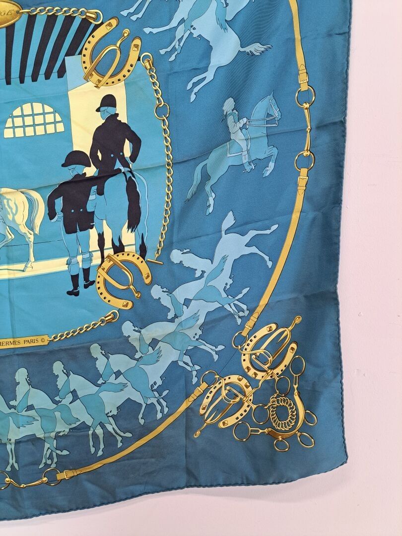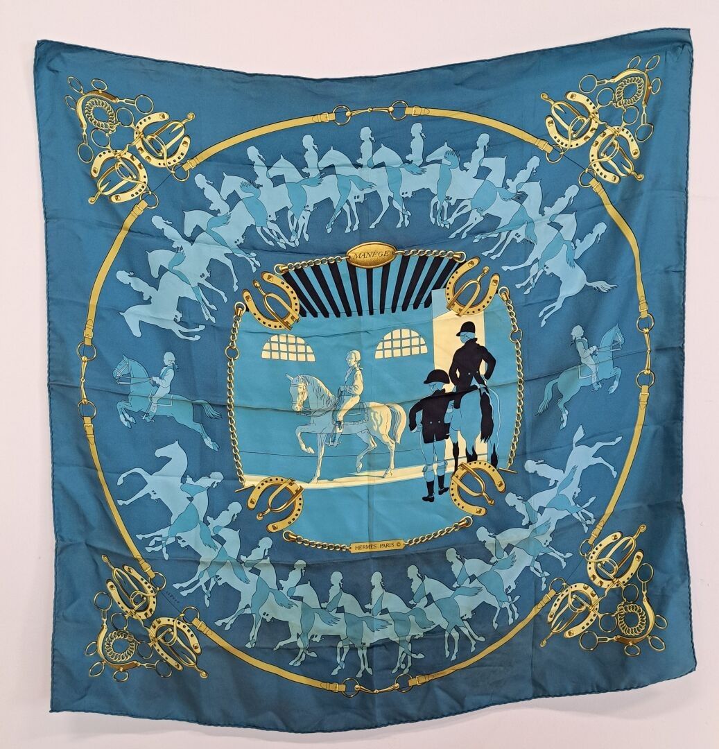 HERMES - Carré en soie "Manège" fond bleu turquoise, 86 x 86 cm, tâches avec sa boîte