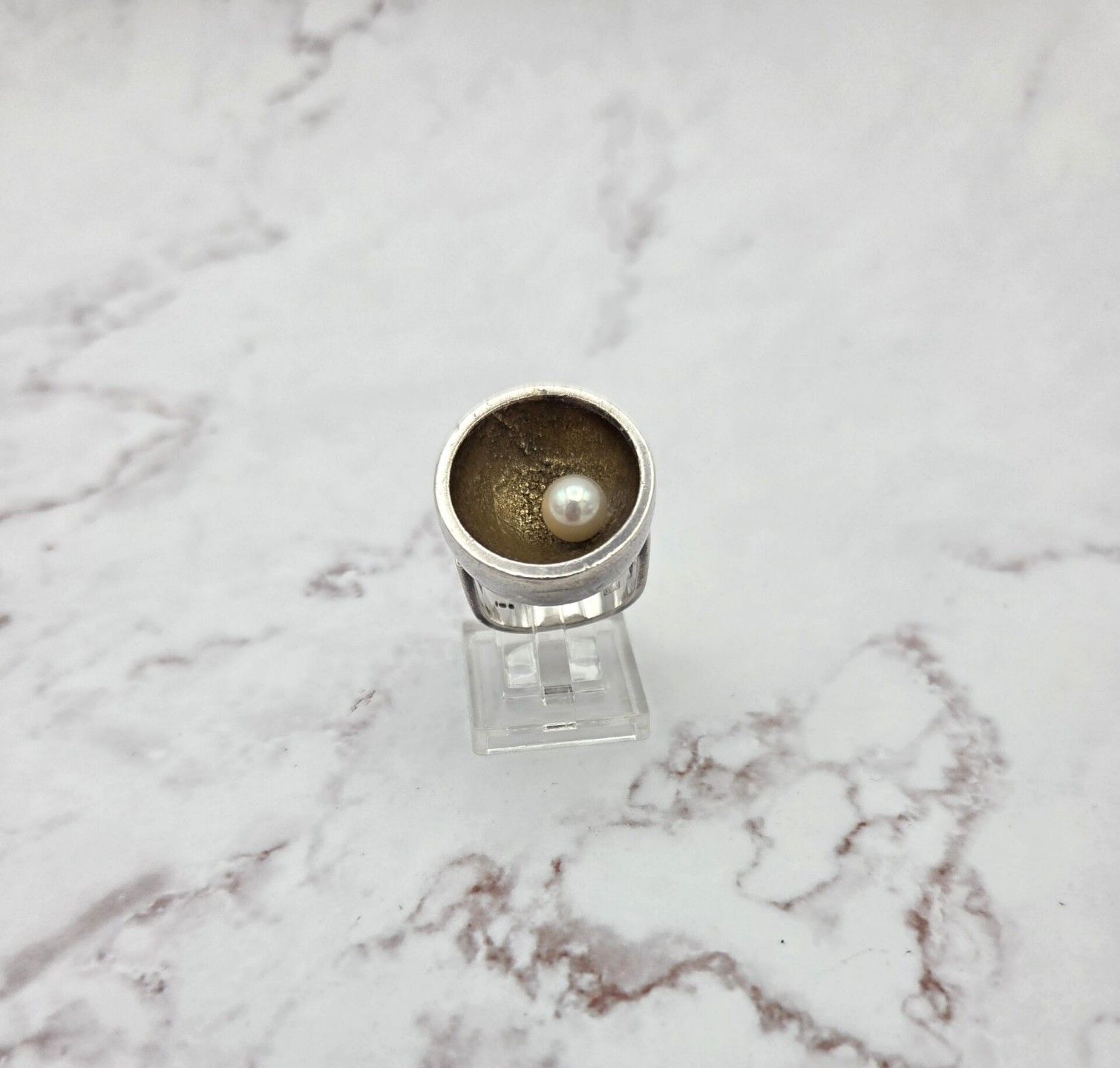 Une bague moderniste en argent, sertie d'une perle de culture - PB : 15.5g - Taille : 55