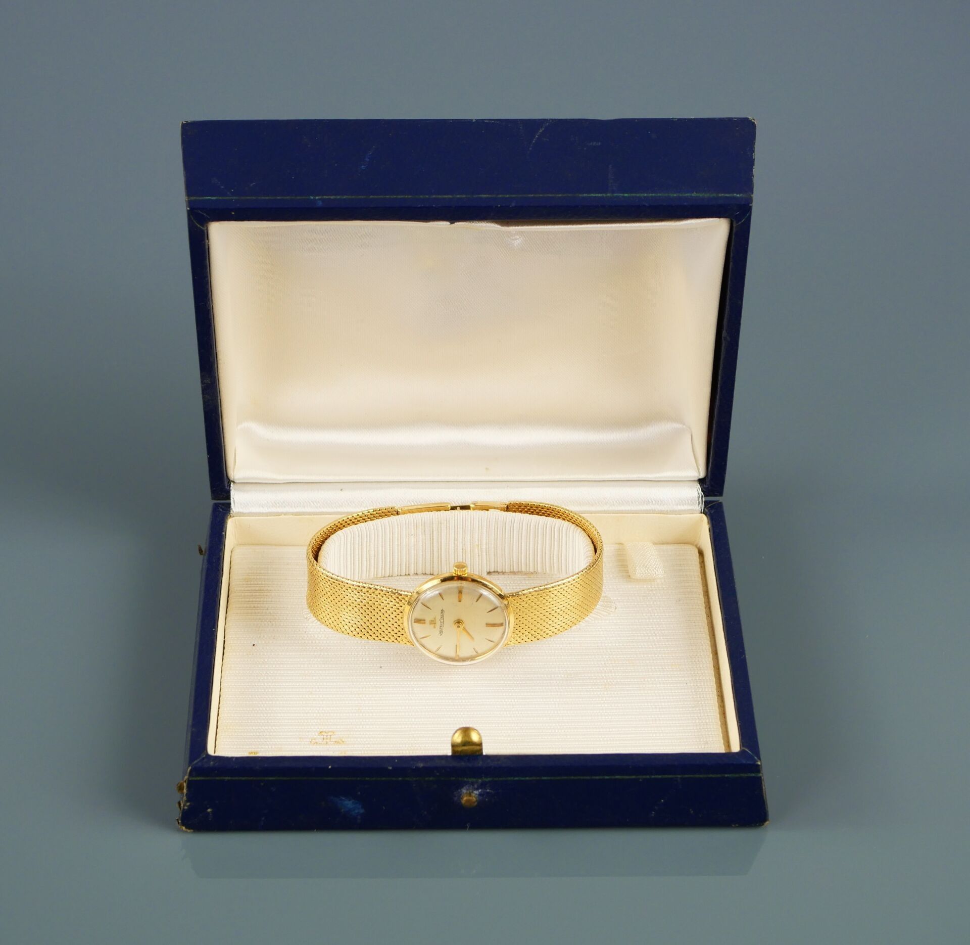 Cadran patiné, signes de vieillissement, manque de matière en périphérie. Poinçon de maître «L.C » pour LeCoultre à l'intérieur du boîtier. Poinçon de garantie suisse sur le boîtier. Poinçon tête d'aigle sur le fermoir du bracelet. Un marquage d'horloger dans le fond de boîte. Révision conseillée.