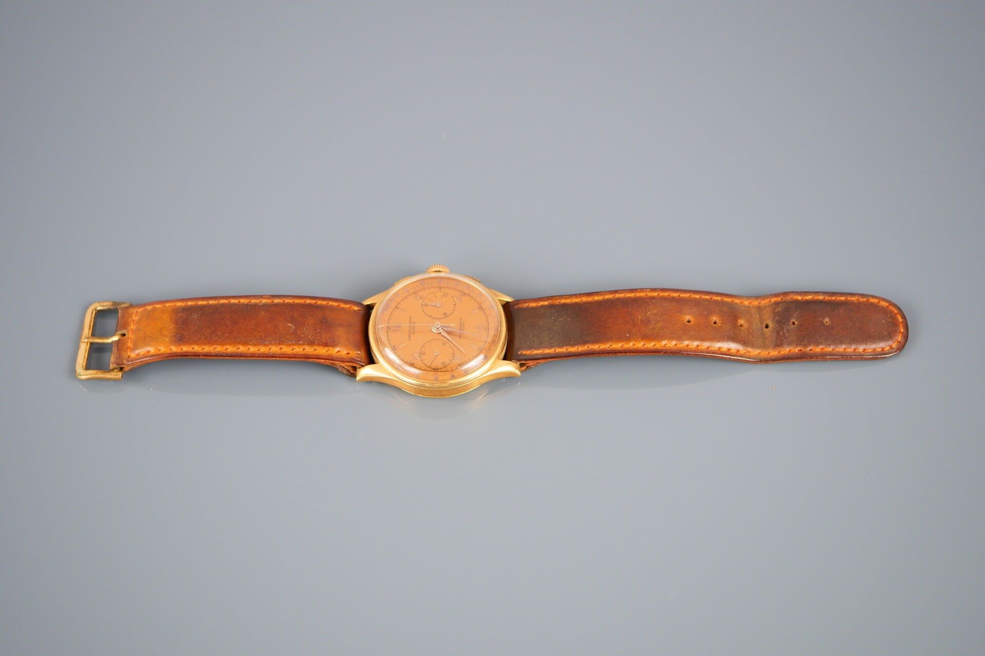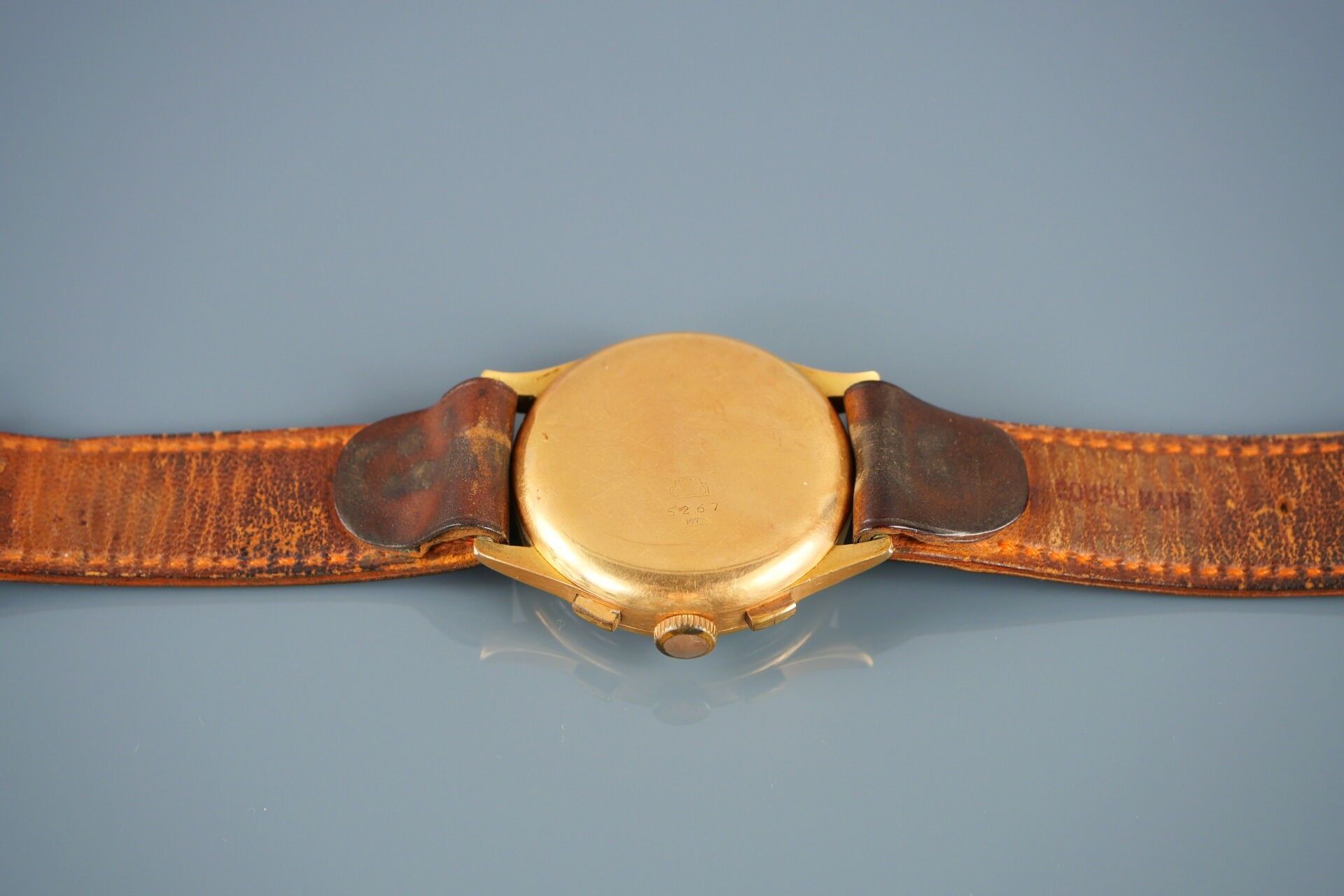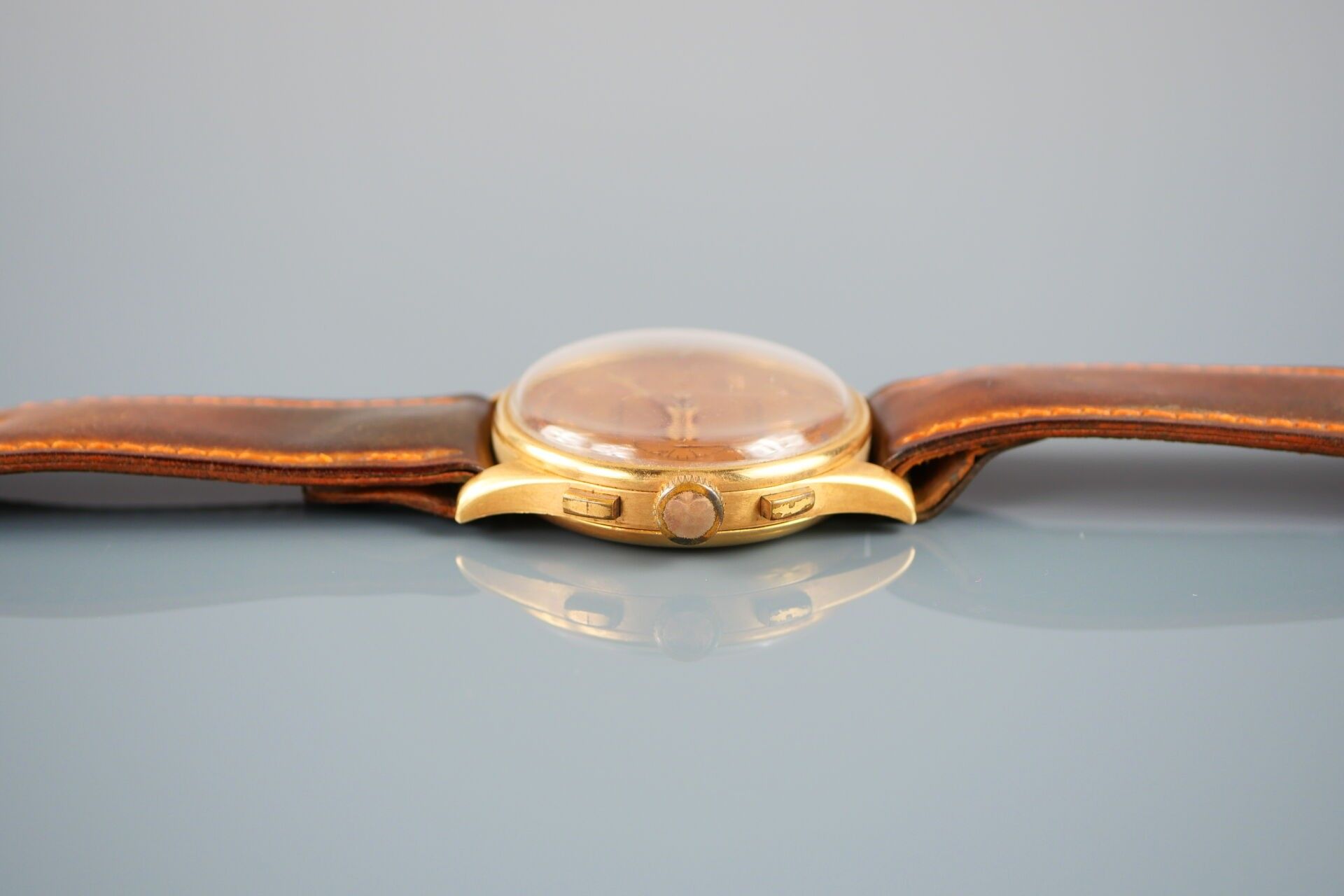 Mouvement et fonction chronographe (start / stop / reset) opérationnels au moment de la rédaction du catalogue. Révision conseillée. Cadran en bon état. Signes d'usage. Clef de fabricant n° 167. Un marquage d'horloger visible à l'intérieur du boîtier.