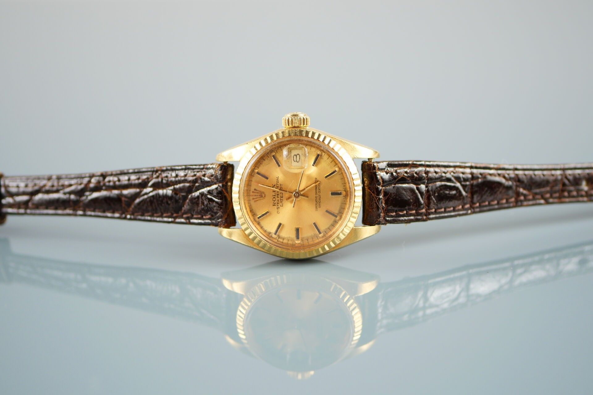 Cadran doré, index « bâton » appliqués, plots luminescents, trotteuse centrale, date à guichet, signé