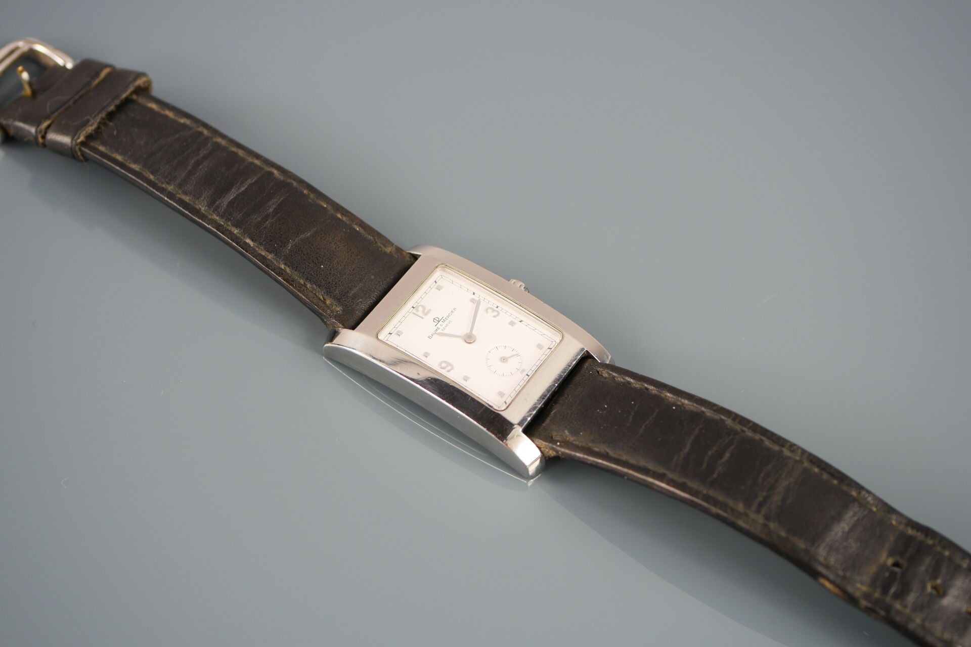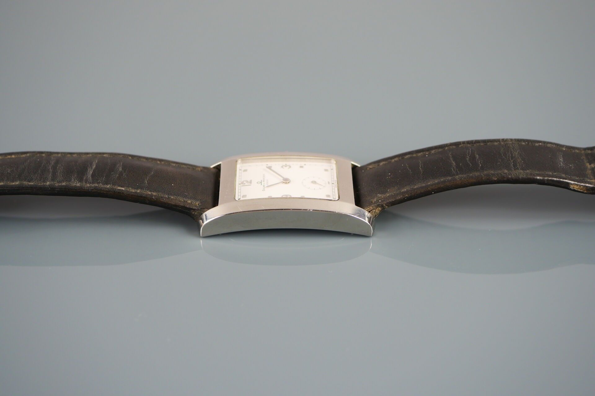 Cadran blanc, chiffres arabes et index appliqués, minuterie chemin de fer, trotteuse excentrée, signé