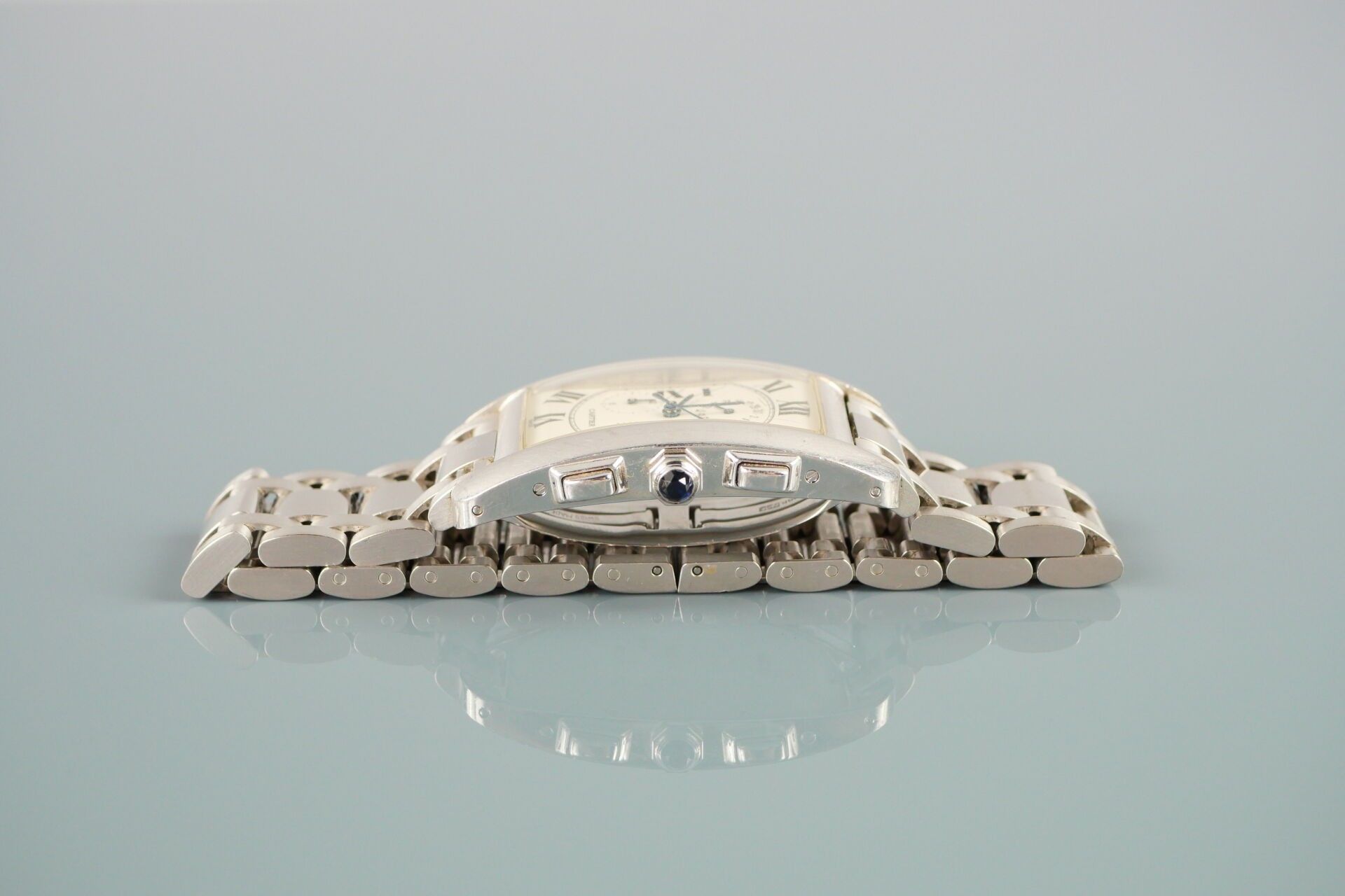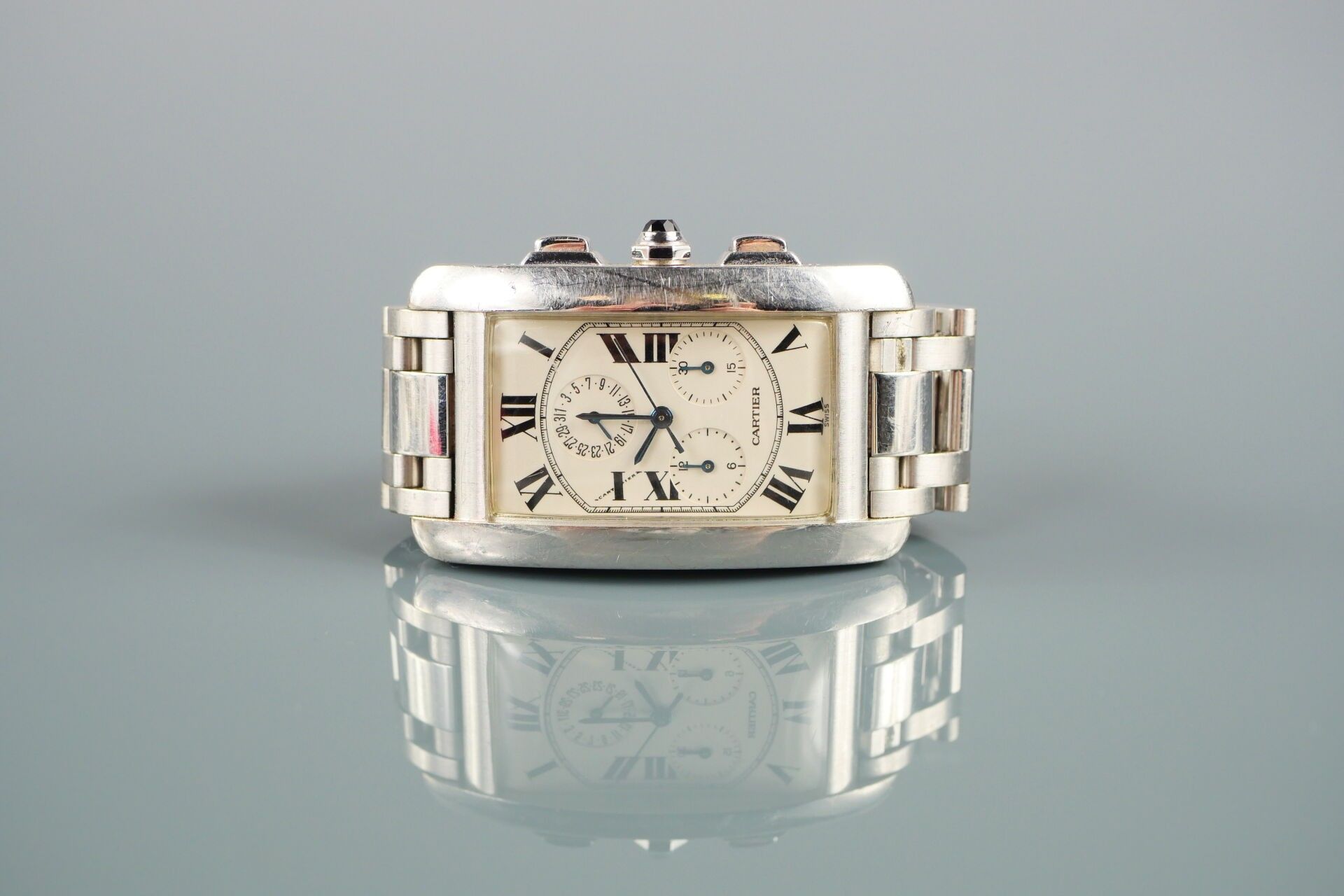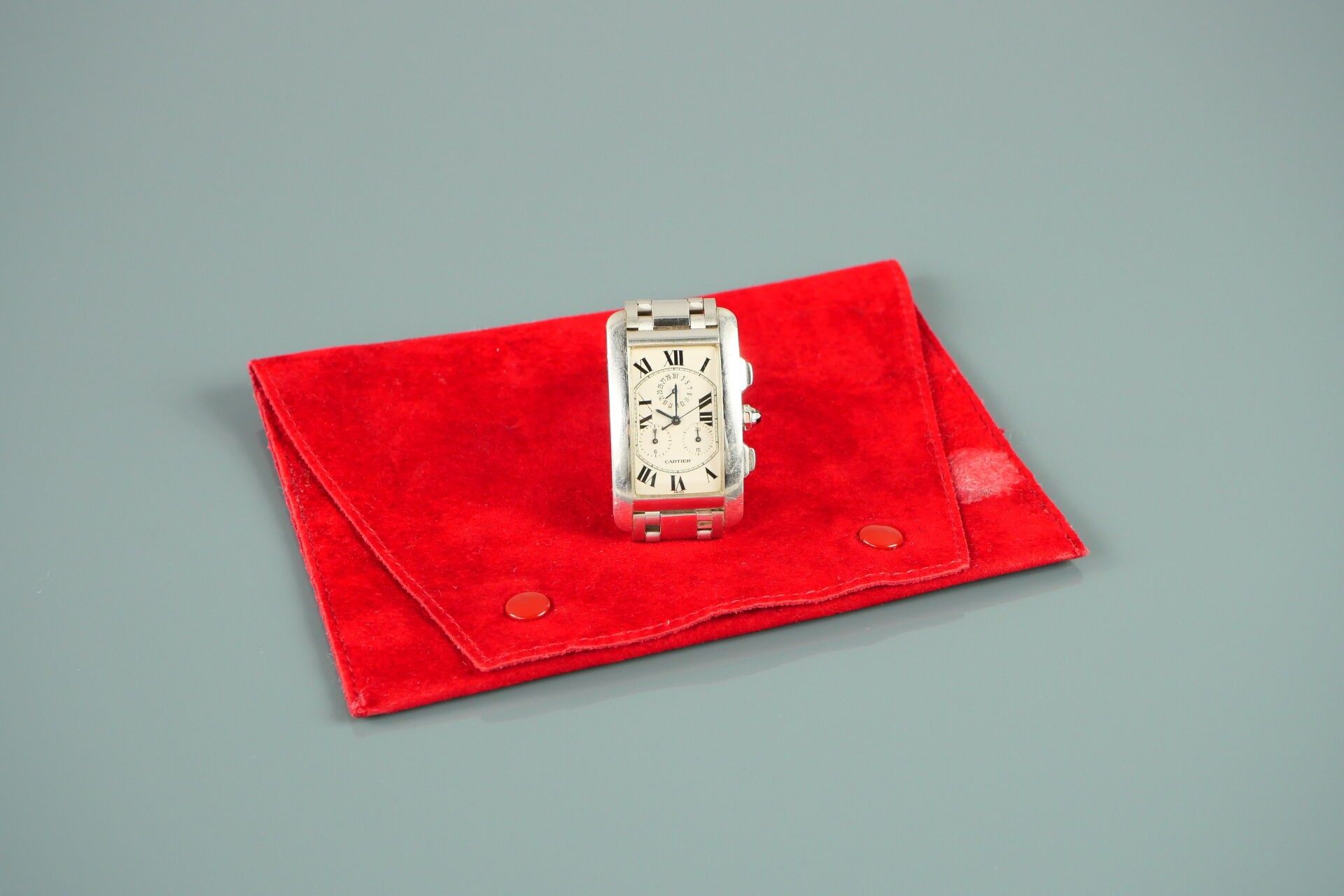Introduite en 1989 dans les collections Cartier, la Tank Américaine s'inspire du design de la Tank Cintrée des années 1920. En 1994, apparaît une version chronographe commercialisée sous la référence 2312 et équipée d'un mouvement à quartz Chronoflex. Inventé en 1991 par Piaget, le Chronoflex est alors l'un des plus petits mouvements à quartz du monde. Compilant un calendrier et un chronographe, cette montre reste une montre spéciale dans l'univers Cartier.