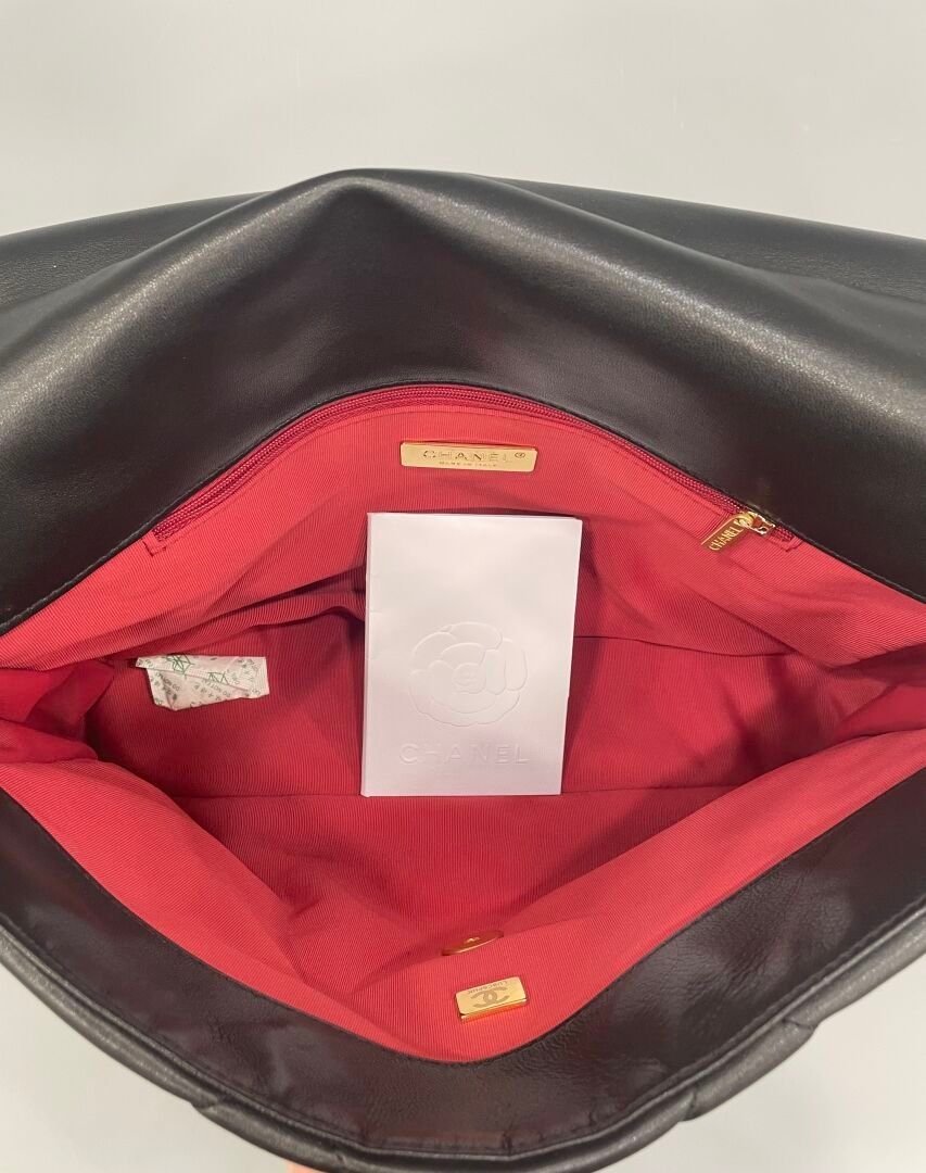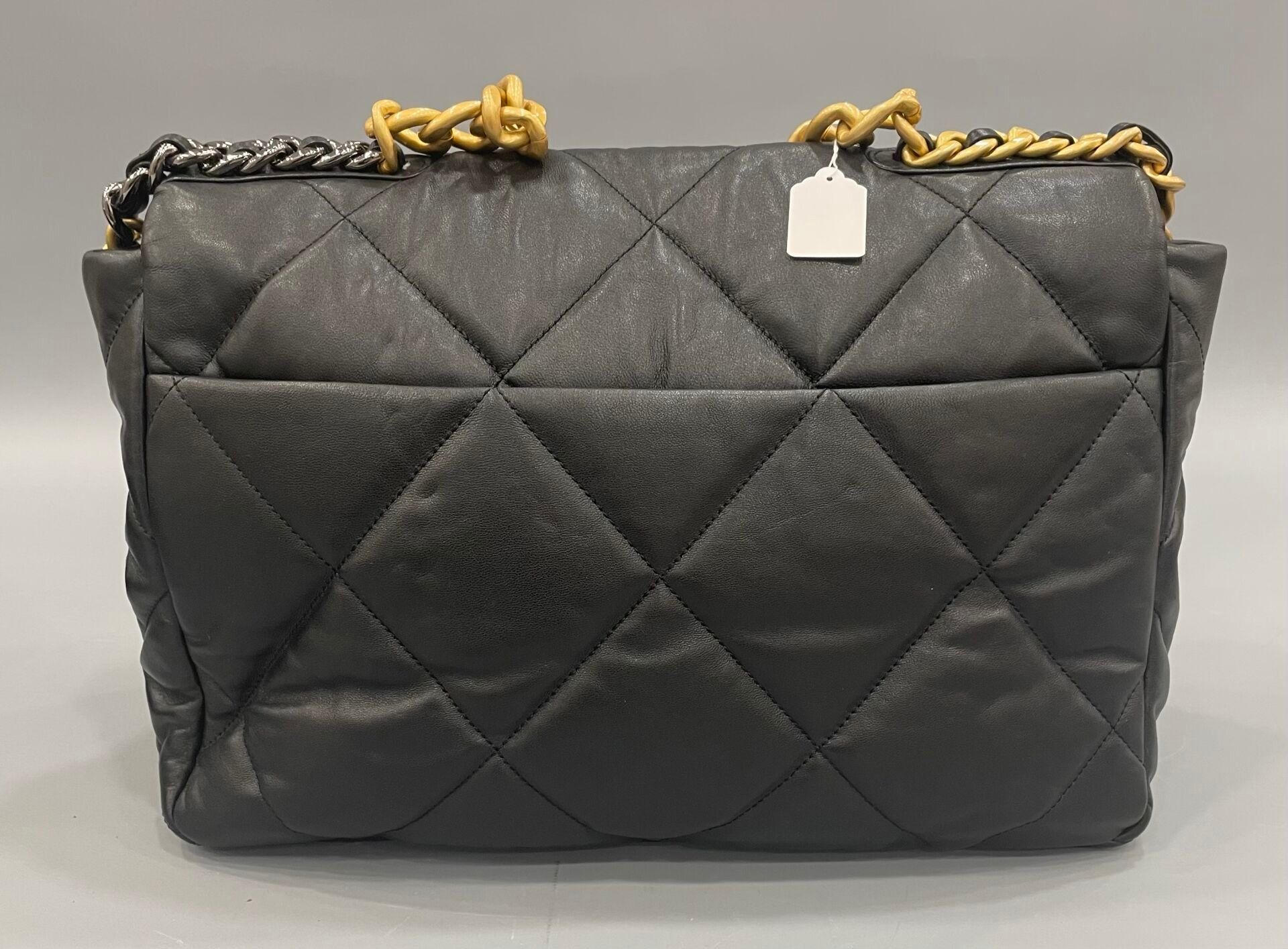 CHANEL Sac à main/épaule modèle '19' grand modèle en agneau souple noir, poignée chaine comportant plusieurs finitions. Doublure en tissus rouge, 1 poche arrière fermeture aimanté (quelques petites usures et légères griffures)