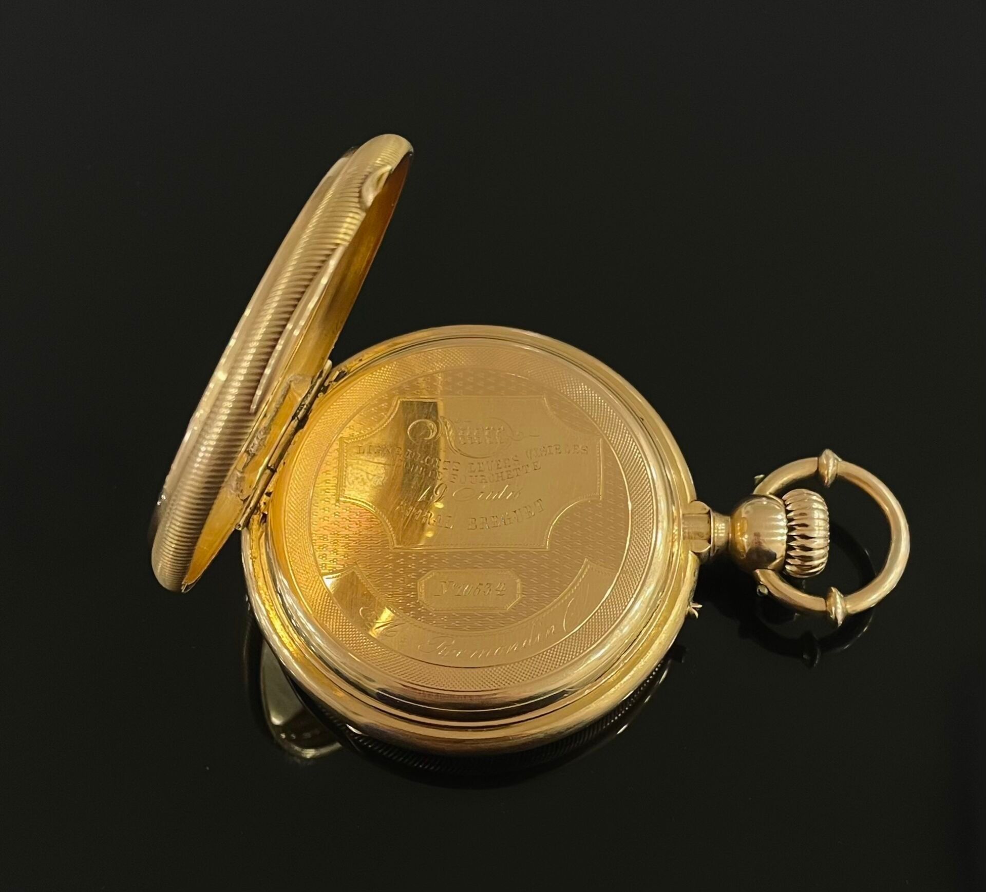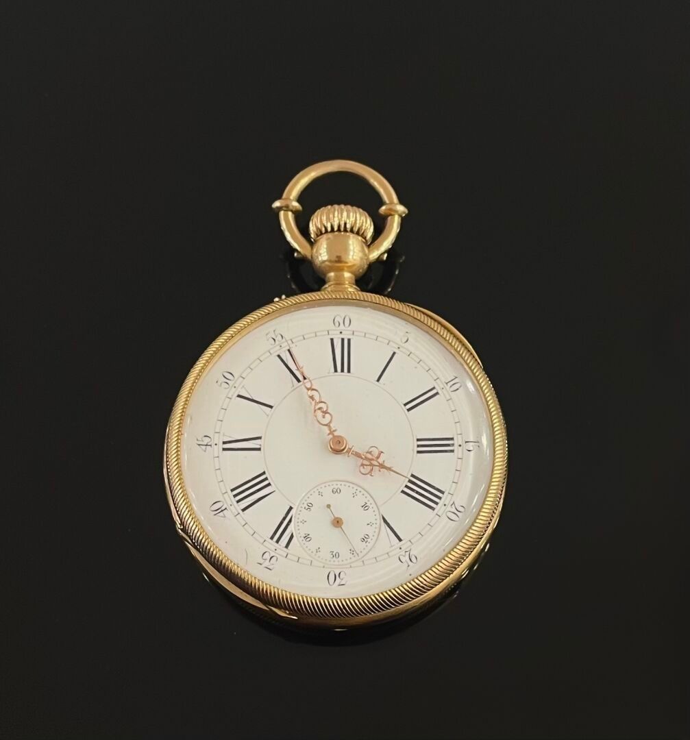 MONTRE à gousset en or jaune (750), le cadran émaillé blanc indiquant les heures en chiffres romains. Intérieur gravé "Ancre, ligne droite, levées visibles, courte fourchette, 16 rubis, Spiral Breguet et numérotée 10534.