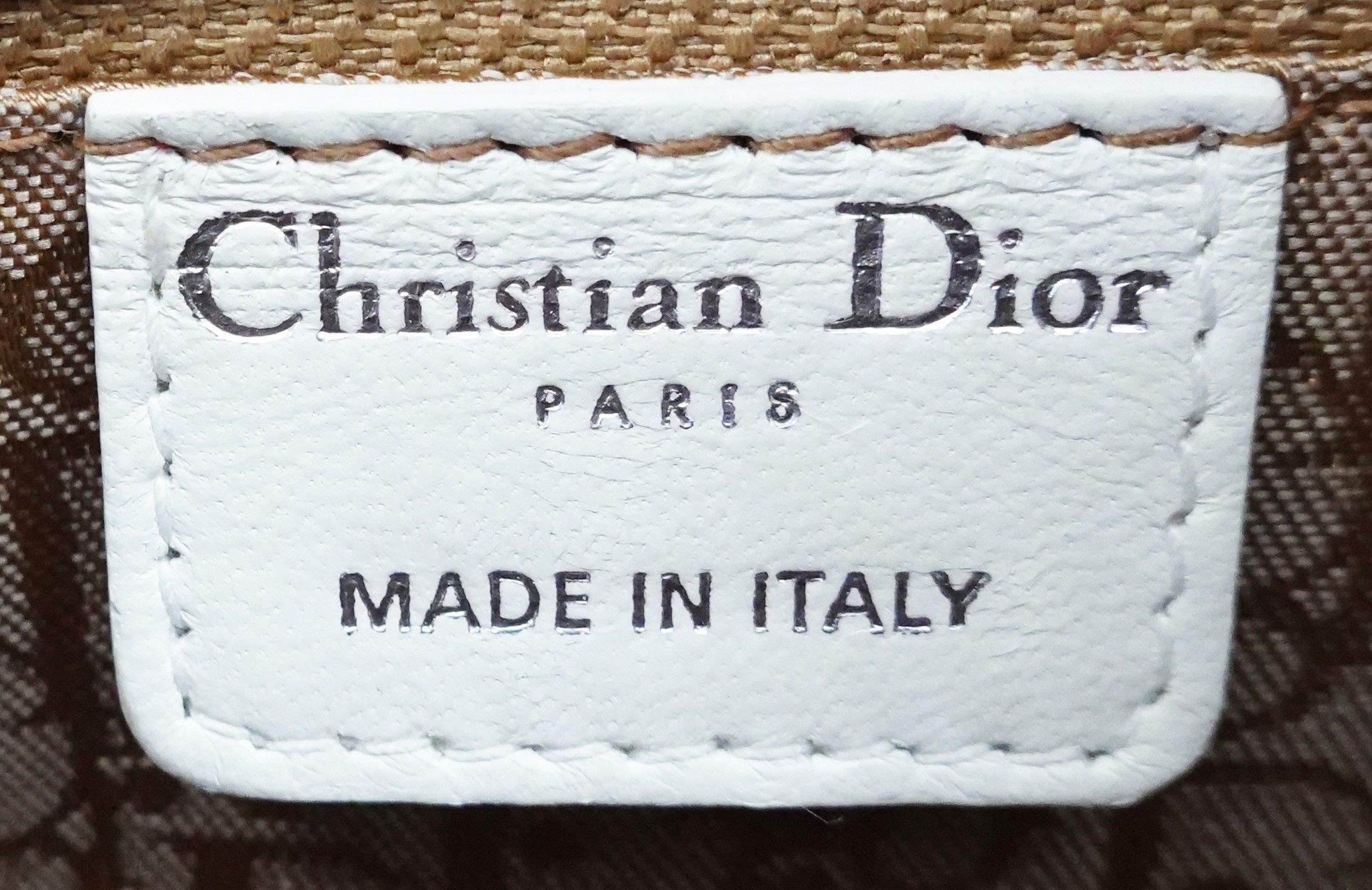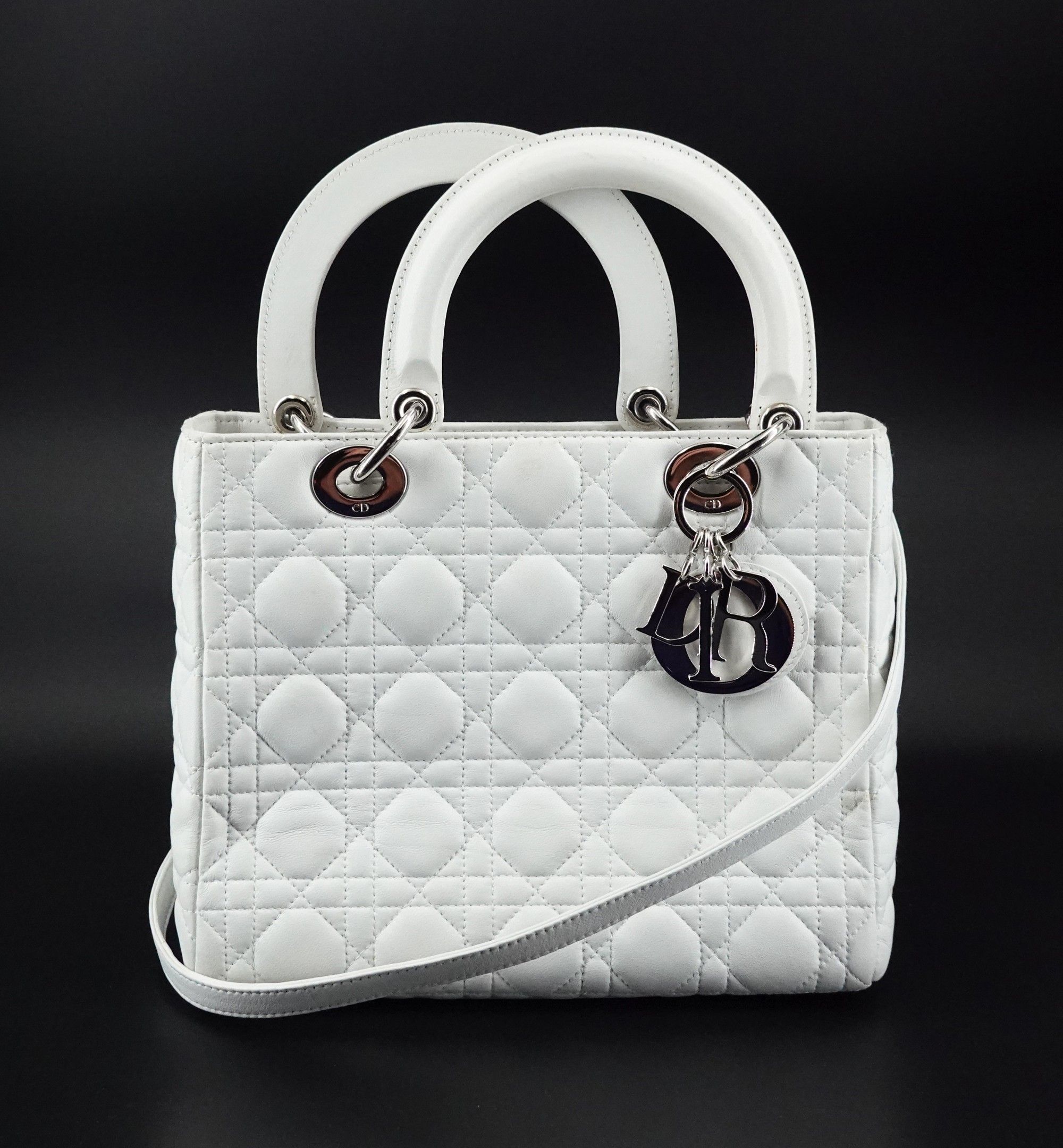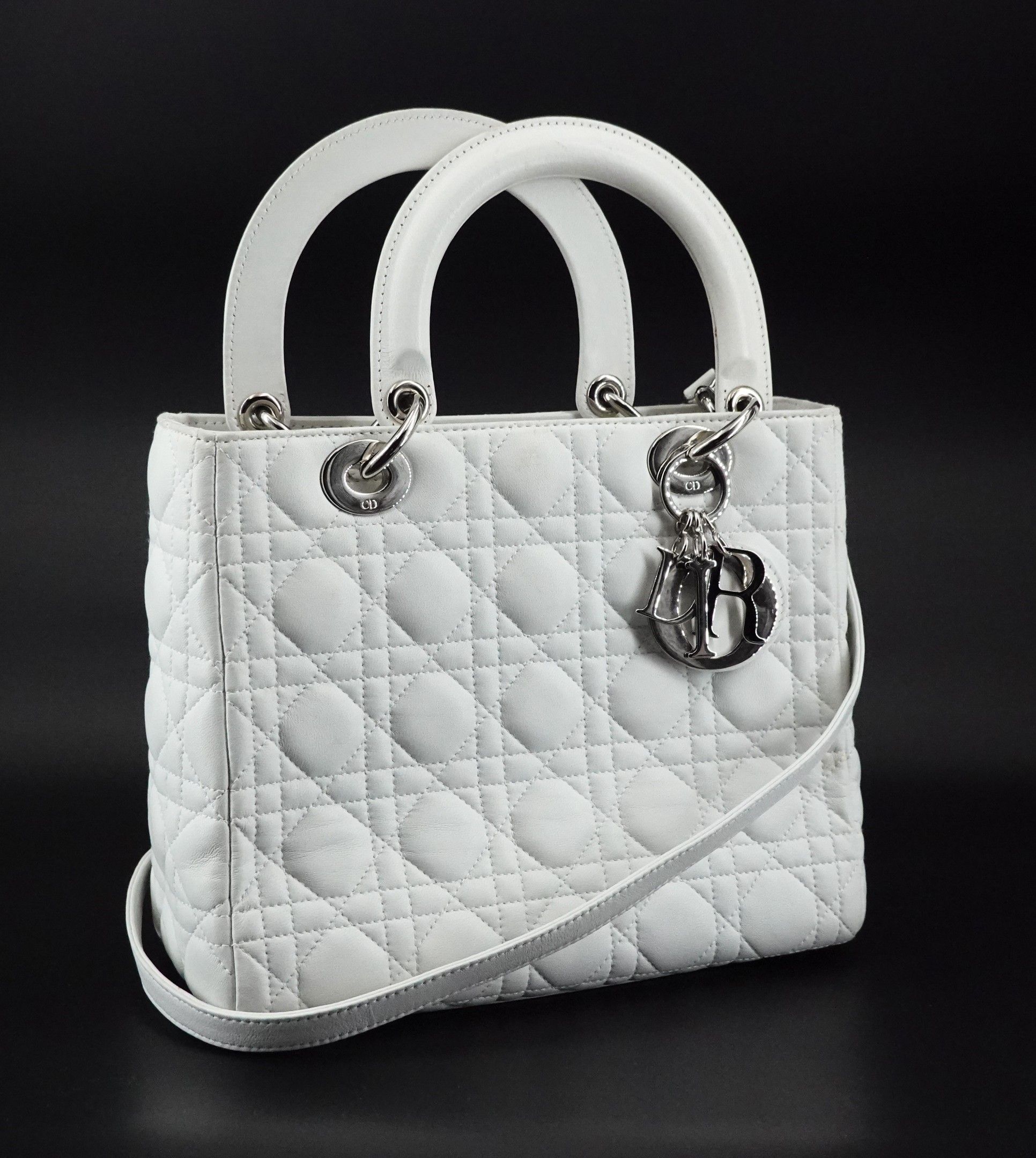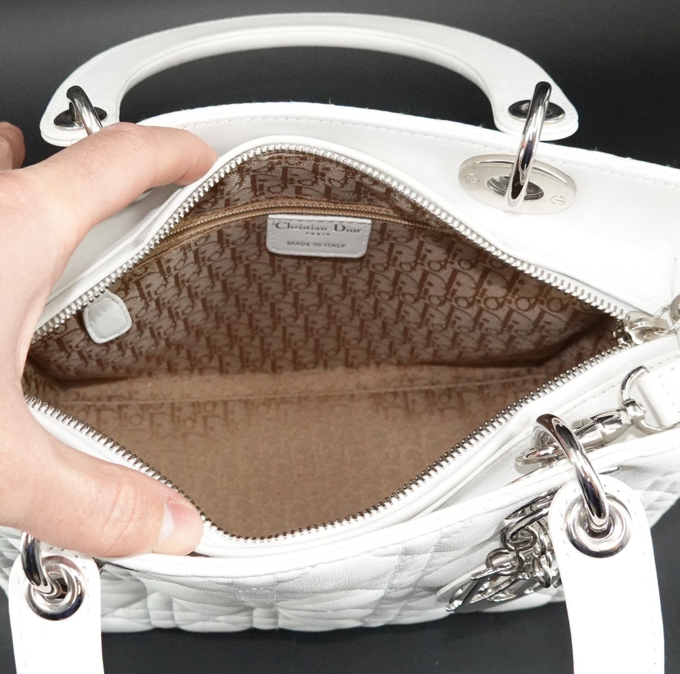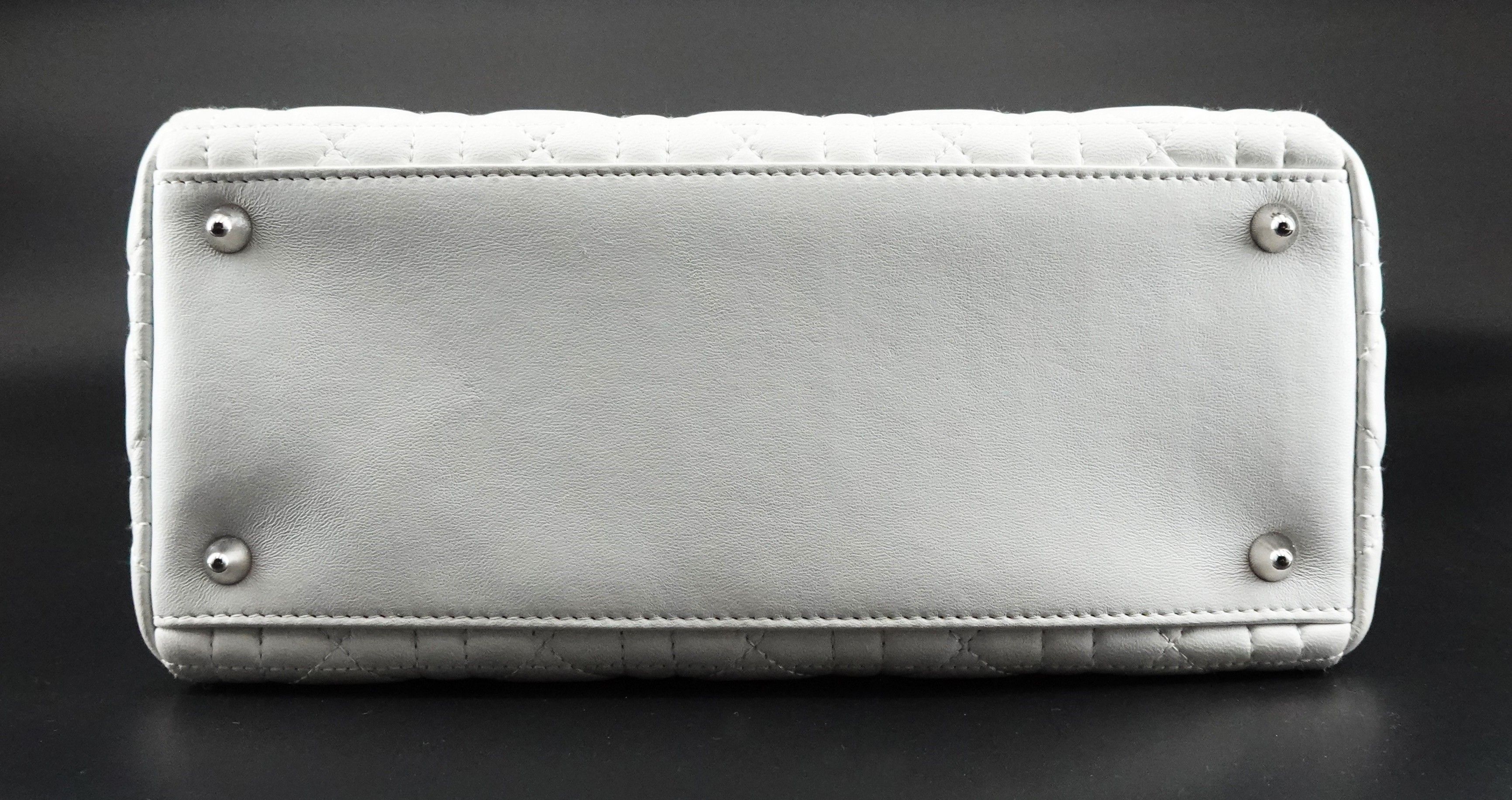 Sac à main en cuir blanc à surpiqûres cannage, deux anses et une bandoulière, bijouterie argentée, breloque DIOR en cuir et métal argenté, fermeture par système zippé, intérieur en tissu « Dior » avec poche zippée, signé et numéroté 02-BN-0097.