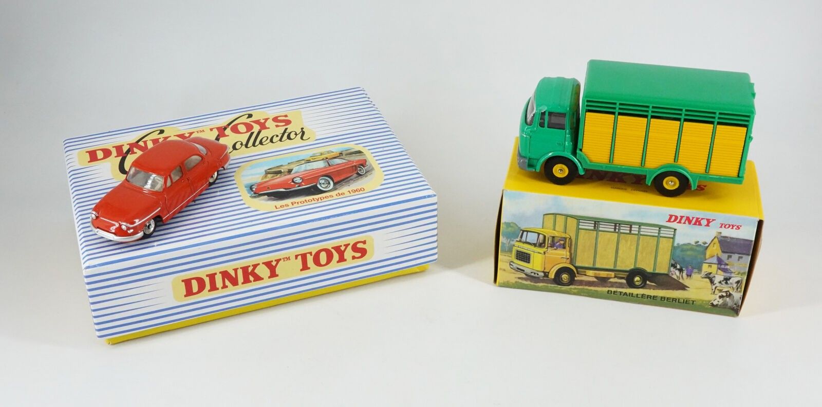 REEDITIONS DINKY TOYS Lot composé d'un coffret collector « Les prototypes de 1960 » -(une voiture manquante) et une bétaillère Berliet en boîte