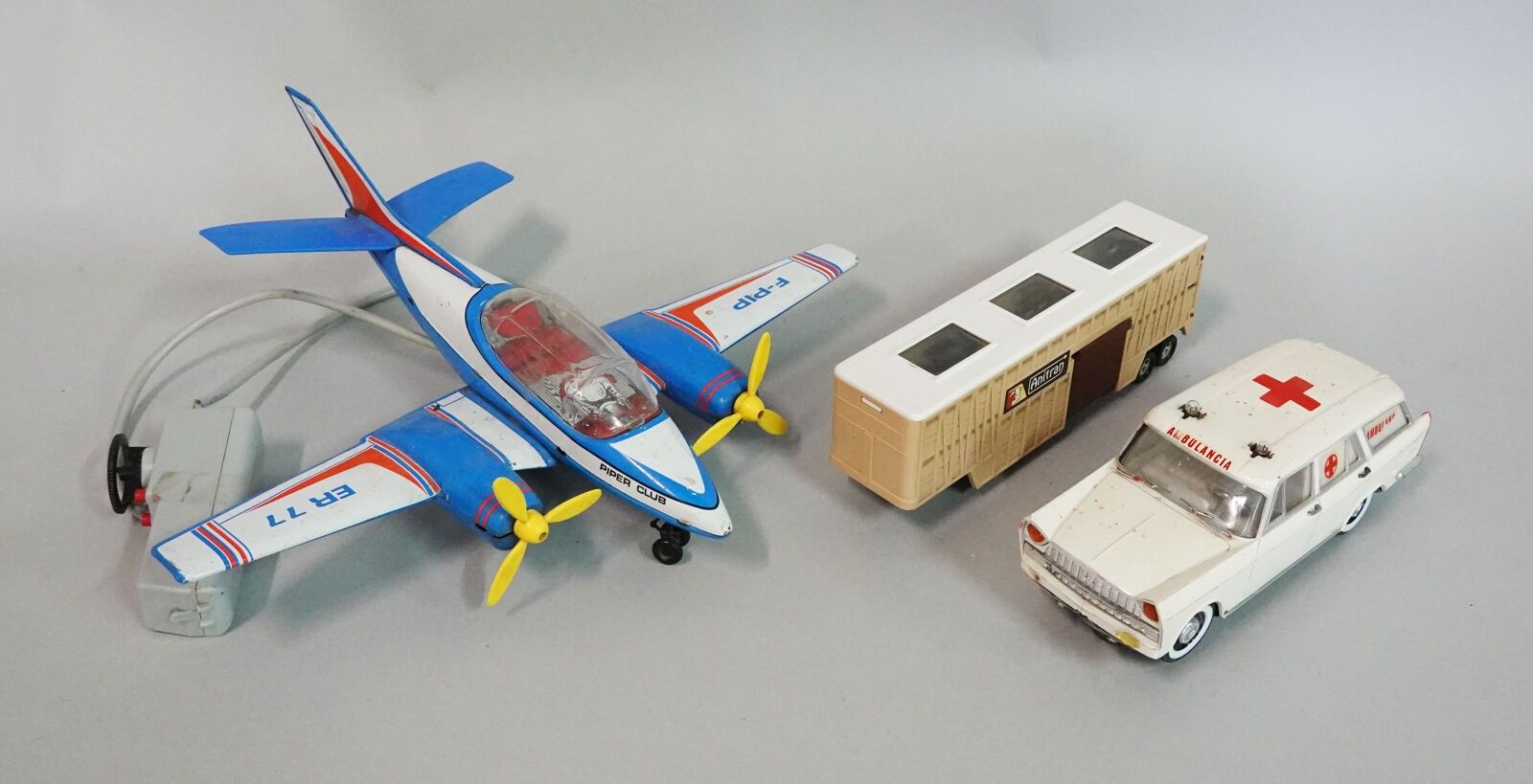 Lot comprenant un avion électrique Piper Club F-PIP ER 77 avec sa télécommande, une ambulance RICA et une bétaillère MATCHBOX