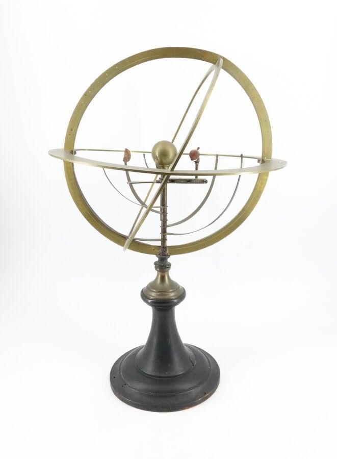 Sphère armillaire planétaire type copernicien en laiton sur une base en bois noirci avec le soleil au centre et tiges mobiles en laiton pour déplacer les planètes (planètes absentes, seule la Terre est présente), deux cercles des solstices et équinoxes et un cercle d'horizon, XIXe s.