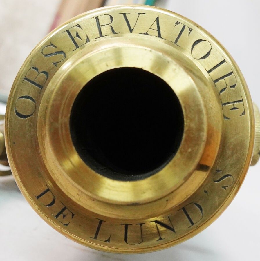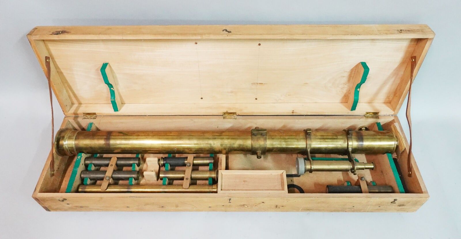 Télescope en laiton avec sa caisse de rangement en bois et ses optiques, avec son trépied. Inscription « OBSERVATOIRE DE LUND'S »